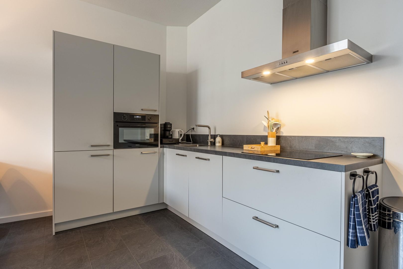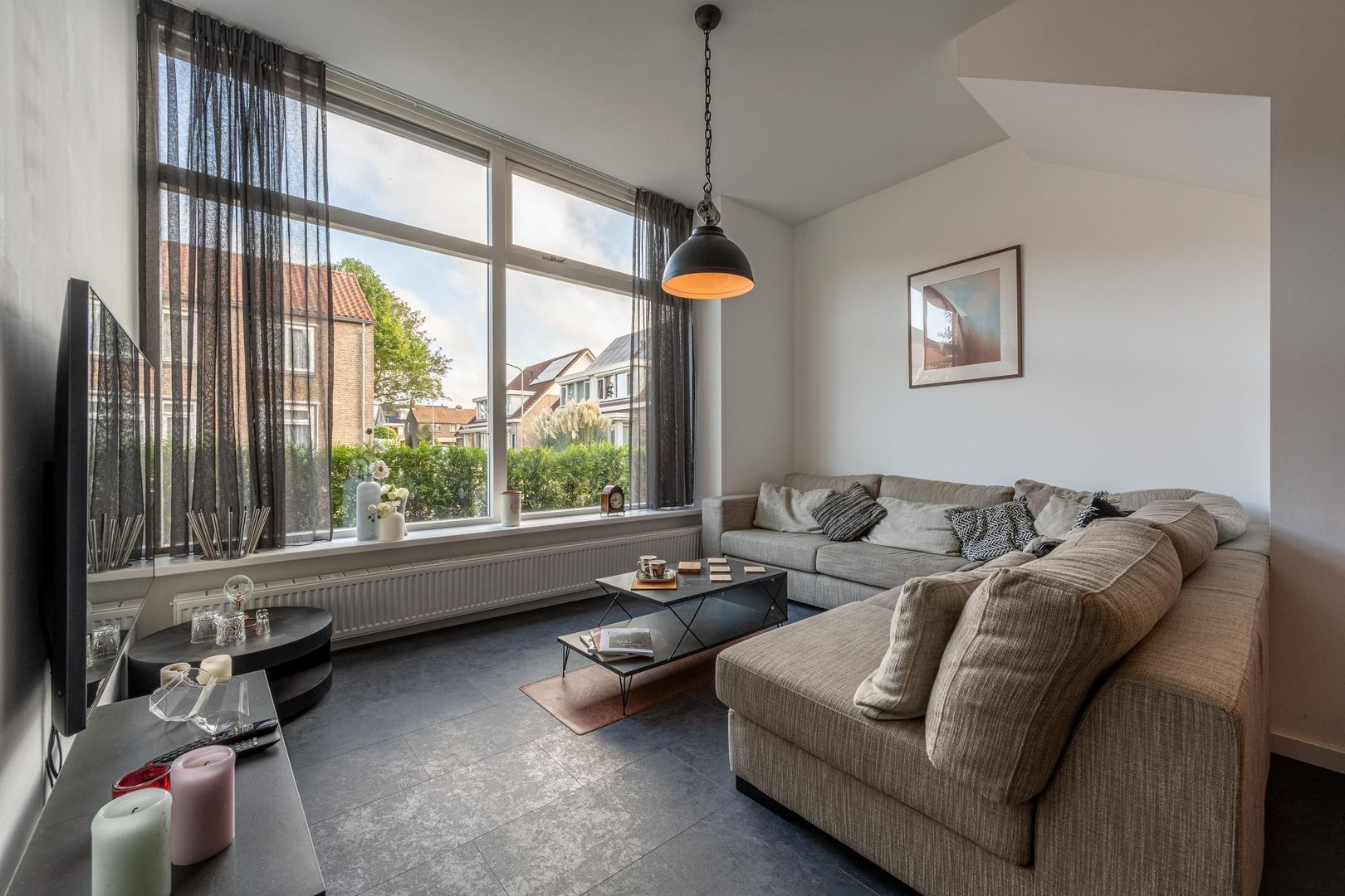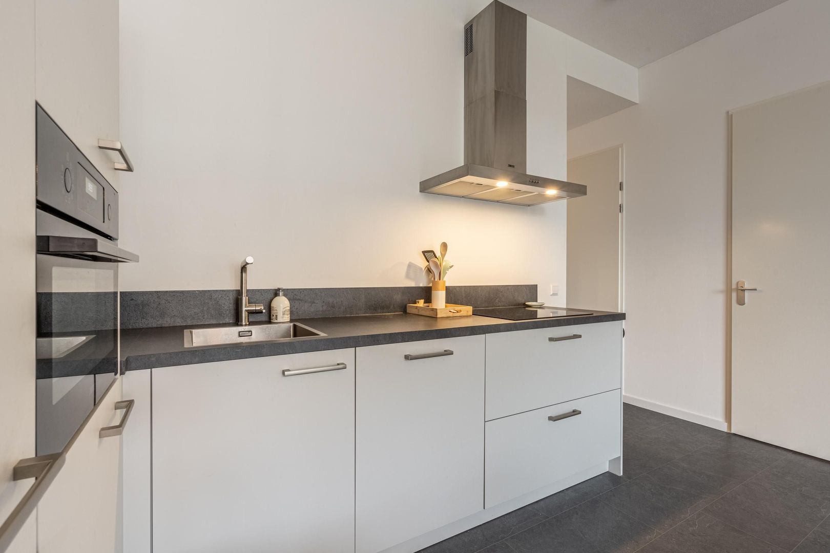 De gezellige woonkamer heeft een prettige lichtinval dankzij het grote raam aan de straatkant. De open keuken is voorzien van een eigentijdse hoekinrichting met inbouwapparatuur.