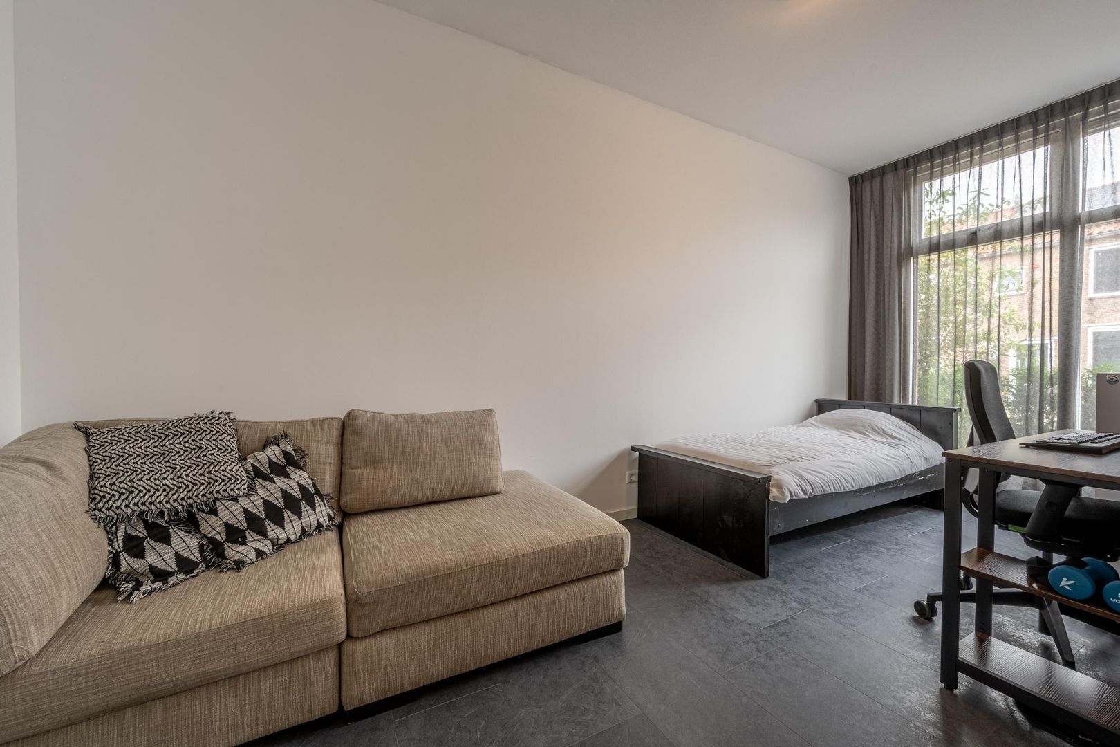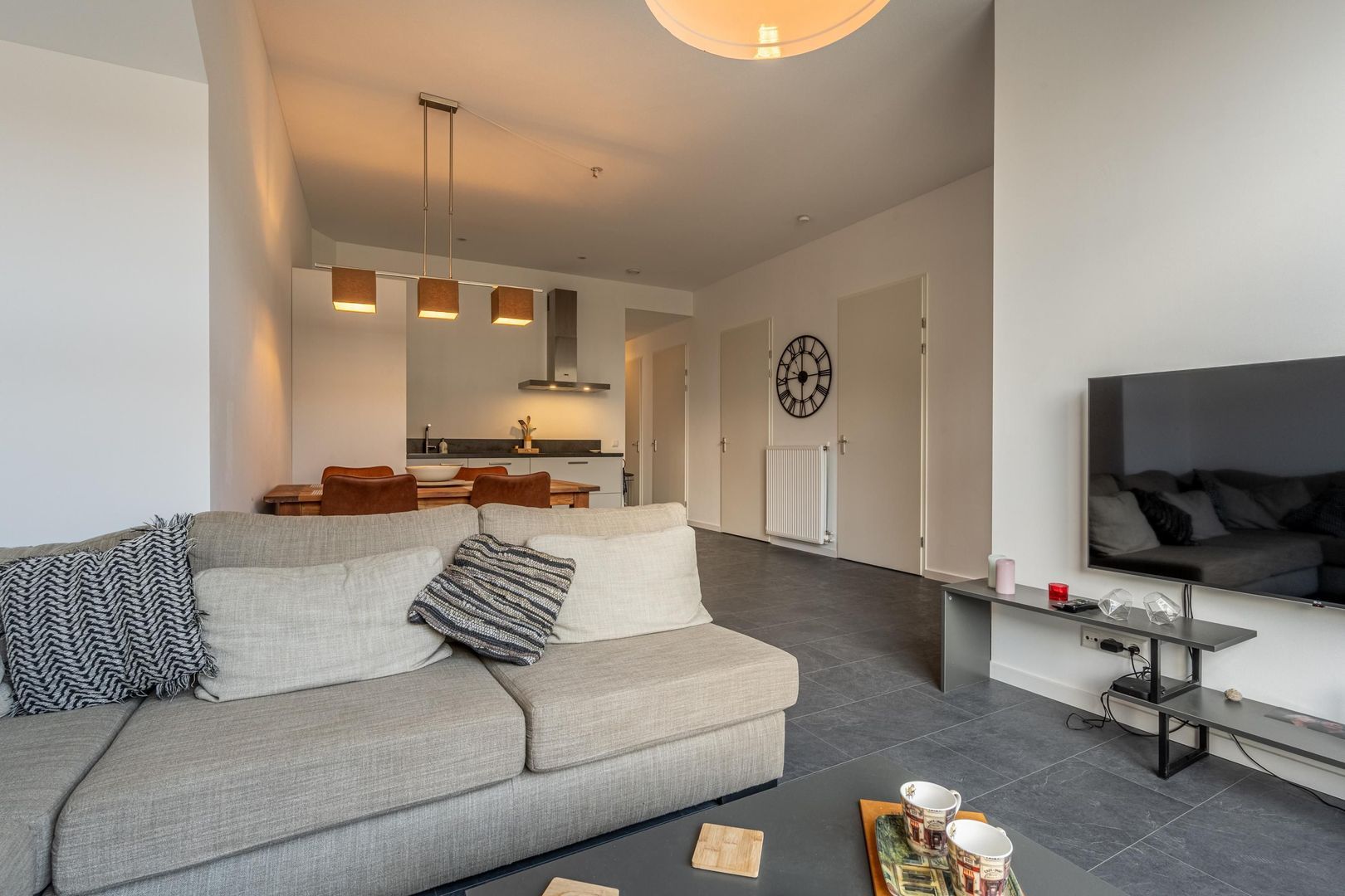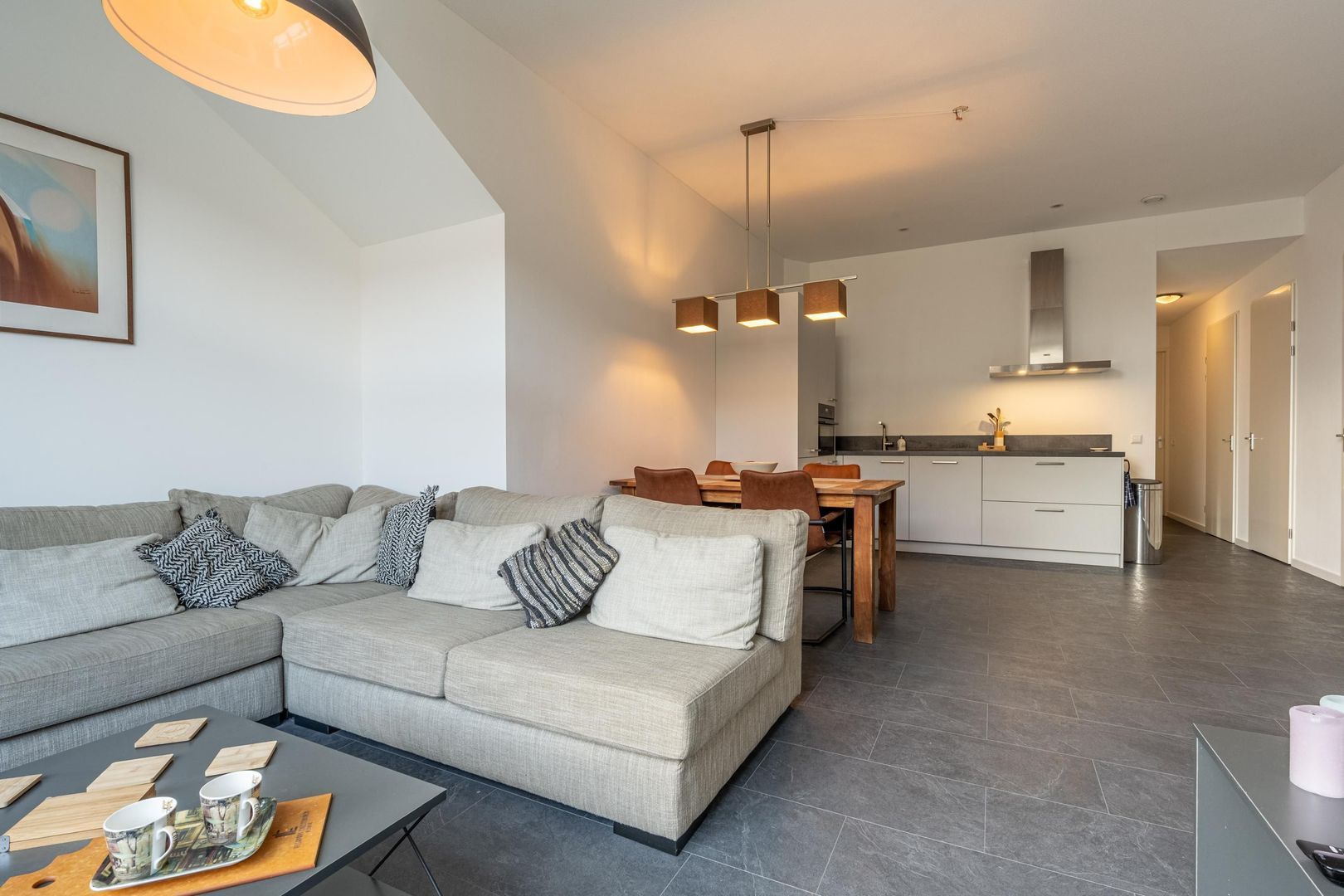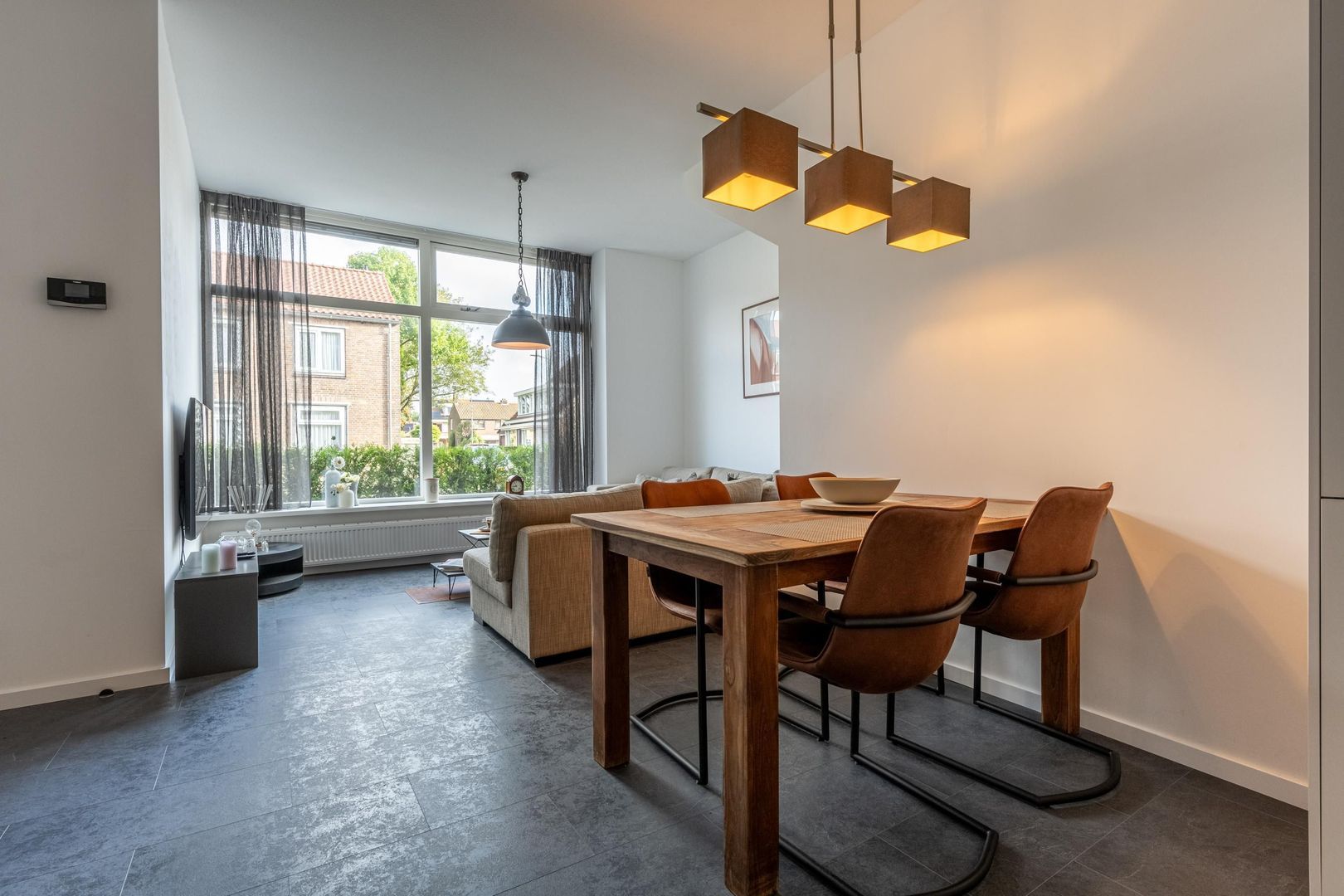 De gezellige woonkamer heeft een prettige lichtinval dankzij het grote raam aan de straatkant. De open keuken is voorzien van een eigentijdse hoekinrichting met inbouwapparatuur.