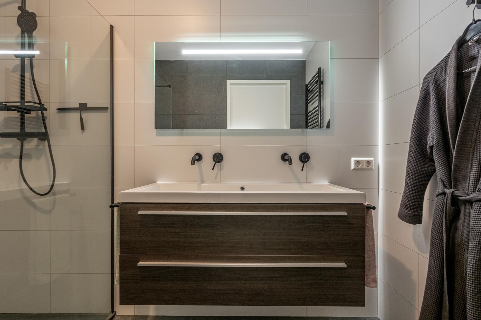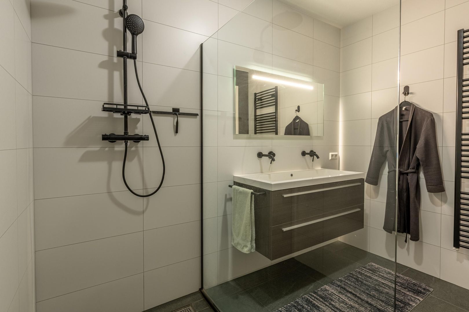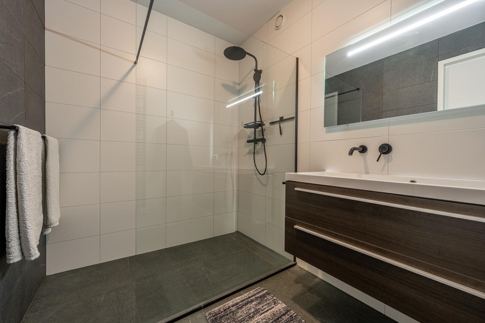 De moderne badkamer is een plaatje en voorzien van een groot wastafelmeubel met spiegel, in de wand weggewerkte kranen en een ruime inloopdouche.