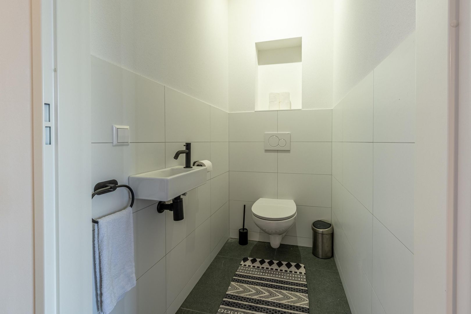 De aparte toiletruimte is ingericht met een wandcloset en een fonteinbakje.