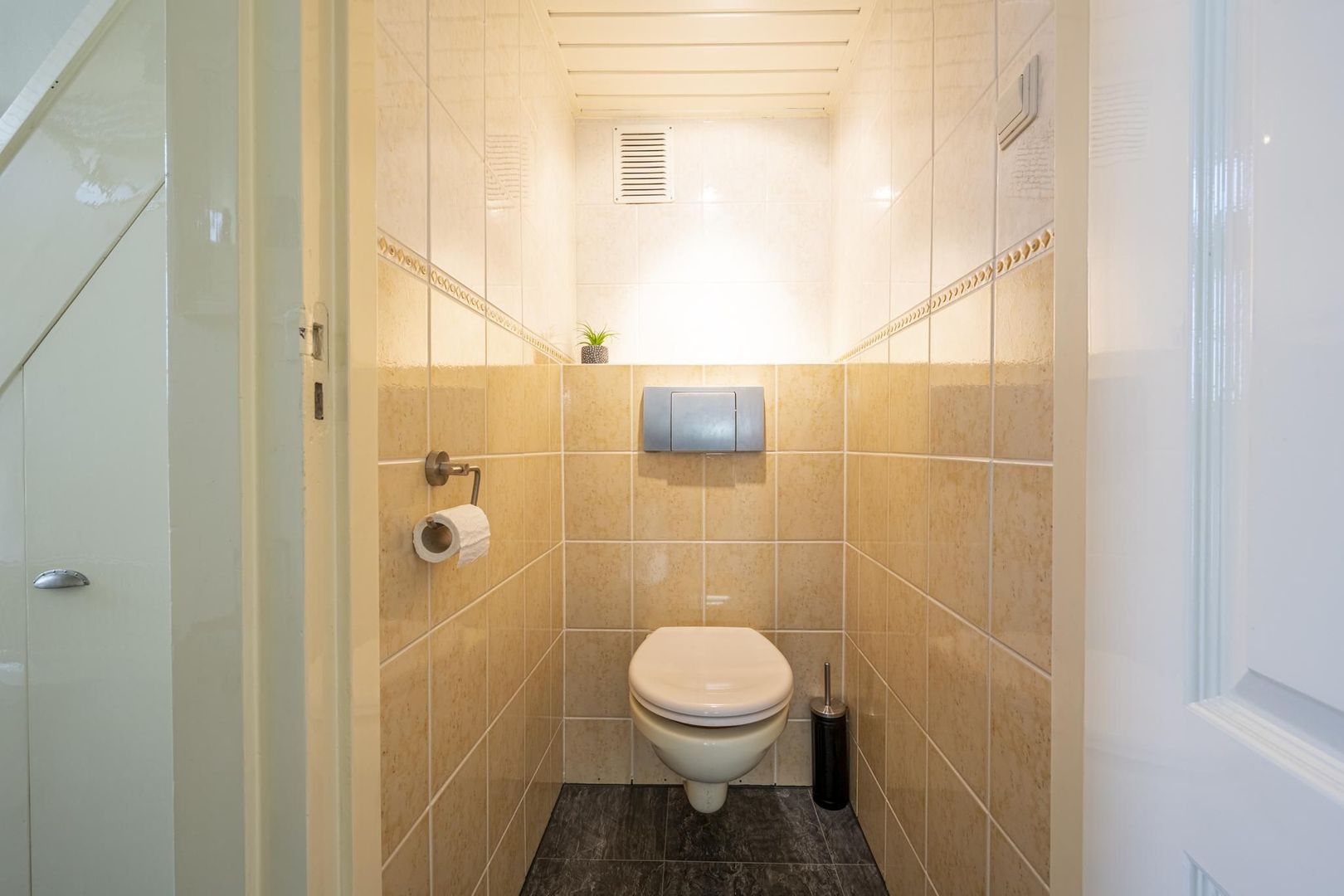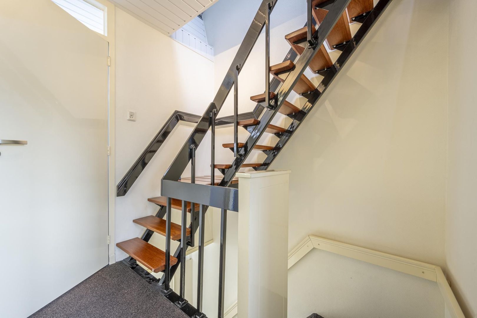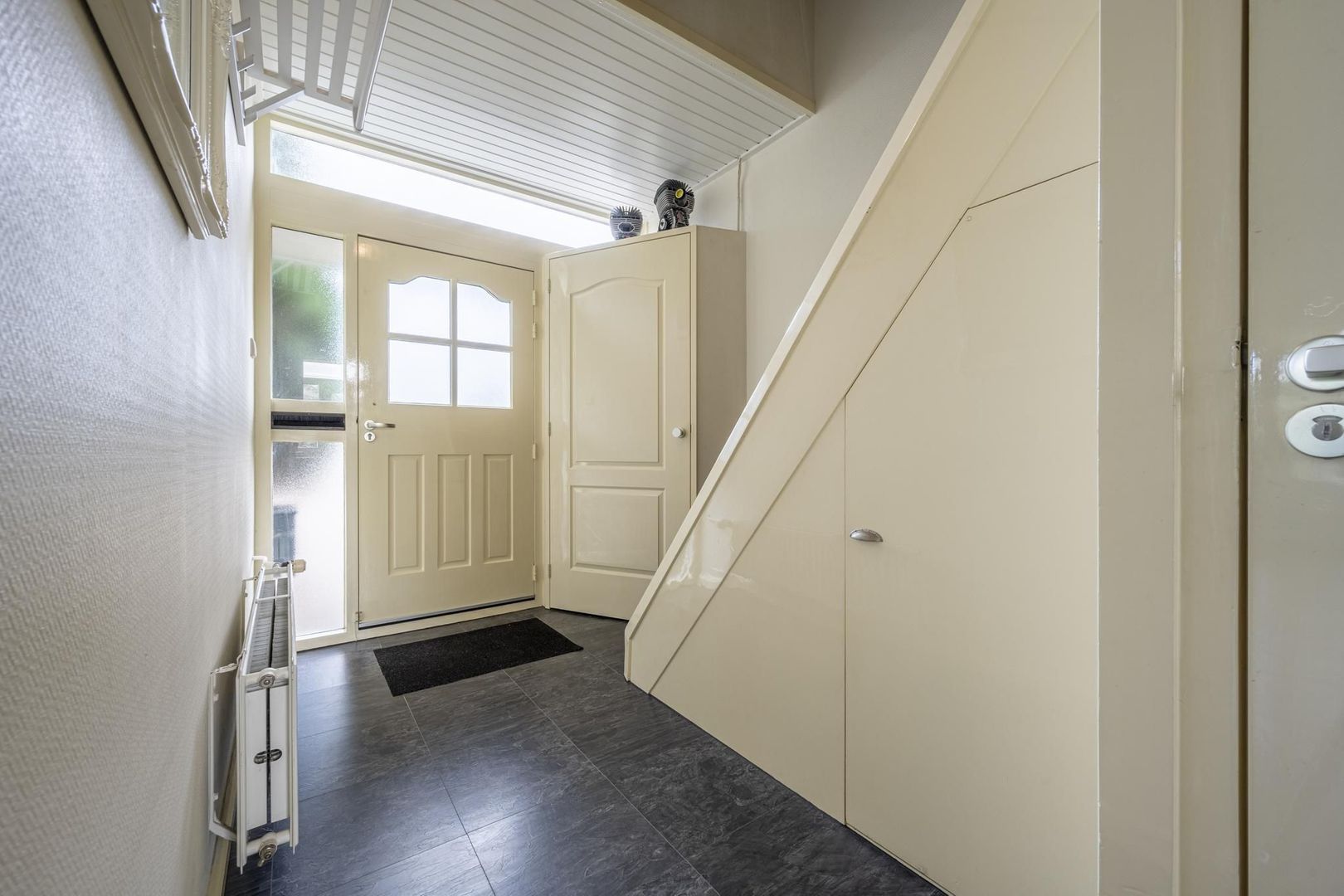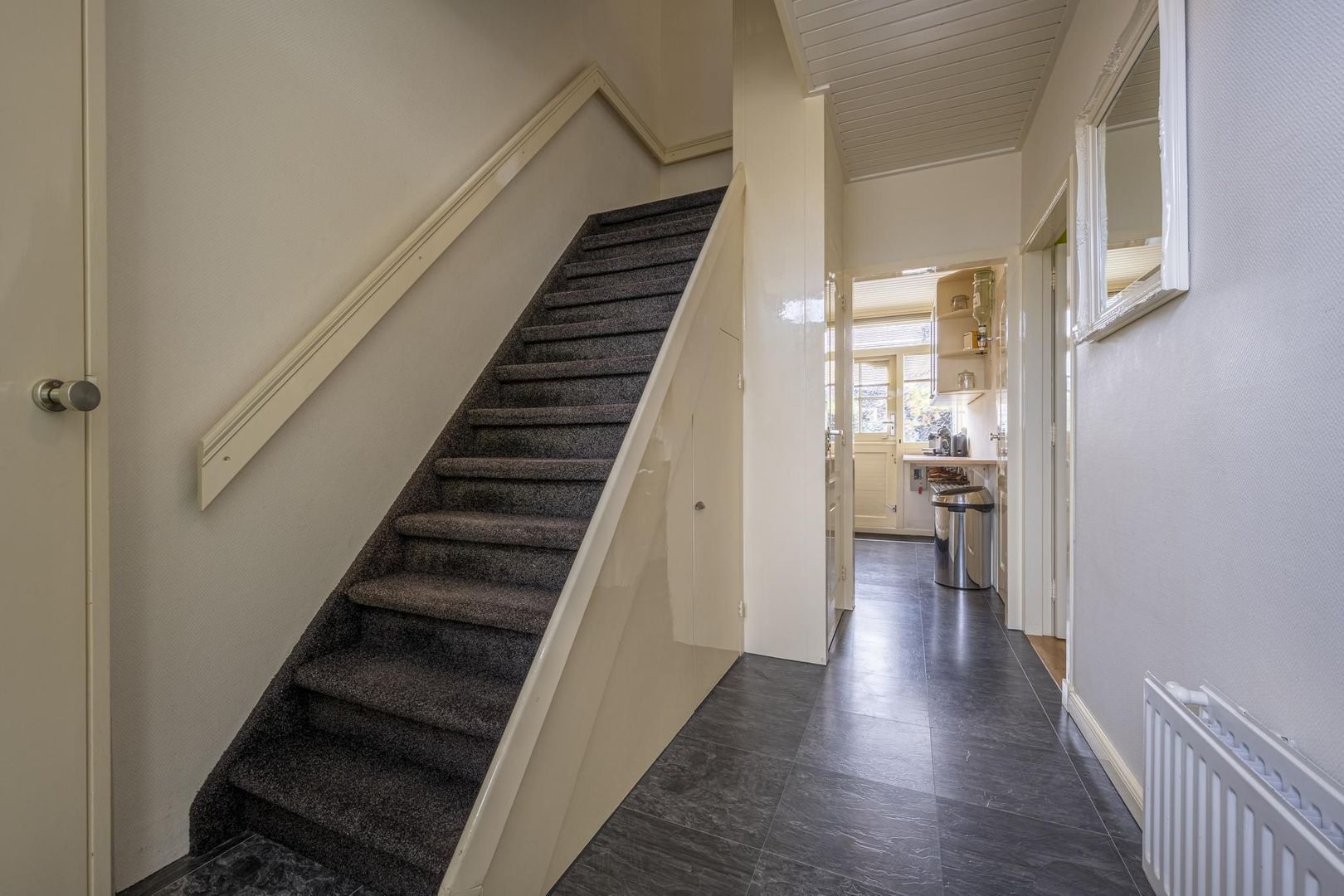 Entree/hal, meterkast, trapopgang met trapkast, toiletruimte en de gezellige woonkamer. Deze is voorzien van een eikenhouten lamelparketvloer.