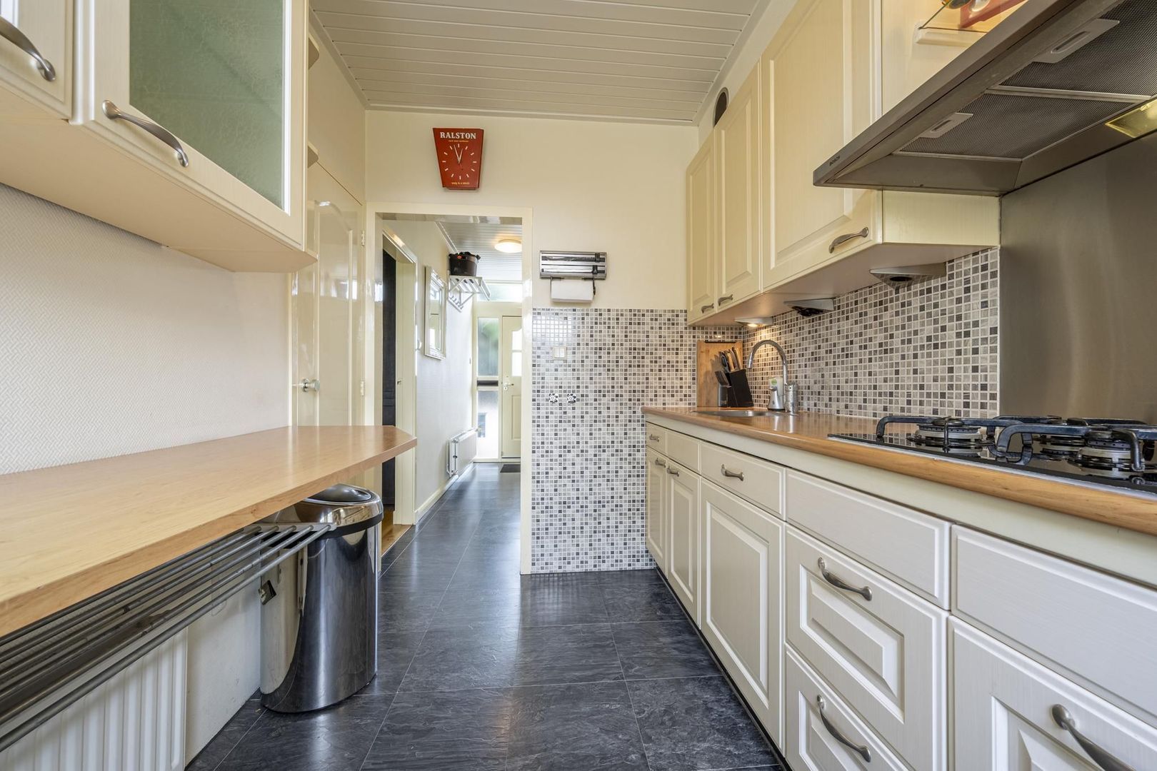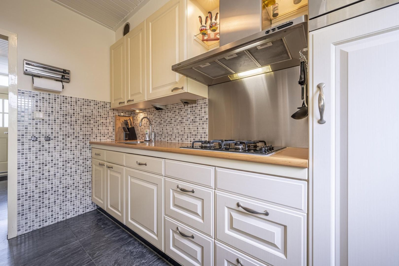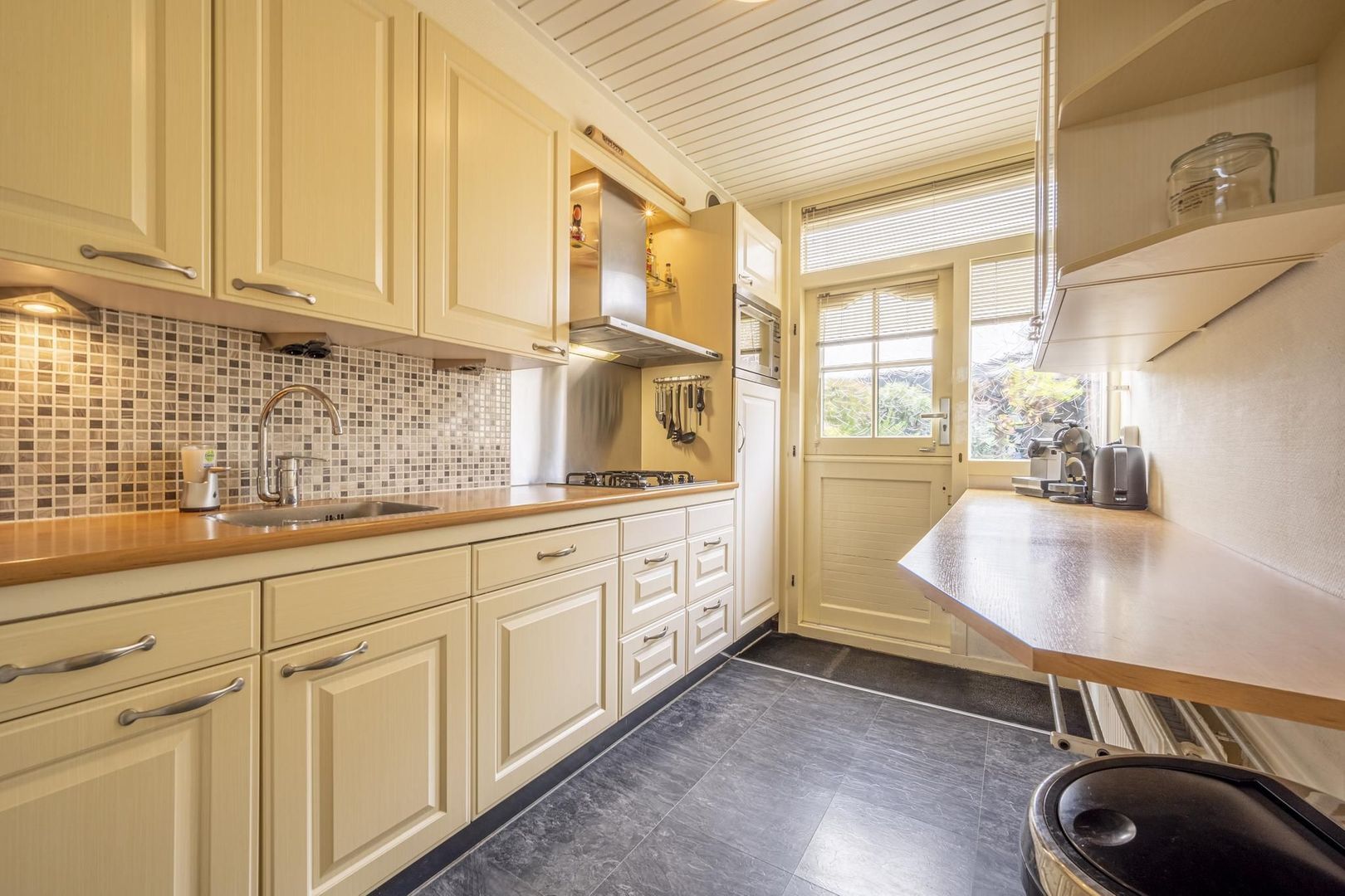 De keuken heeft een wandopstelling met diverse inbouwapparatuur, zoals een gaskookplaat, afzuigkap, vaatwasser, combi-magnetron en de koelkast. Een vaste kast zorgt voor nog meer bergruimte.