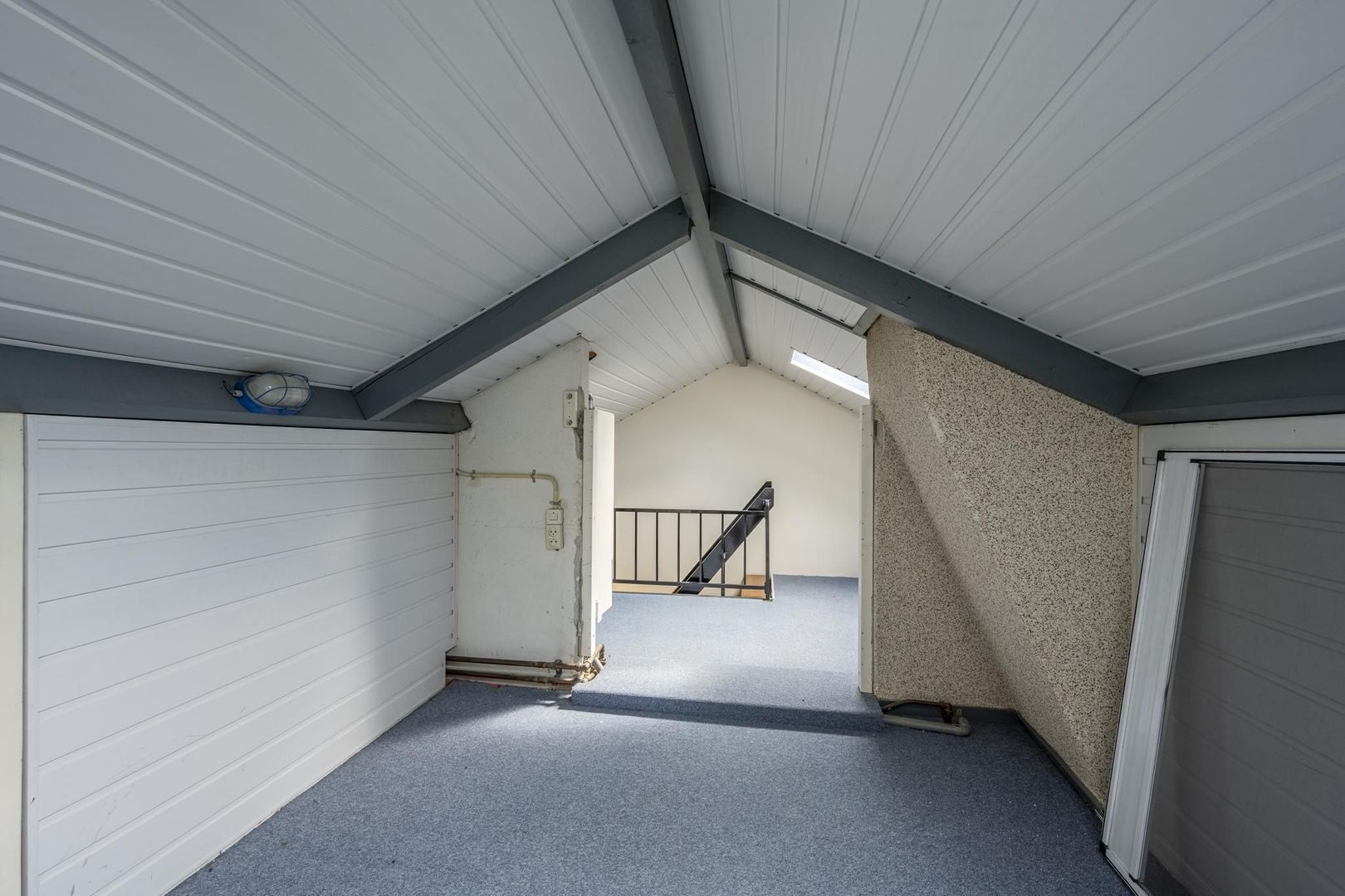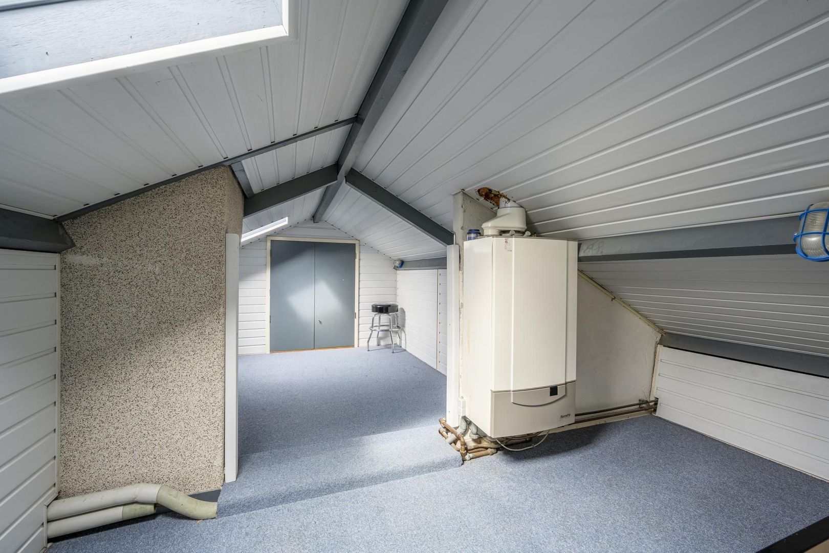 De tweede verdieping is met een vaste trap te bereiken. Deze heeft een stahoogte van circa 1.75 m. Door het plaatsen van een nokverhoging kunnen hier extra slaapkamers gemaakt worden. Nu dient de ruimte vooral als praktische bergruimte en de opstelplaats van de cv-ketel (Remeha 2006) bevindt zich hier. Er zijn twee dakramen.