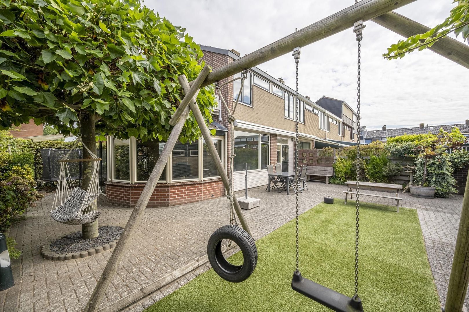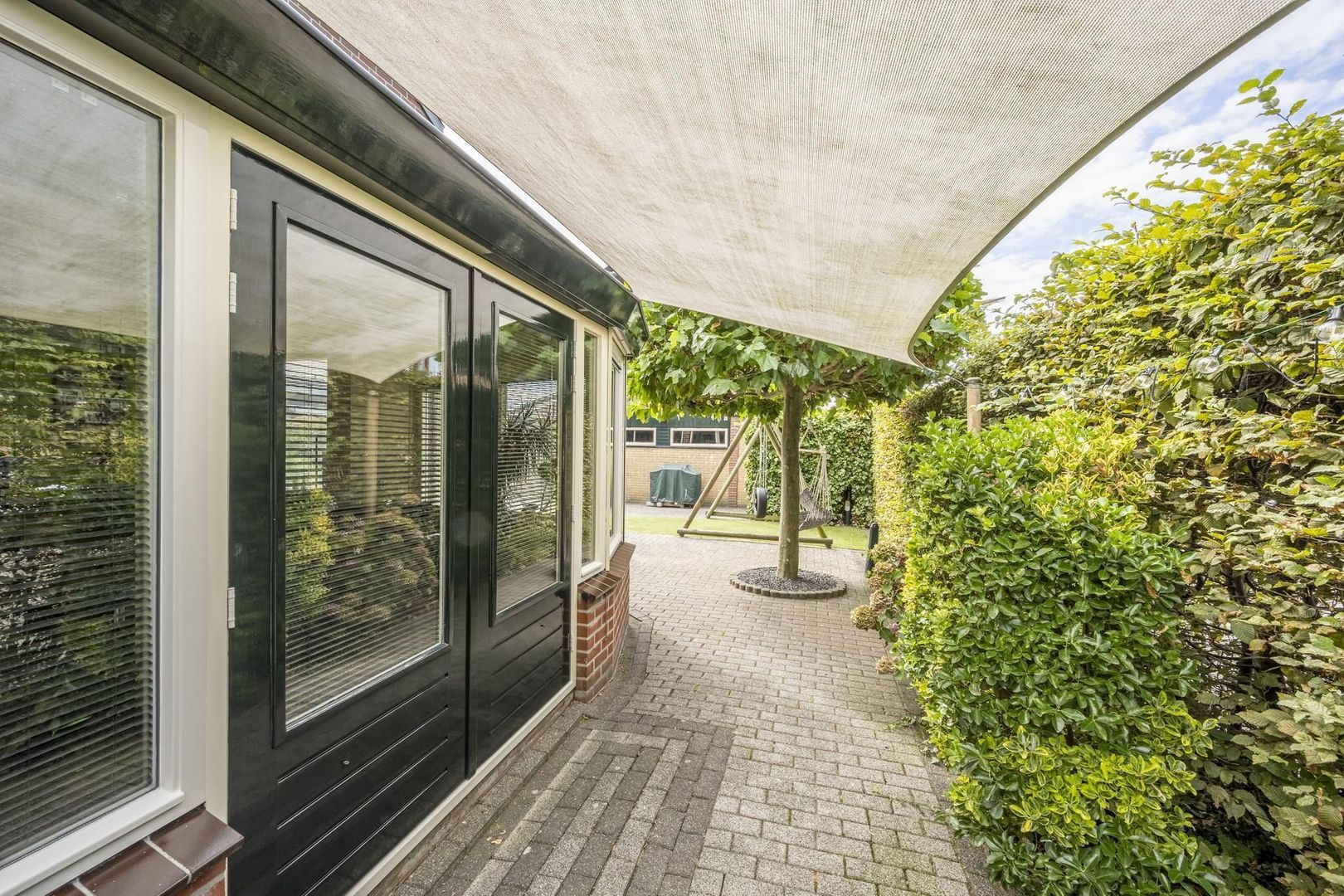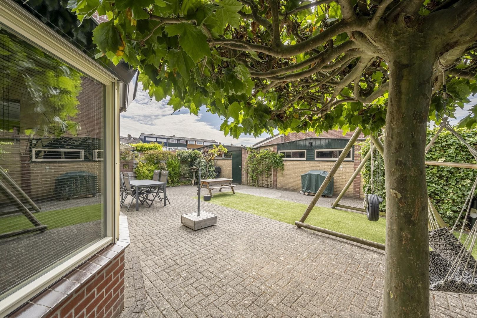De achtertuin ligt op het zonnige zuiden. Deze is lekker breed en biedt veel privacy. Achterin de tuin zijn de berging en garage te vinden. Hierin zijn de aansluitingen voor de wasapparatuur. De garagedeur is elektrisch.