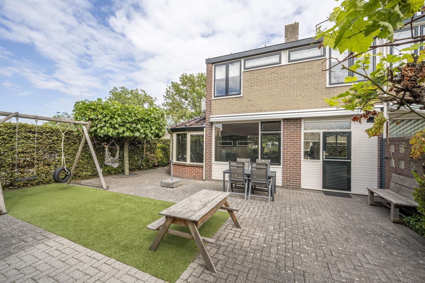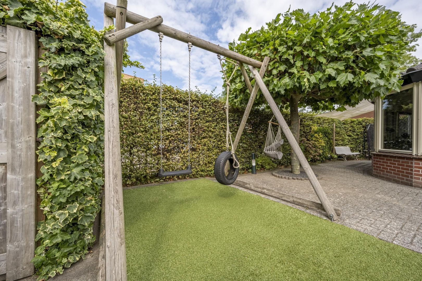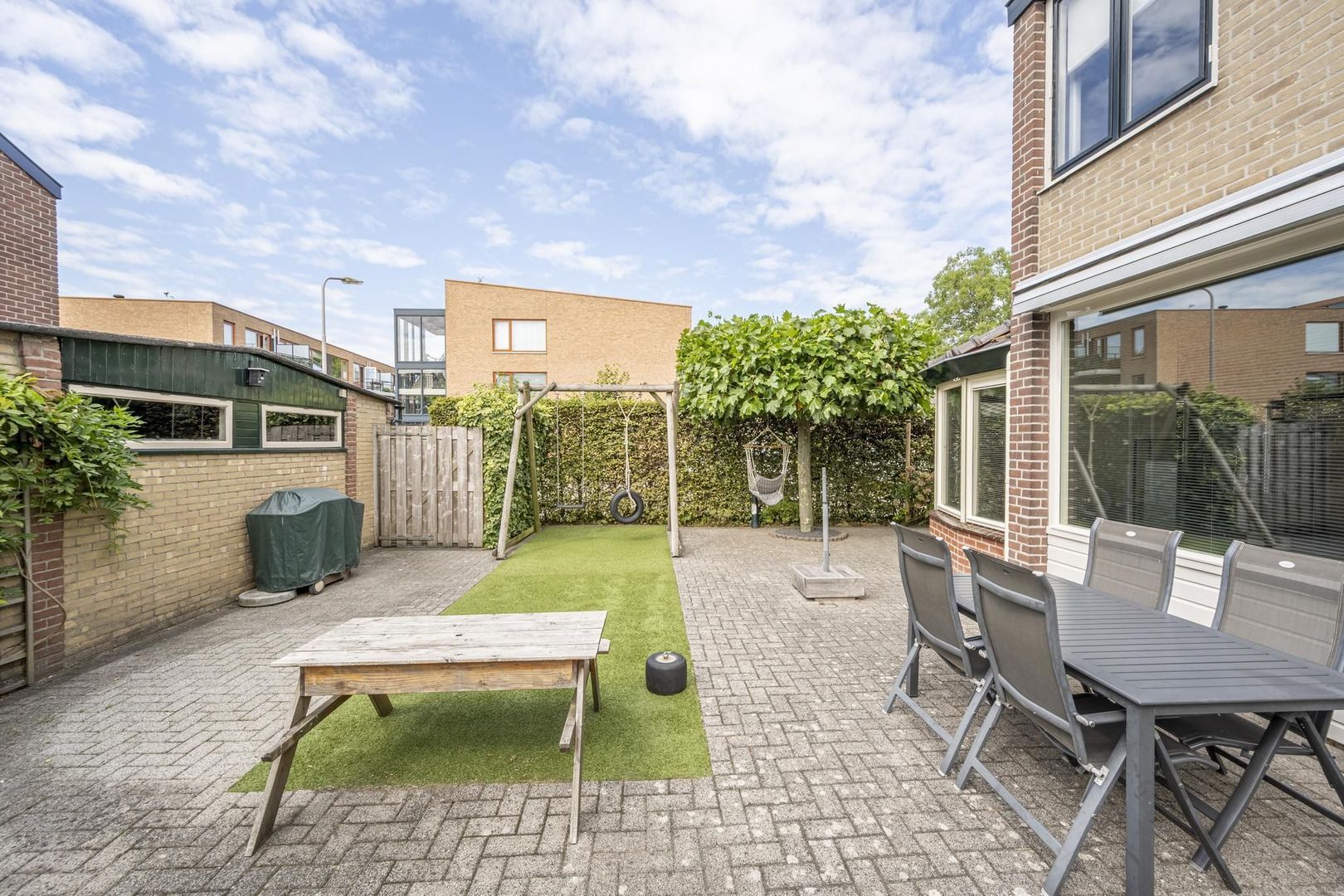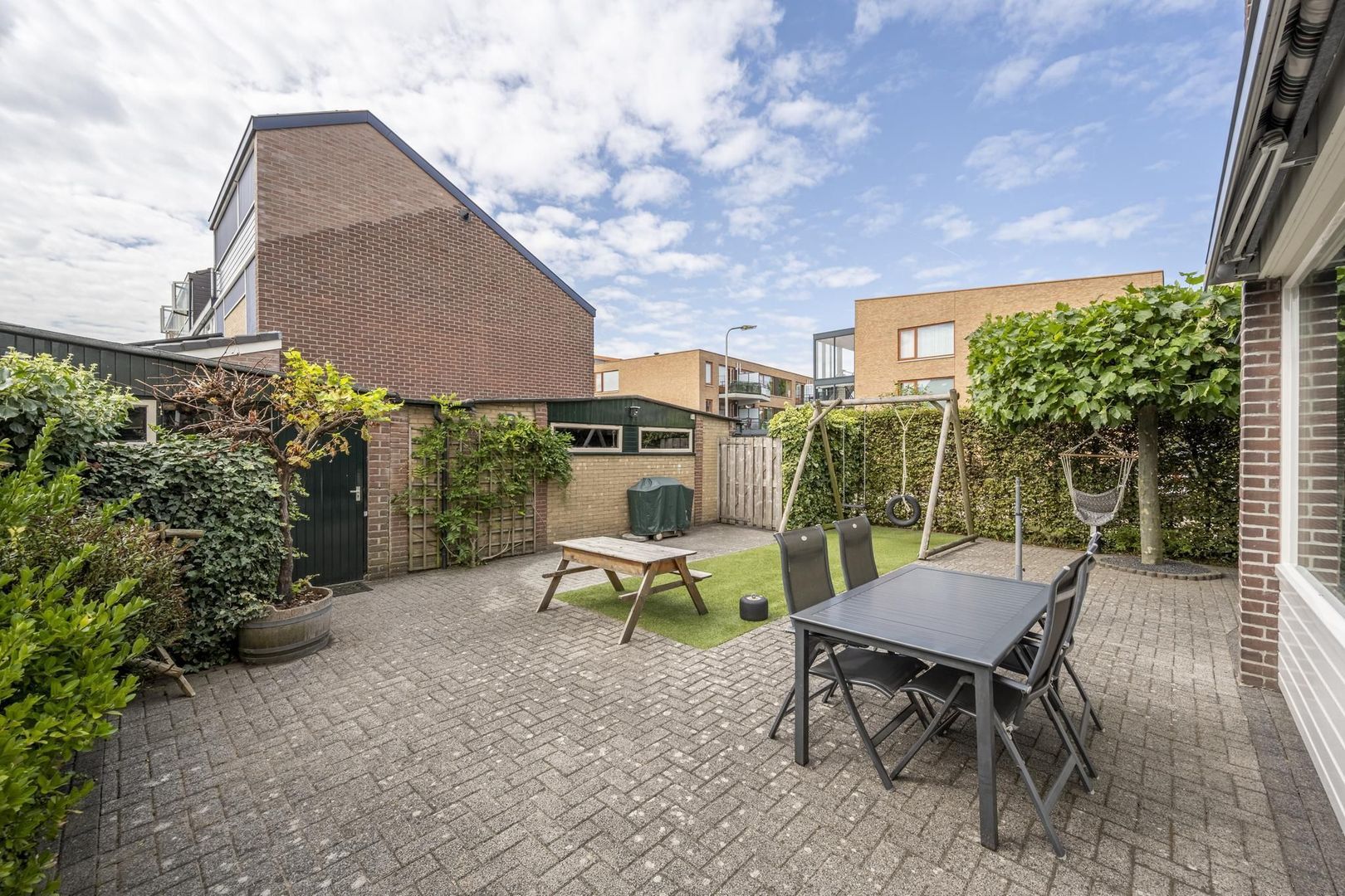 De achtertuin ligt op het zonnige zuiden. Deze is lekker breed en biedt veel privacy. Achterin de tuin zijn de berging en garage te vinden. Hierin zijn de aansluitingen voor de wasapparatuur. De garagedeur is elektrisch.