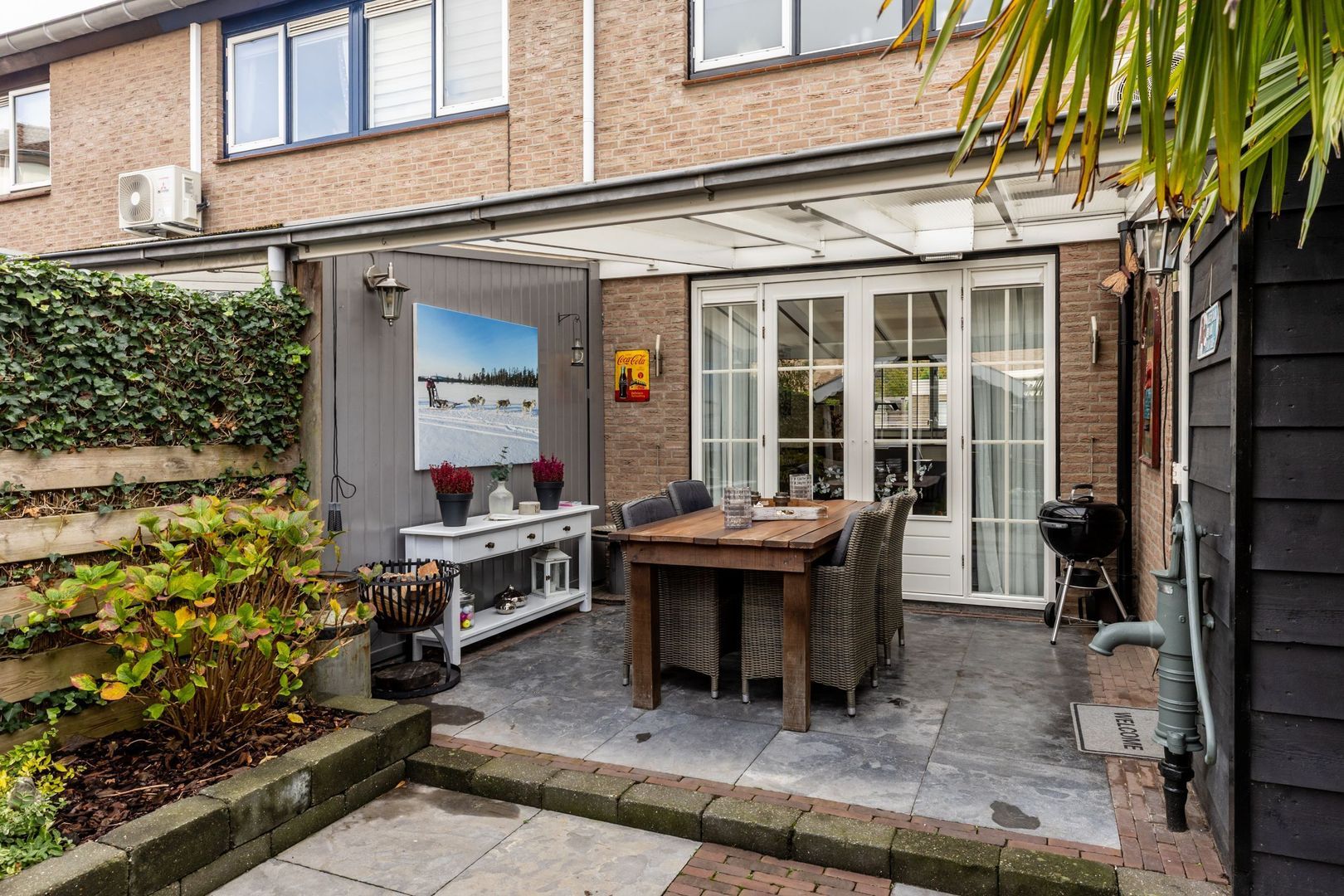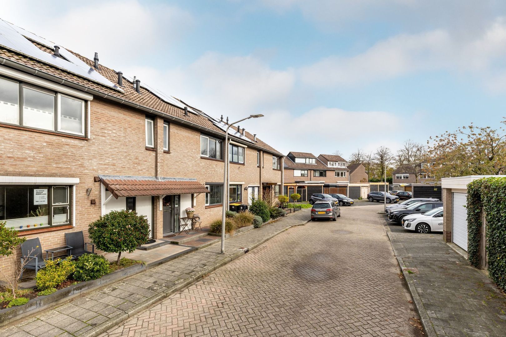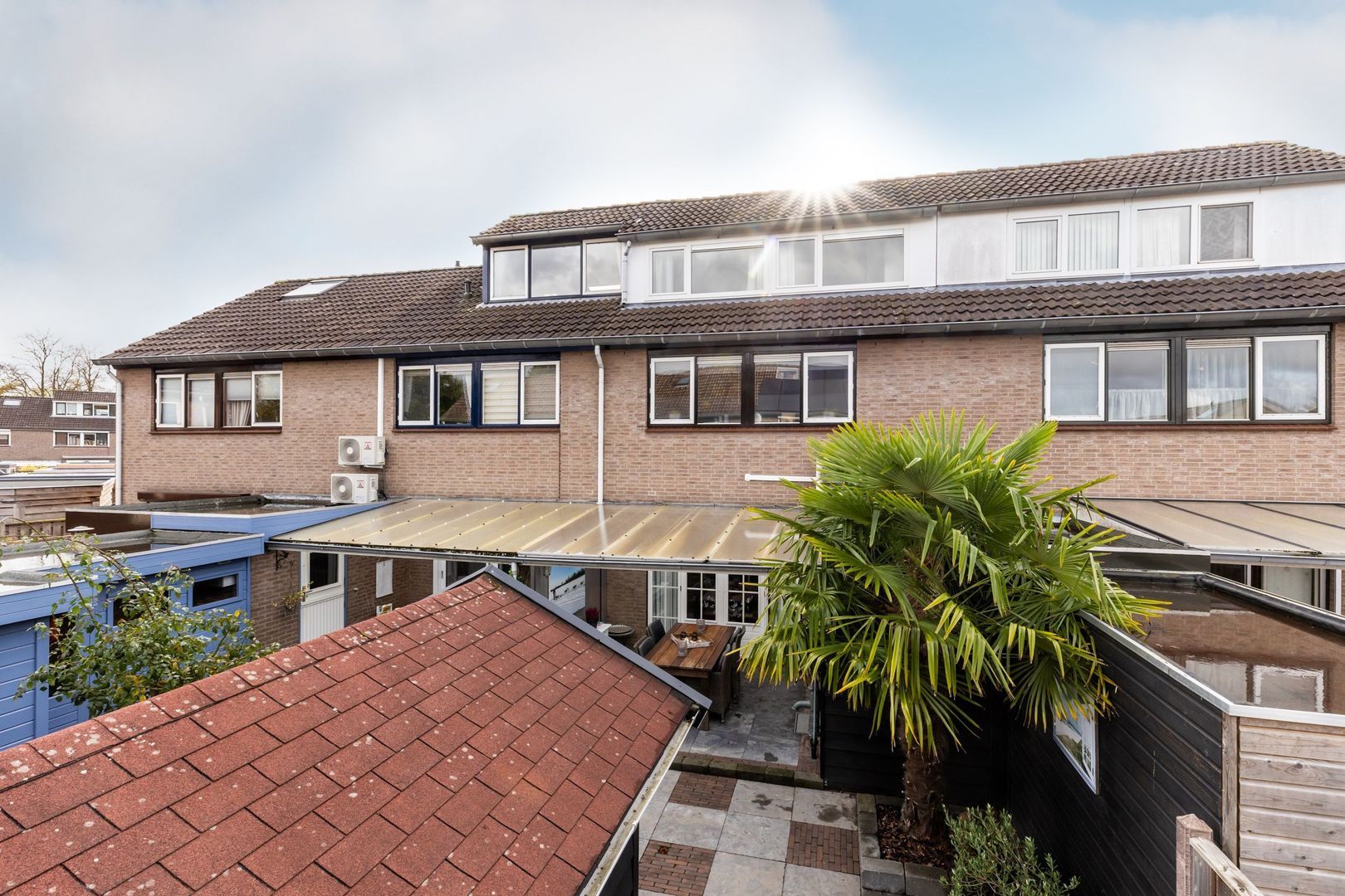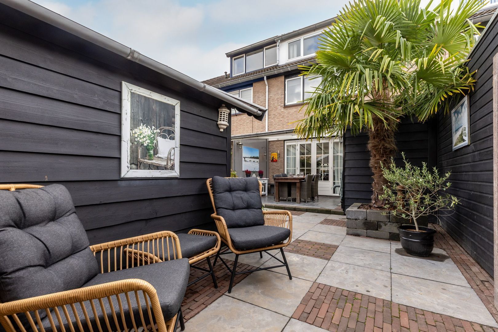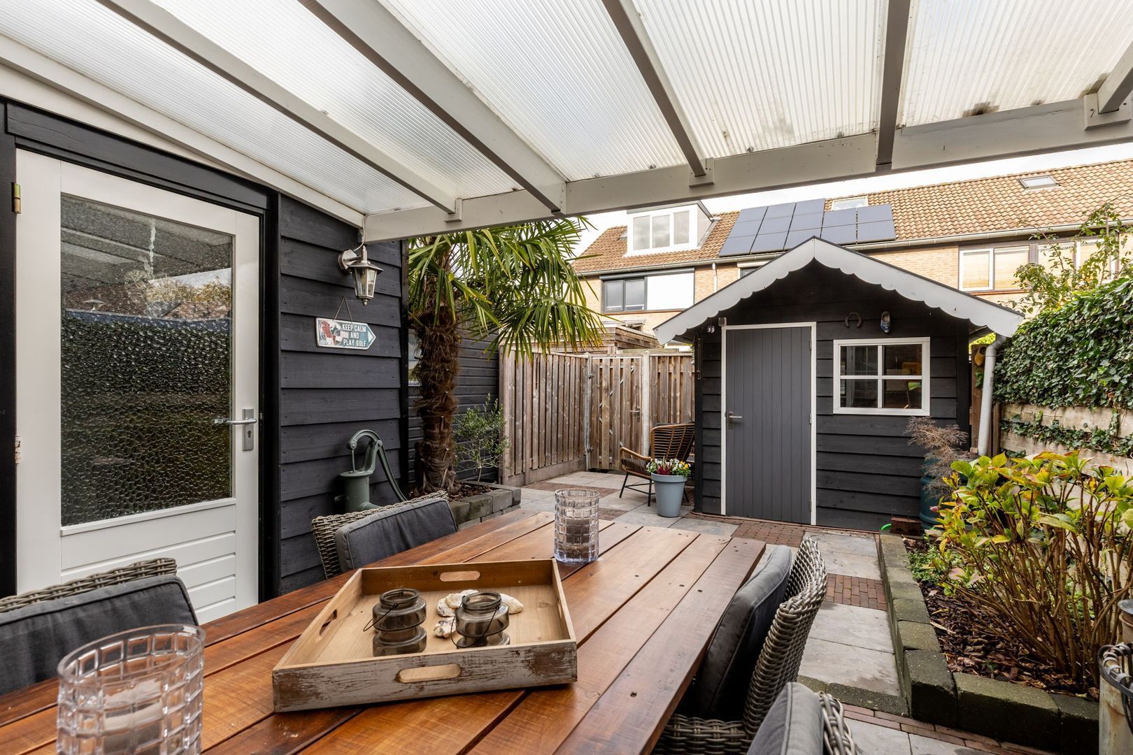 Modern afgewerkte tussenwoning met dakopbouw, gezellige overkapping en houten berging in de tuin.