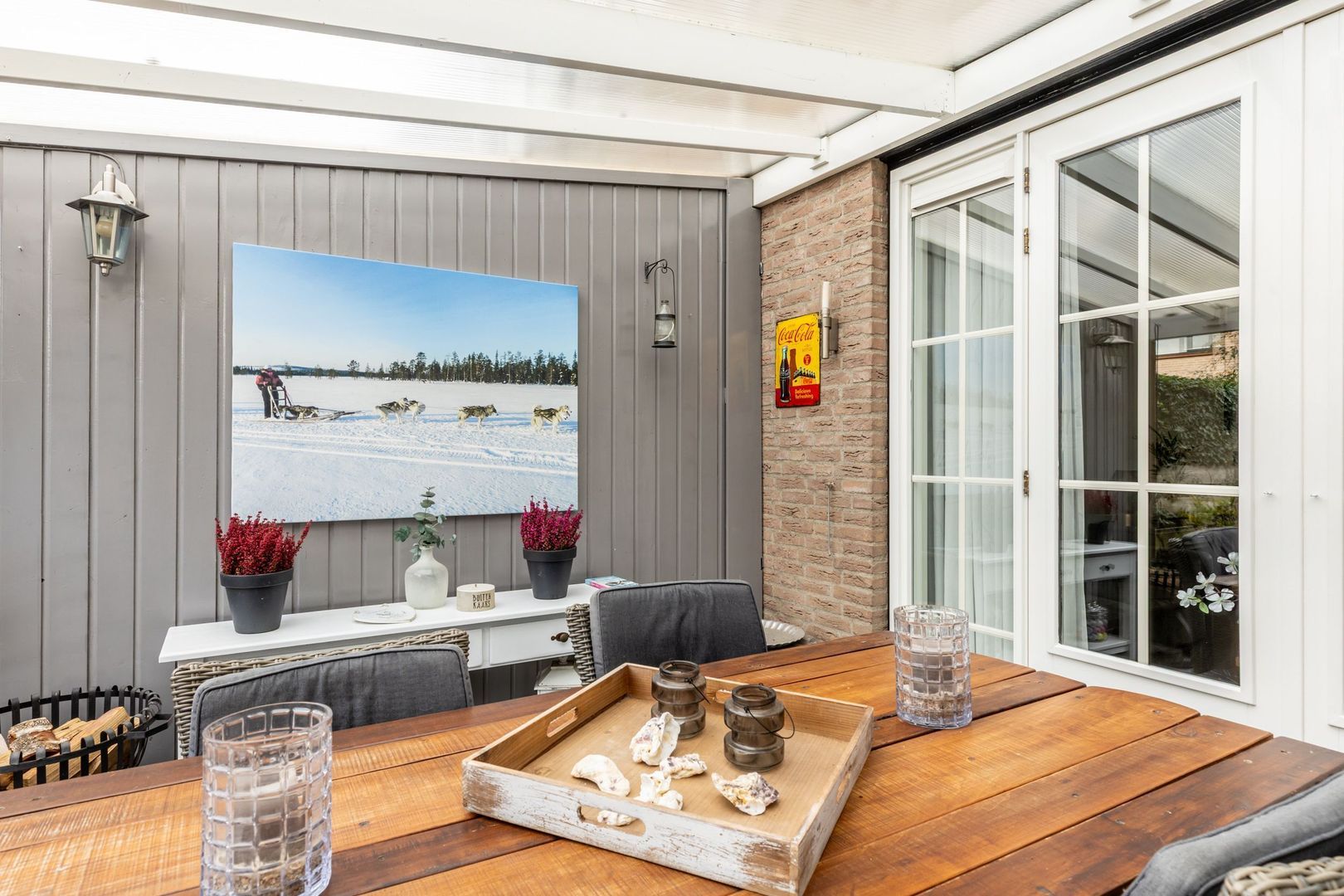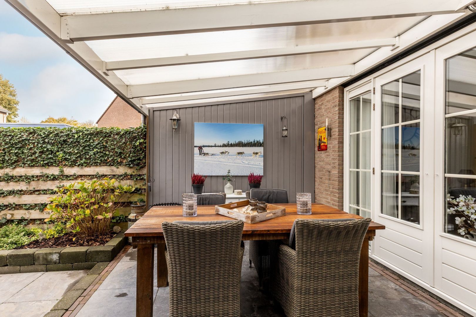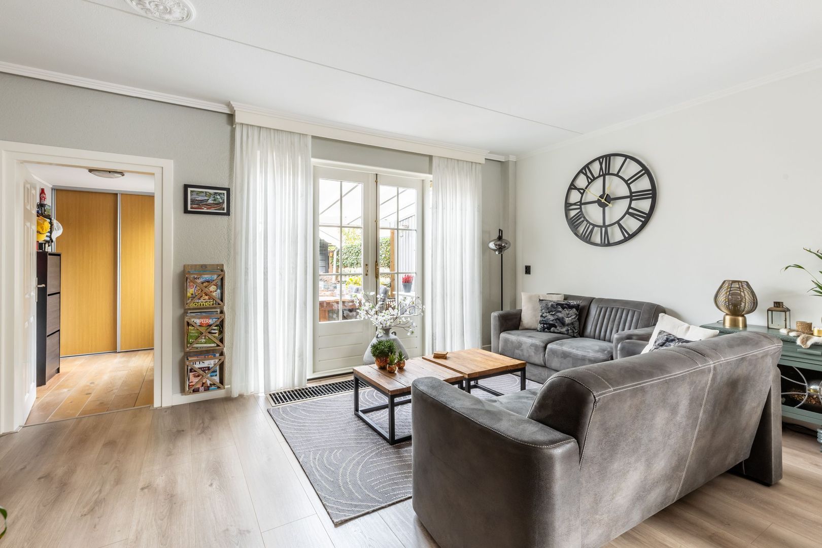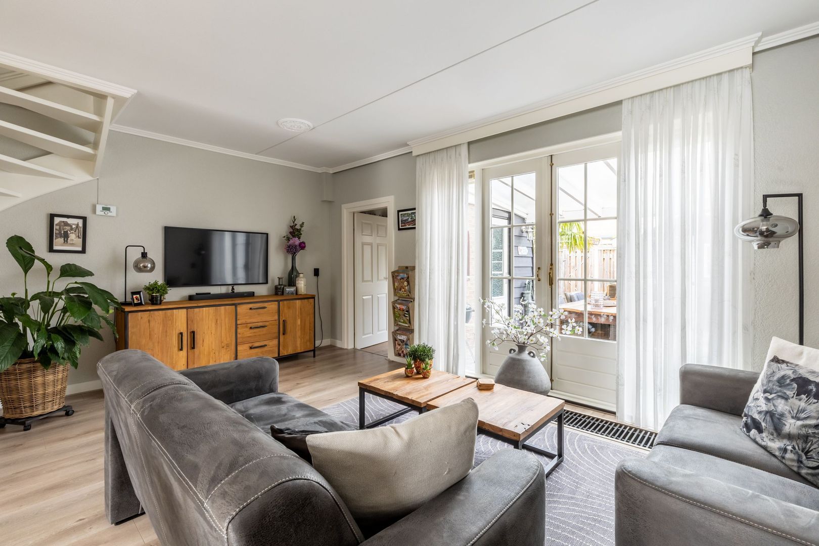 Tuingerichte woonkamer met openslaande deuren naar het terras en deur naar de praktische achterhal/bijkeuken.