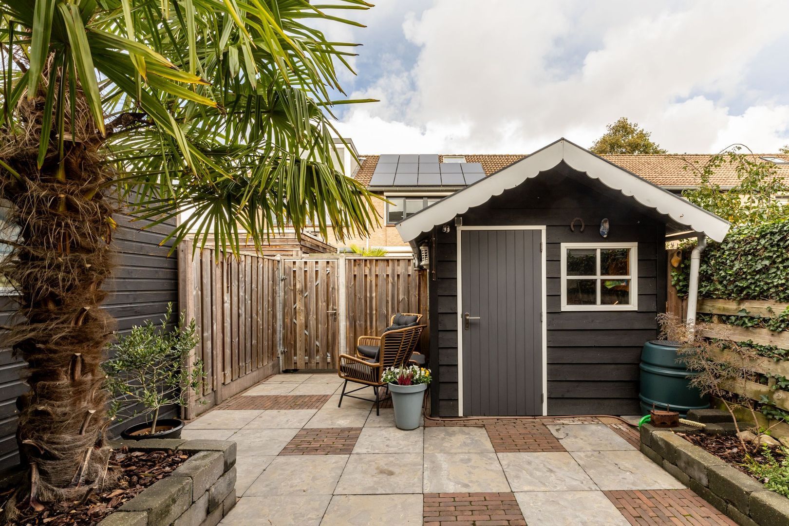 De achtertuin is onderhoudsvriendelijk ingericht. Achterin staat een ruime houten berging.