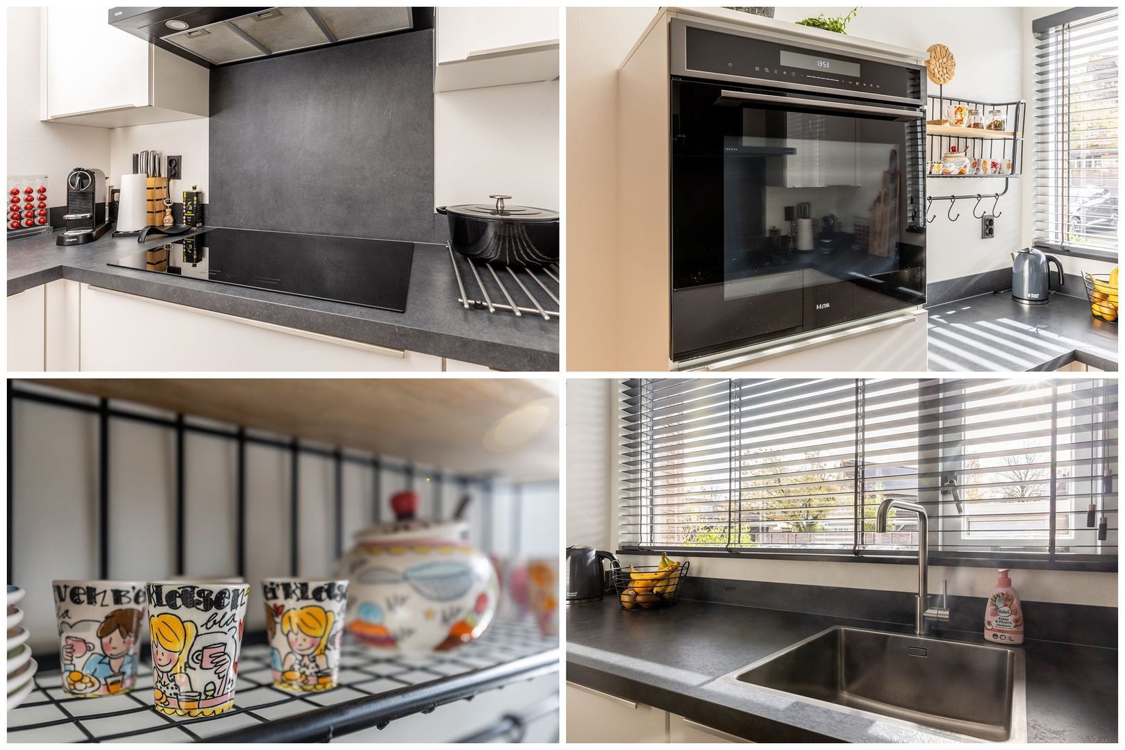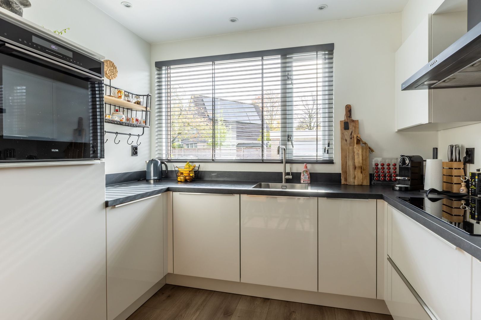 De open keuken ligt aan de straatkant. Deze heeft een U-vormige inrichting in een eigentijdse lichte kleurstelling met een donker aanrechtblad. Uiteraard is deze voorzien van inbouwapparatuur.