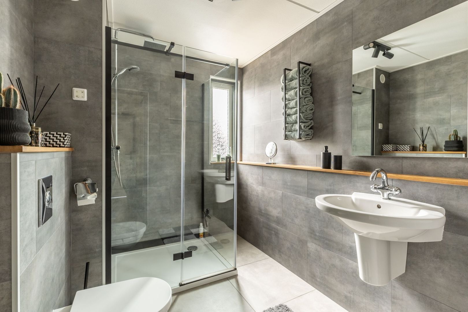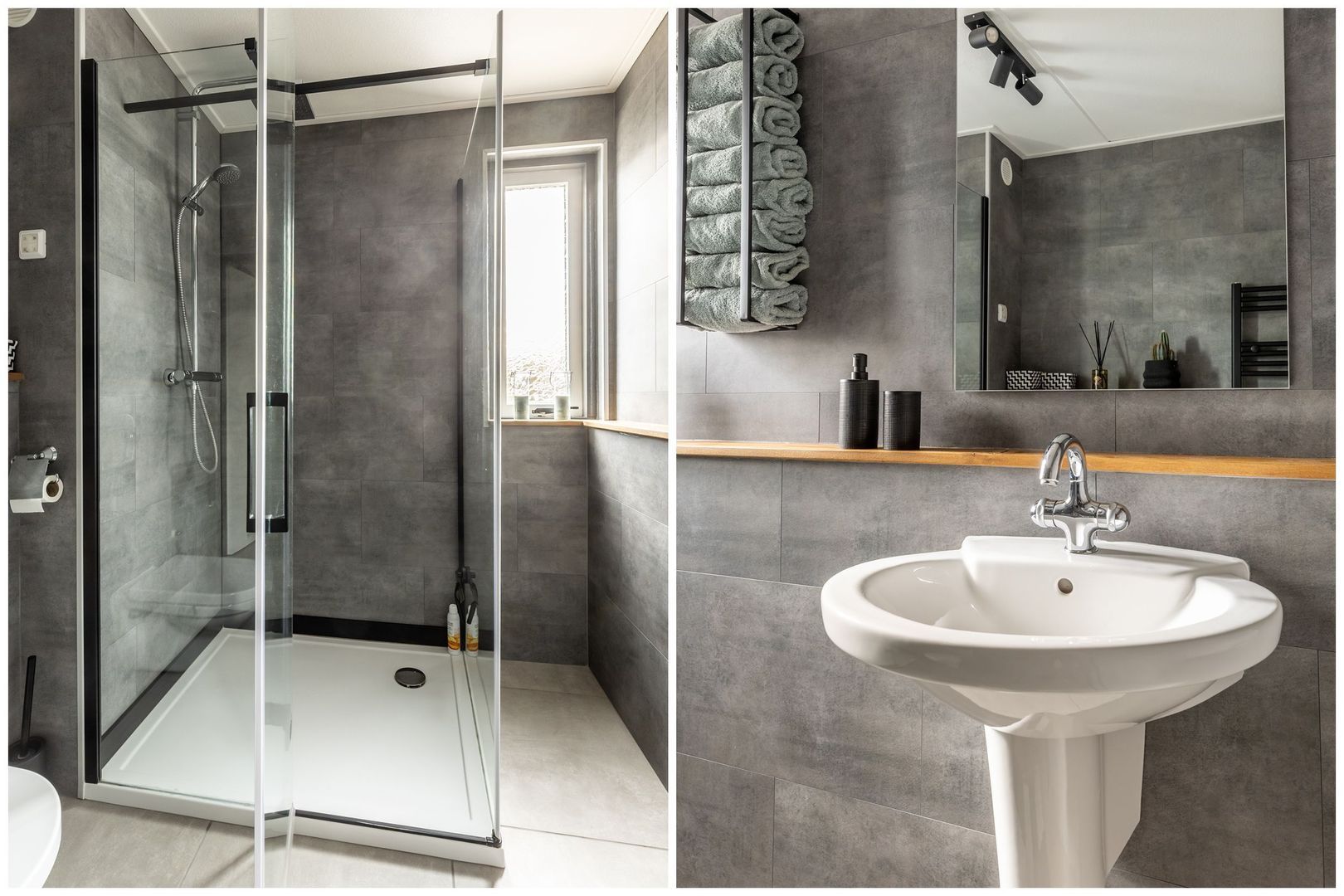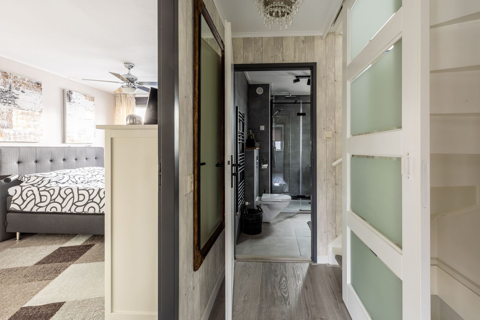 Op de eerste verdieping zijn twee (voorheen drie) ruime slaapkamers en een mooie badkamer. Deze is ingericht met een inloopdouche, een wastafel en een tweede toilet. Grote grijze wandtegels geven het geheel een luxe uitstraling.