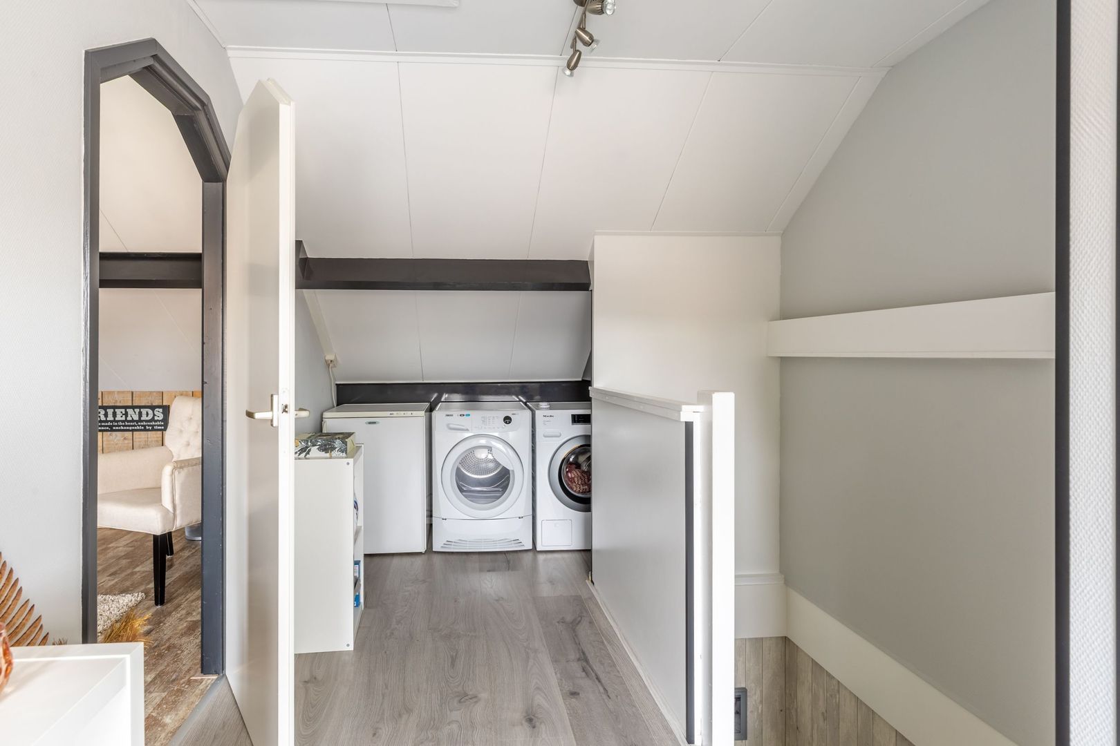 Hierboven bevindt zich nog een vliering; praktische opbergruimte.