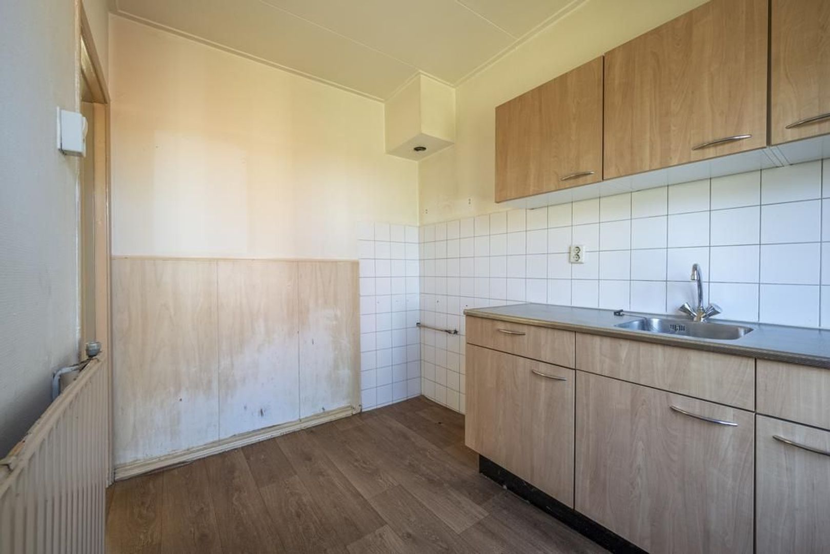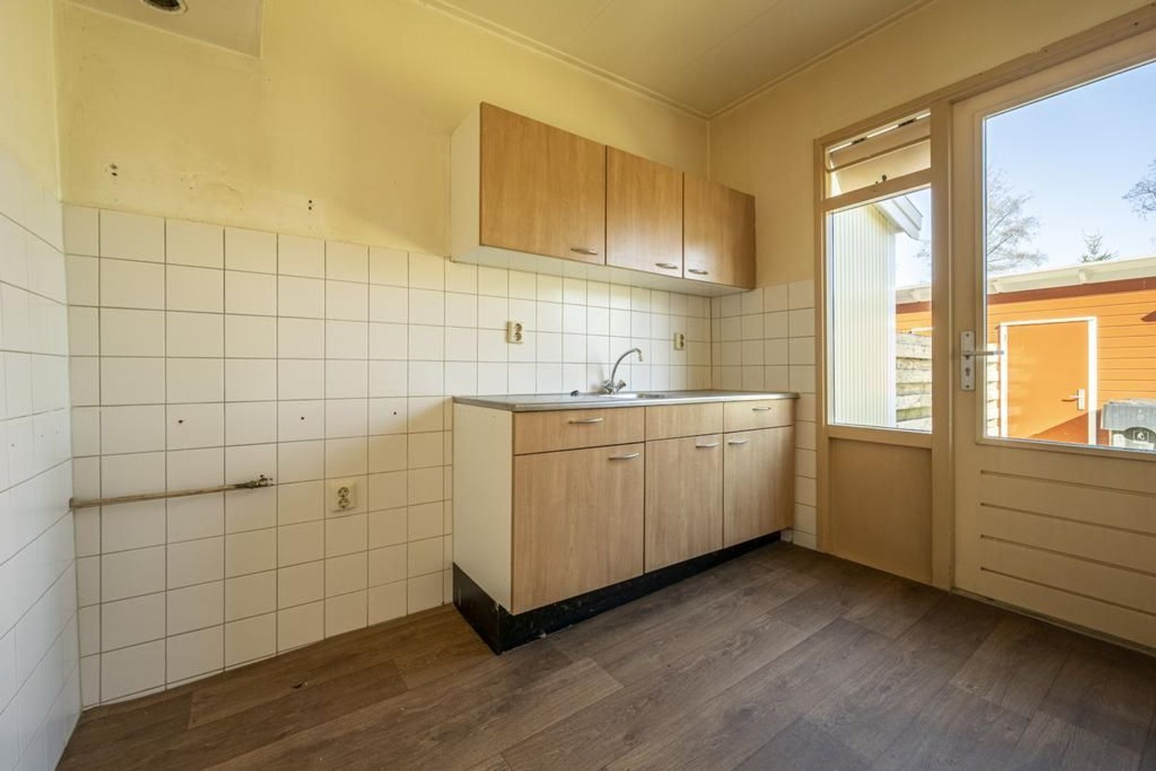 De dichte keuken is voorzien van een eenvoudige wandopstelling.