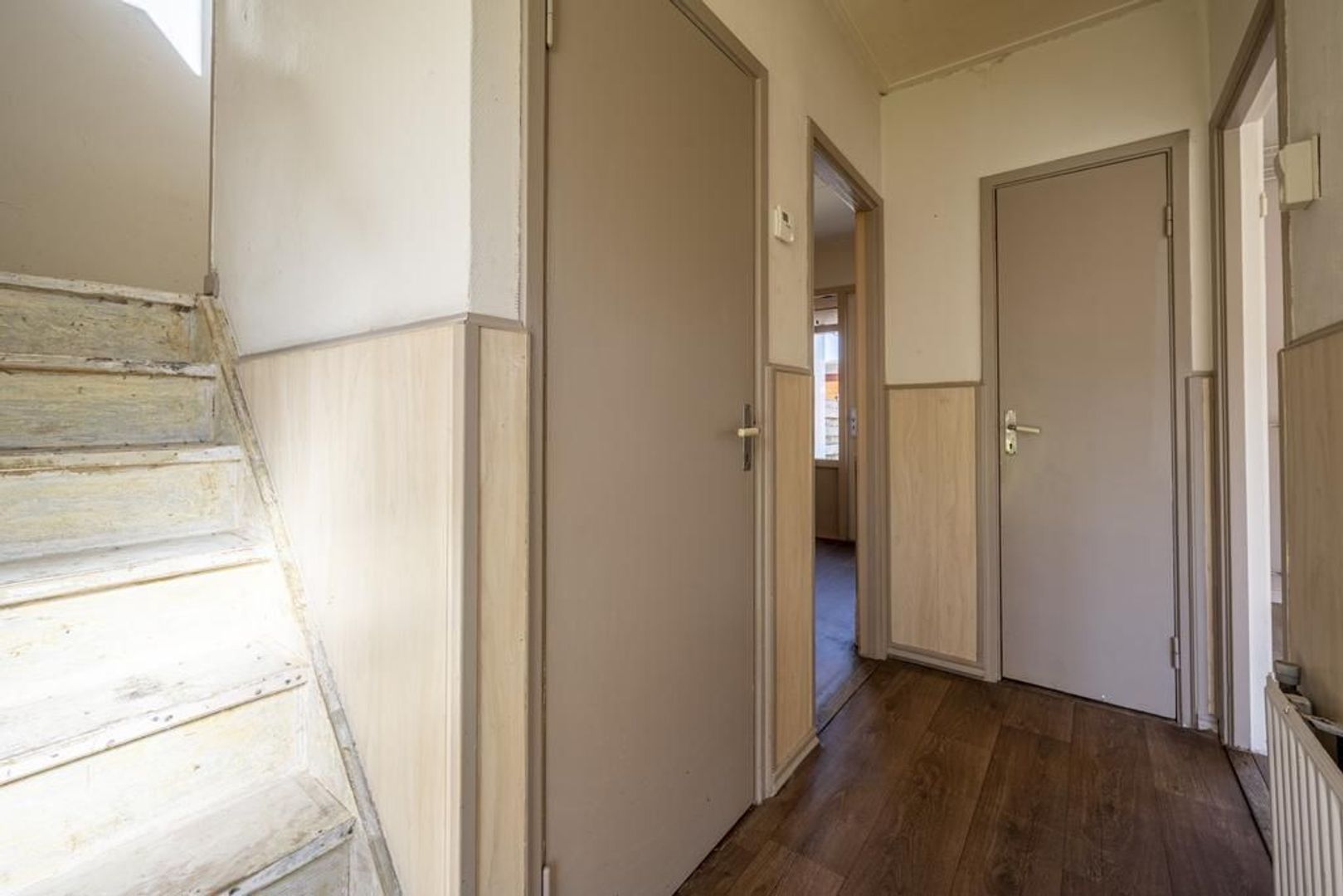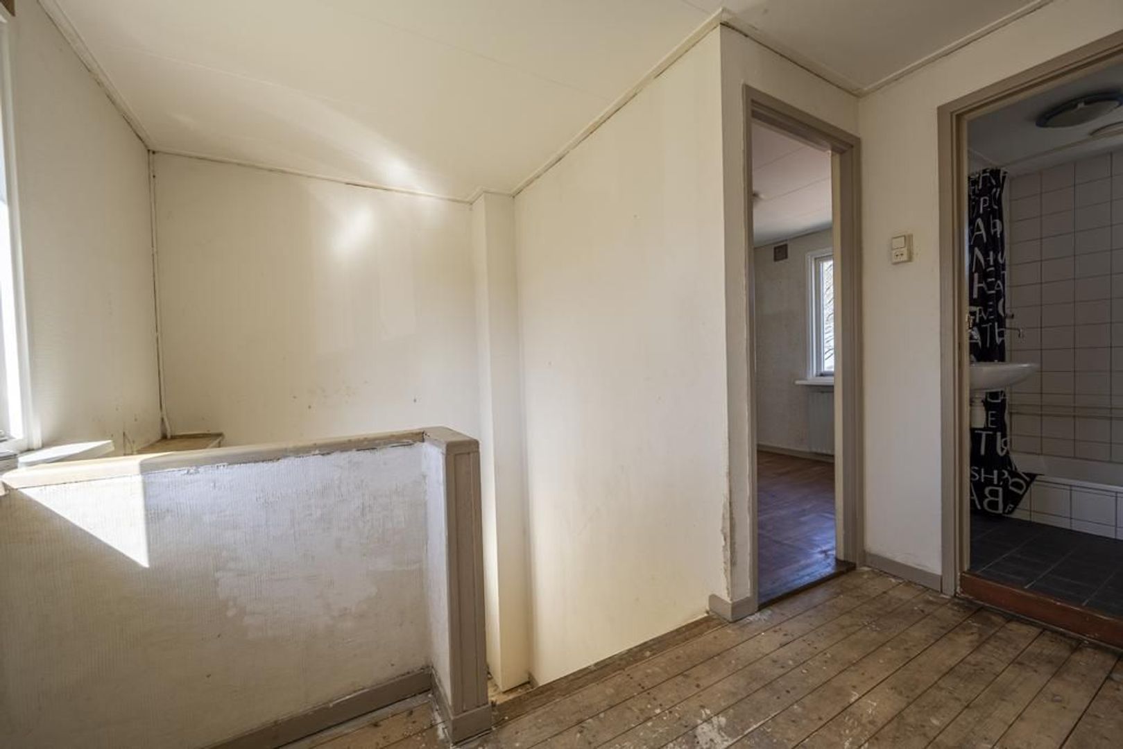 Op de eerste verdieping zijn drie slaapkamers, waarvan twee voorzien van een vaste kast en in de kleinste slaapkamer is de aansluiting voor de wasmachine. Overloop, eenvoudige badkamer met een doucheruimte en wastafel.