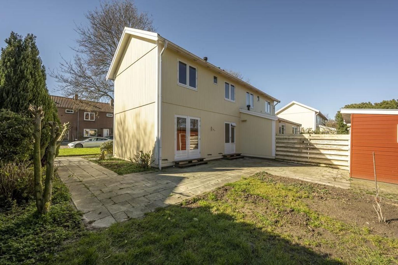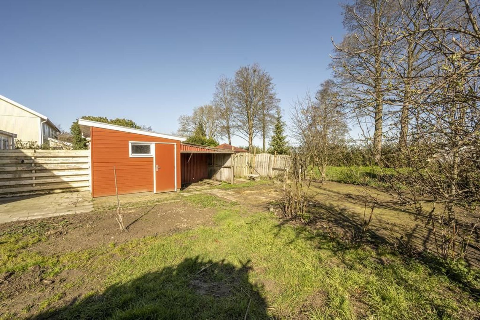 De diepe achtertuin ligt op het noorden en is voorzien van een vrijstaande houten berging met overkapping.