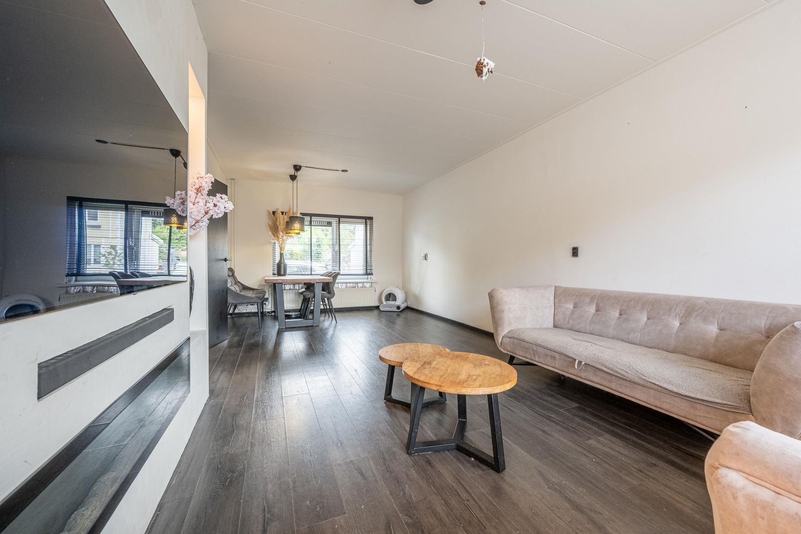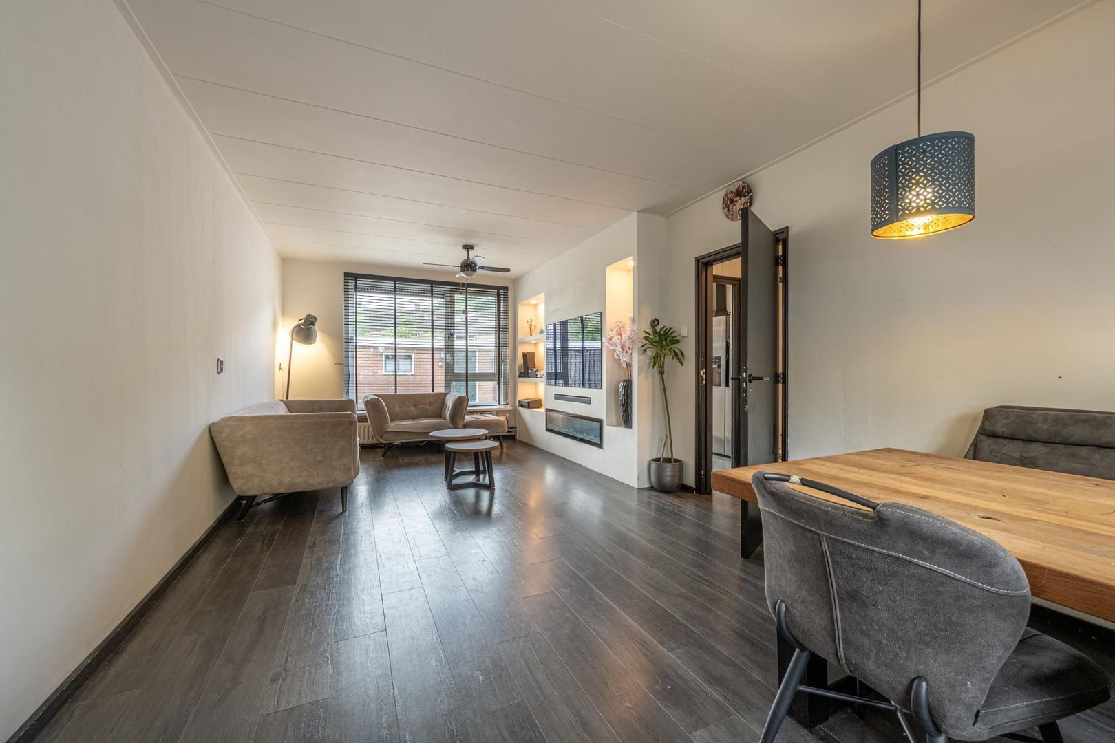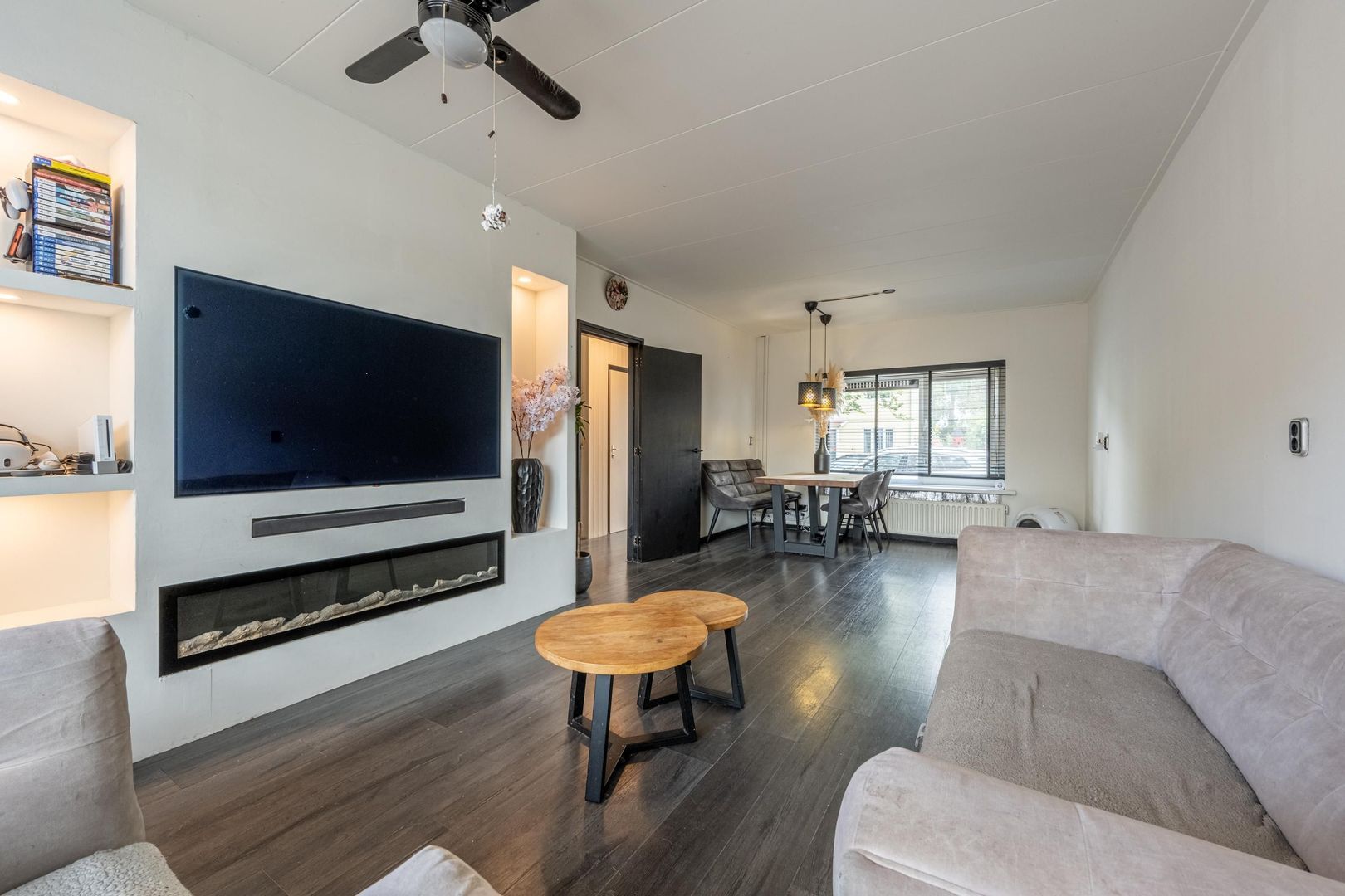 De doorzon woonkamer heeft een trendy cinewall met sfeerhaard en inbouwverlichting.