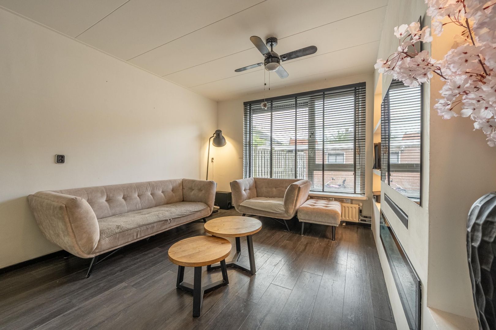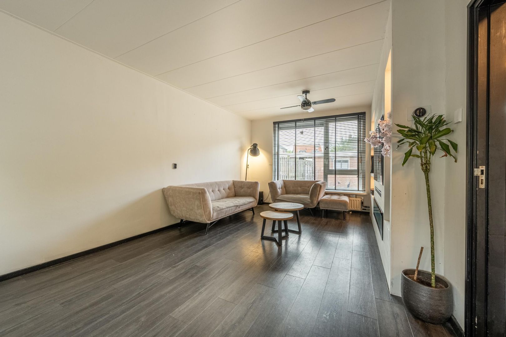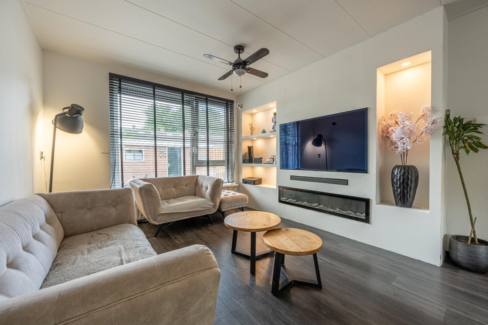 De doorzon woonkamer heeft een trendy cinewall met sfeerhaard en inbouwverlichting.