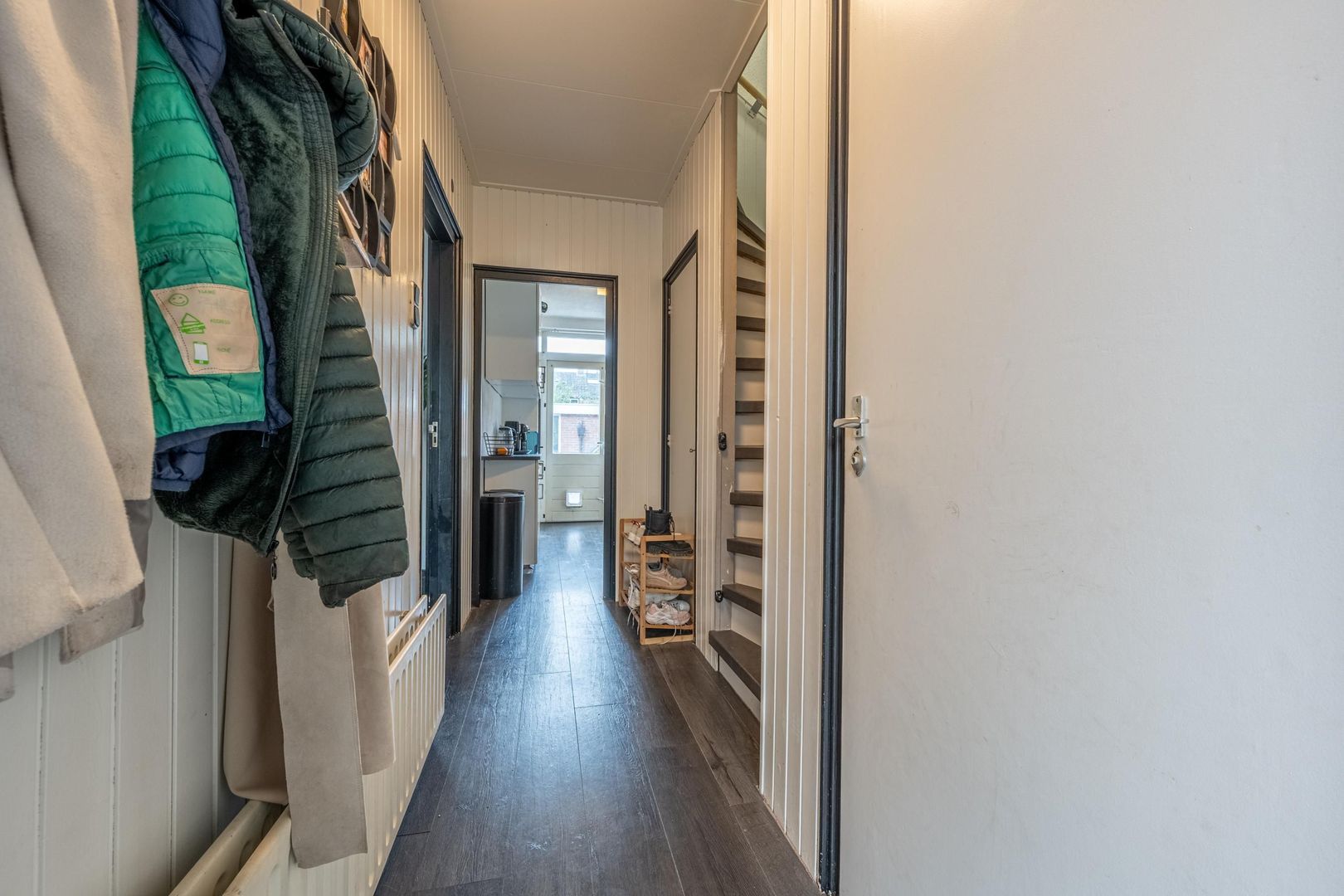 Een vlizotrap leidt naar de bergzolder. Hier hangt de cv-ketel en is veel bergruimte.