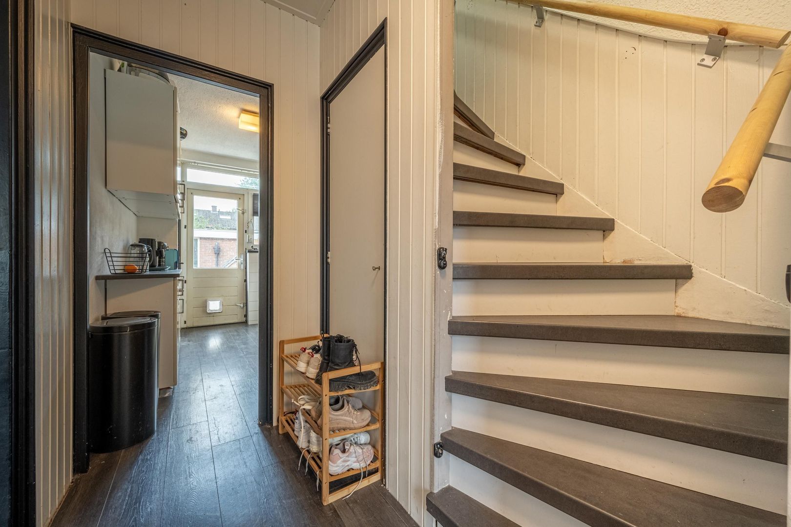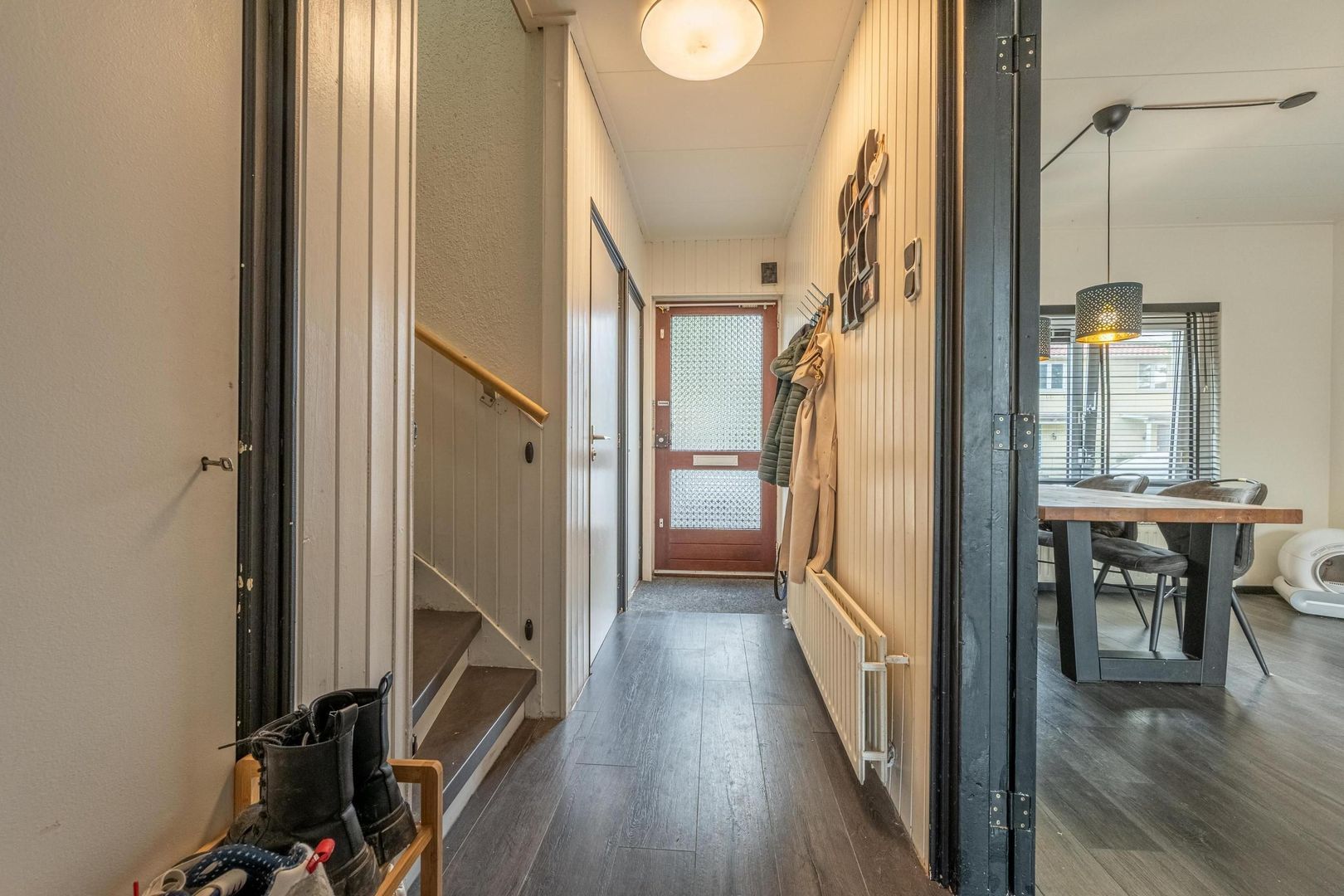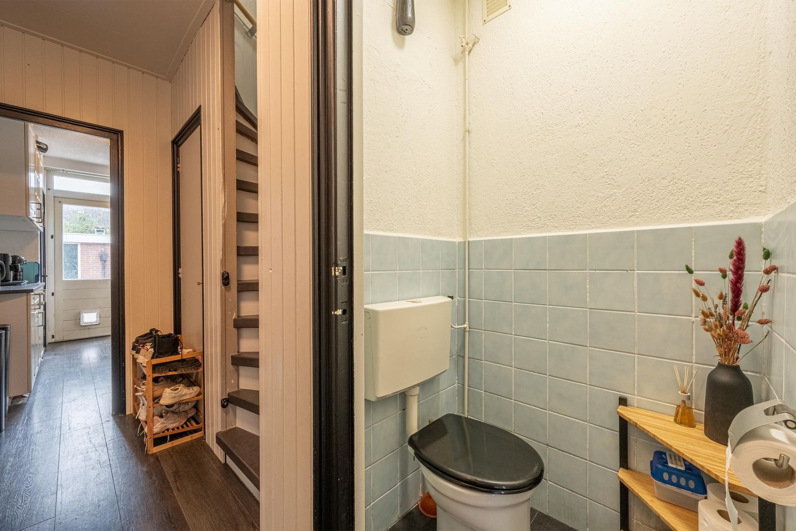 entree, hal met meterkast, trapopgang met trapkast en toiletruimte.