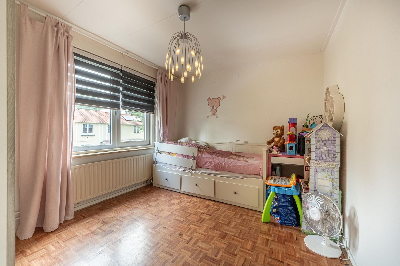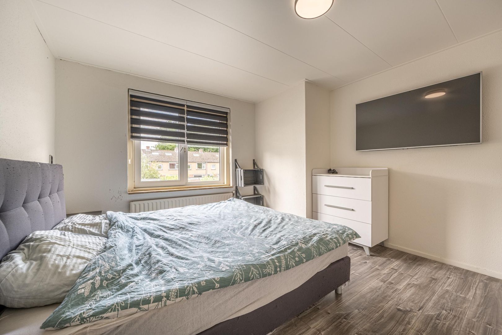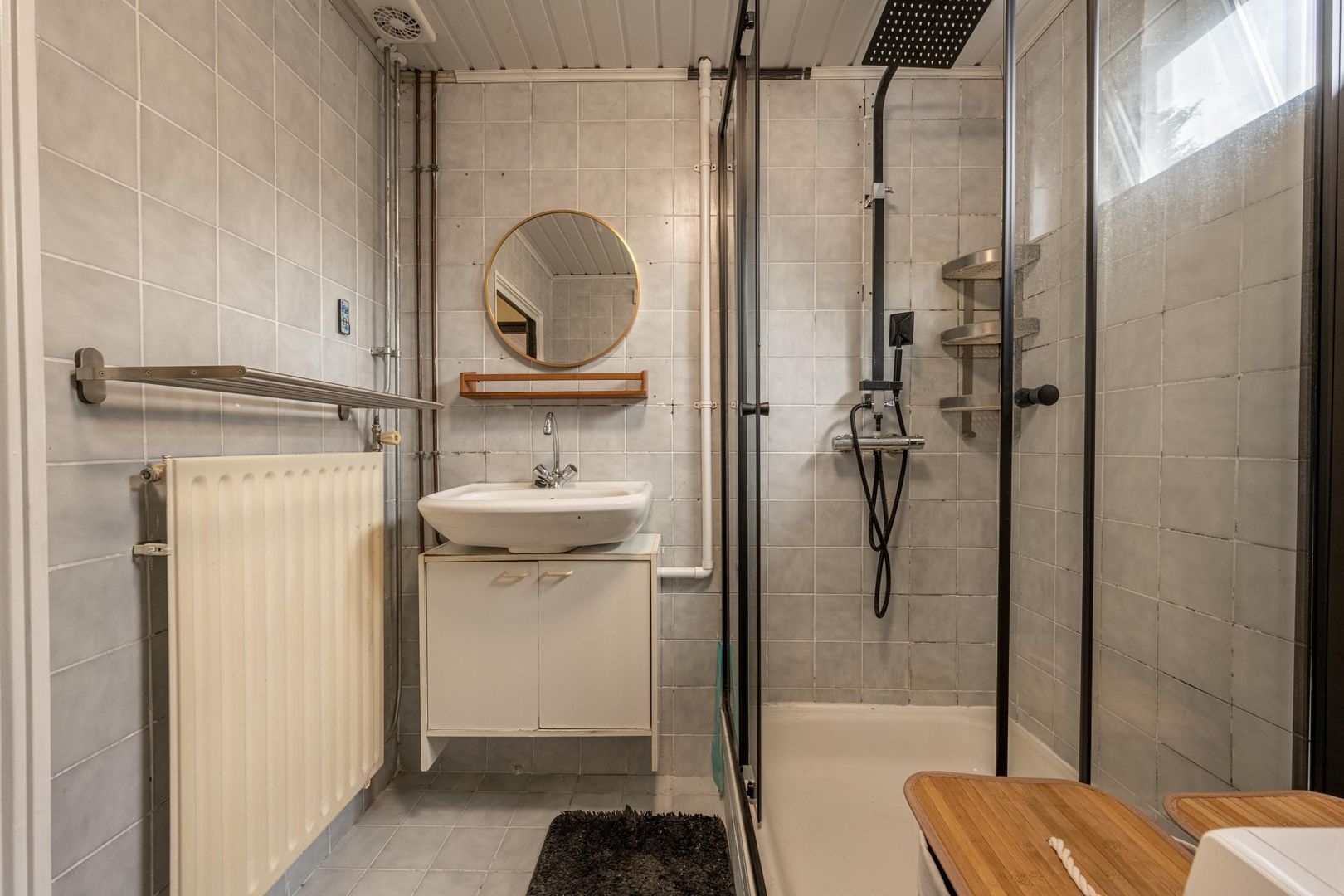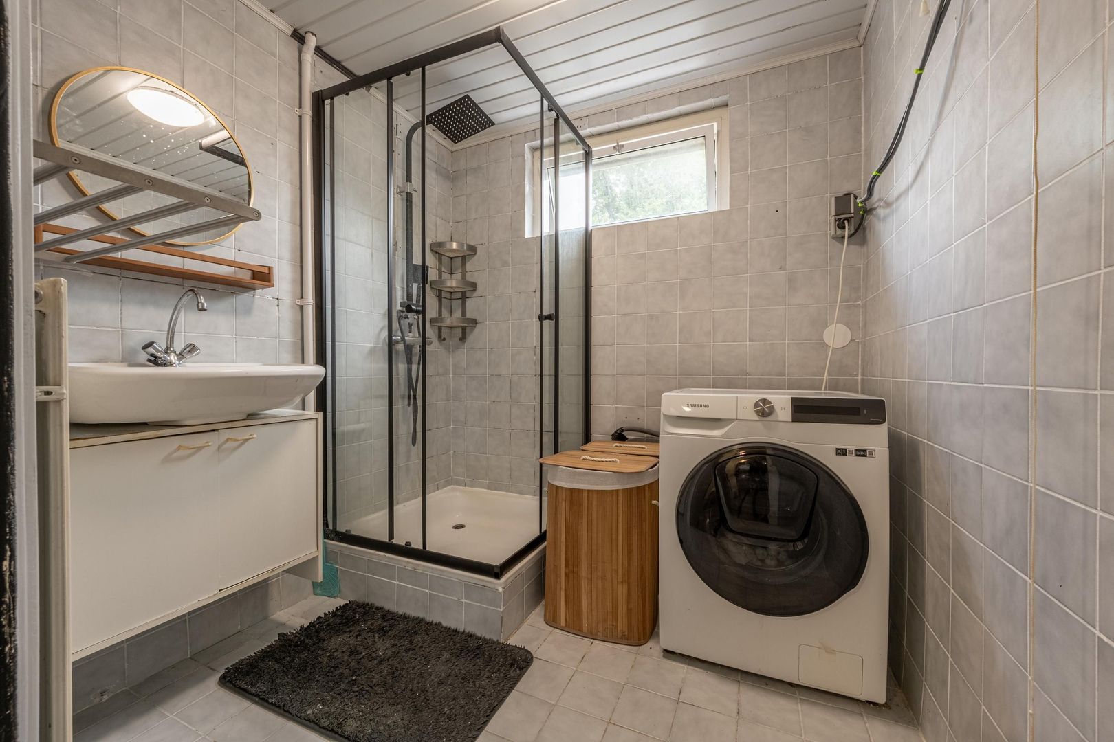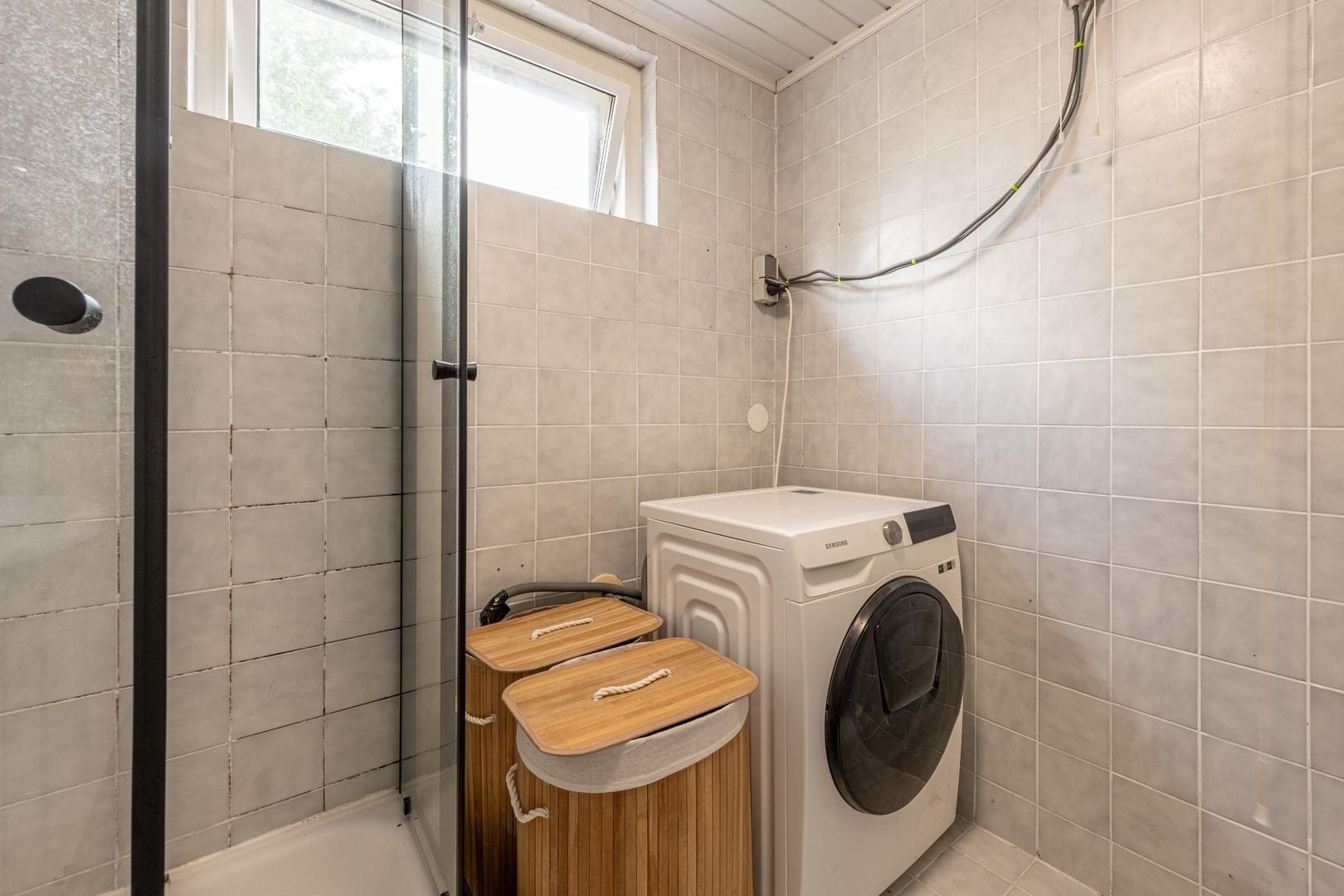 Op de verdieping zijn drie slaapkamers en de badkamer. Deze biedt ruimte aan een douchecabine, een wastafel met onderkastje en de wasmachine. Het raam kan open, zodat ventileren met frisse buitenlucht mogelijk is.