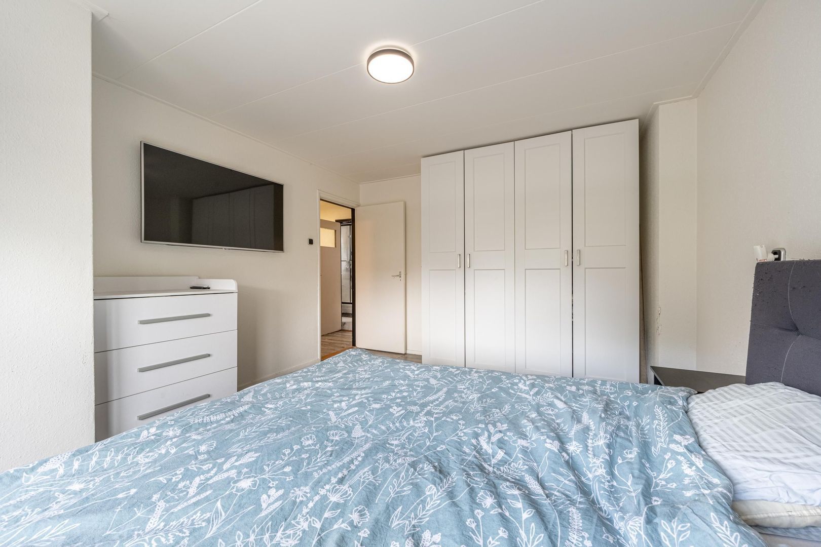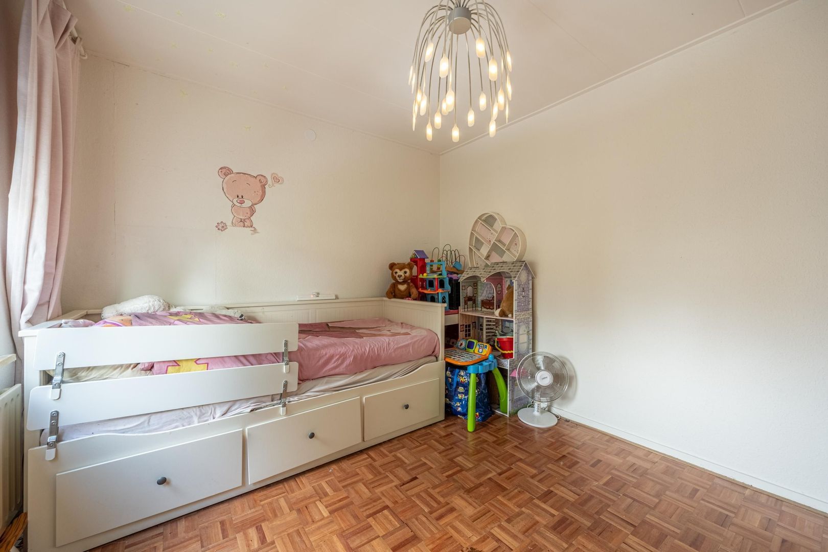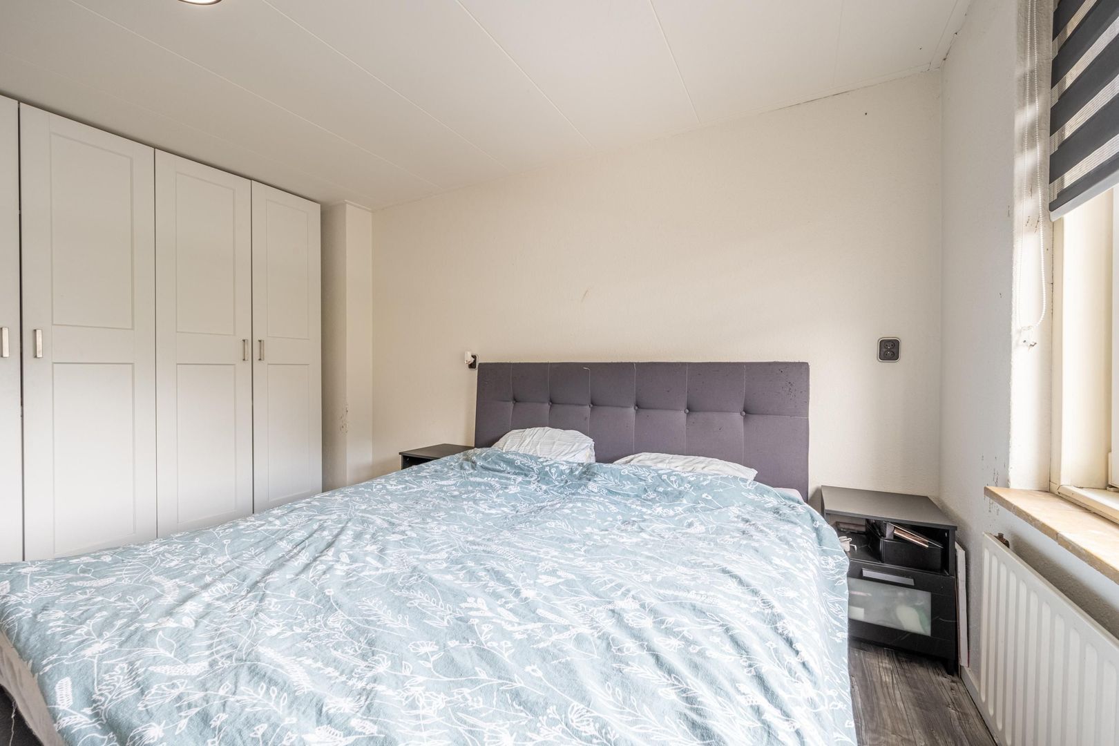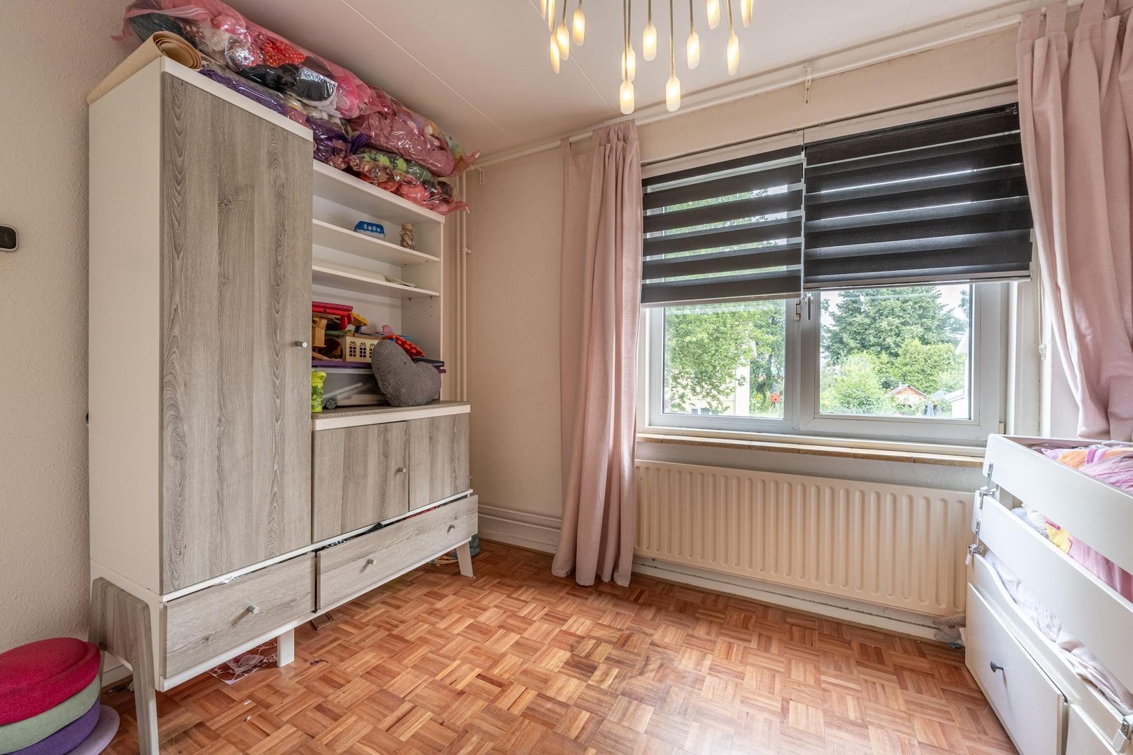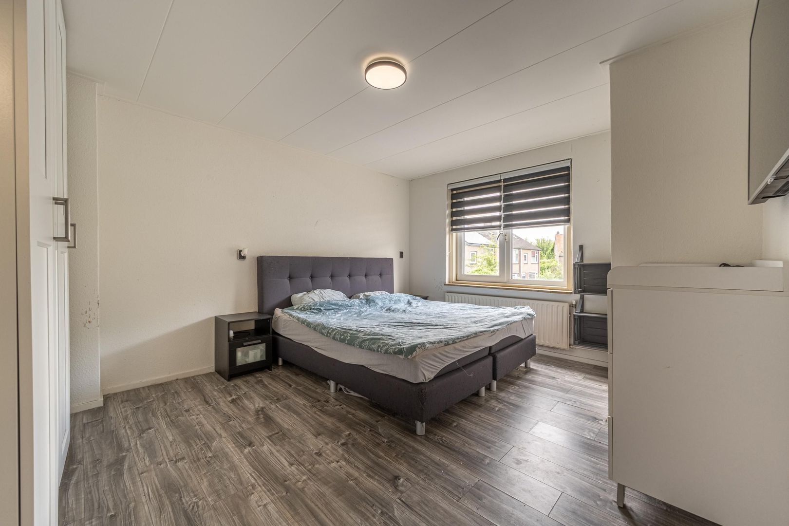 Op de verdieping zijn drie slaapkamers en de badkamer. Deze biedt ruimte aan een douchecabine, een wastafel met onderkastje en de wasmachine. Het raam kan open, zodat ventileren met frisse buitenlucht mogelijk is.
