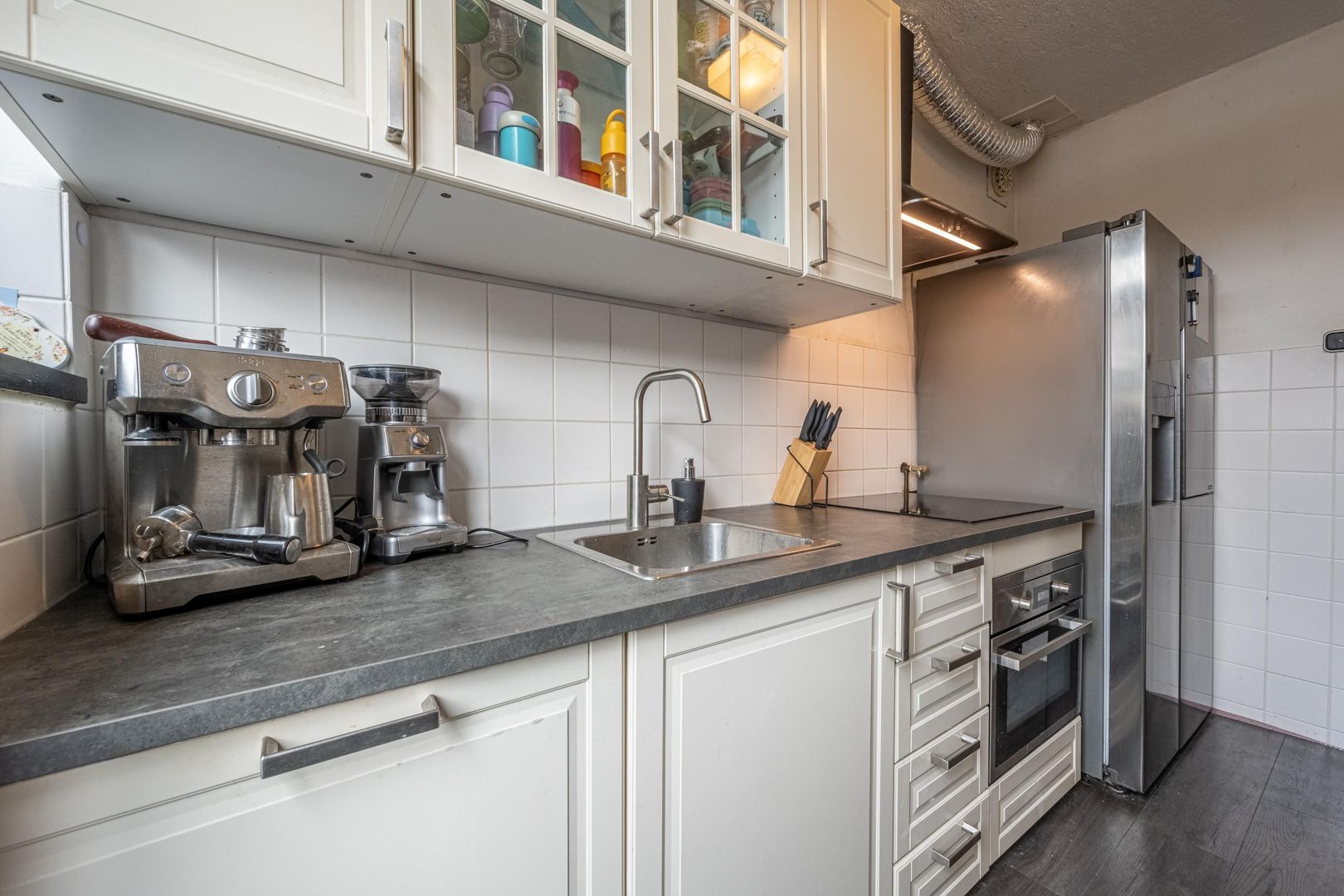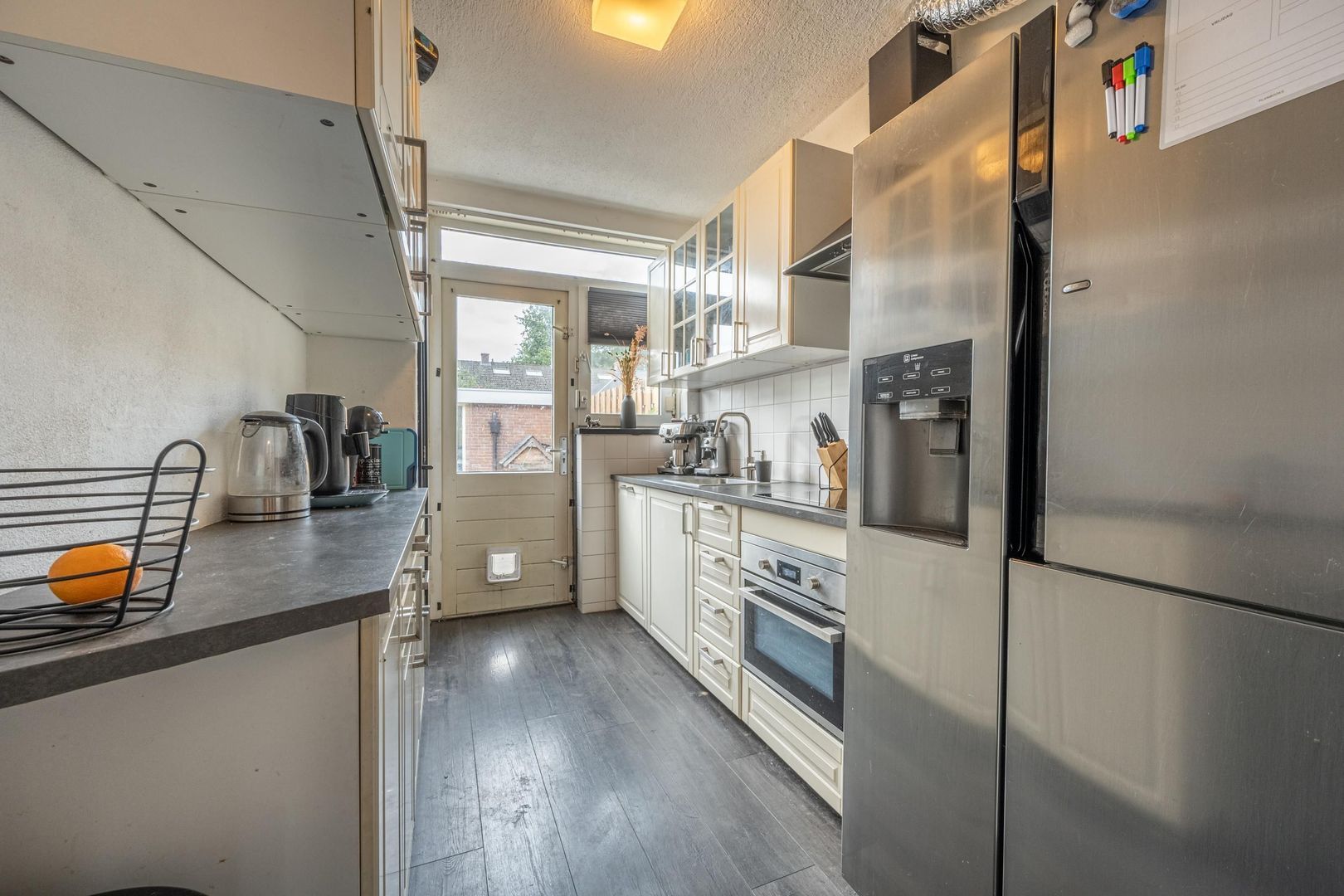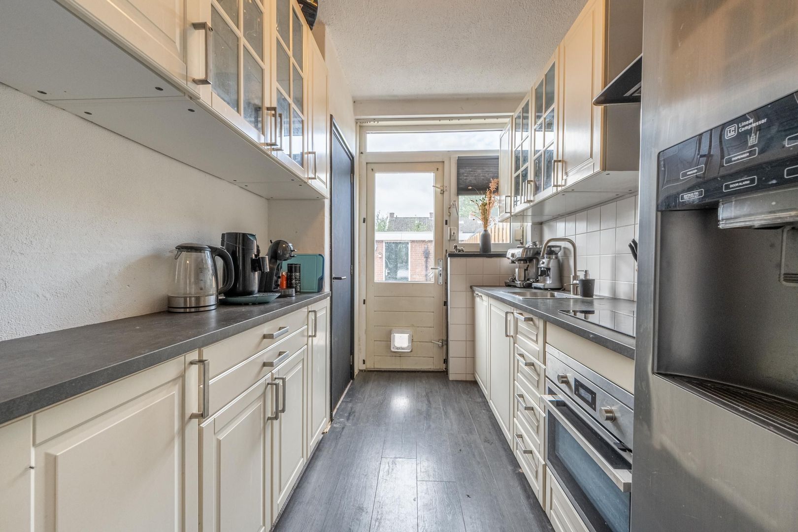 De dichte keuken is ingericht met kastjes aan twee zijden, diverse inbouwapparaten en een deur naar de tuin. De Amerikaanse koelkast en de laminaatvloer kun je overnemen.