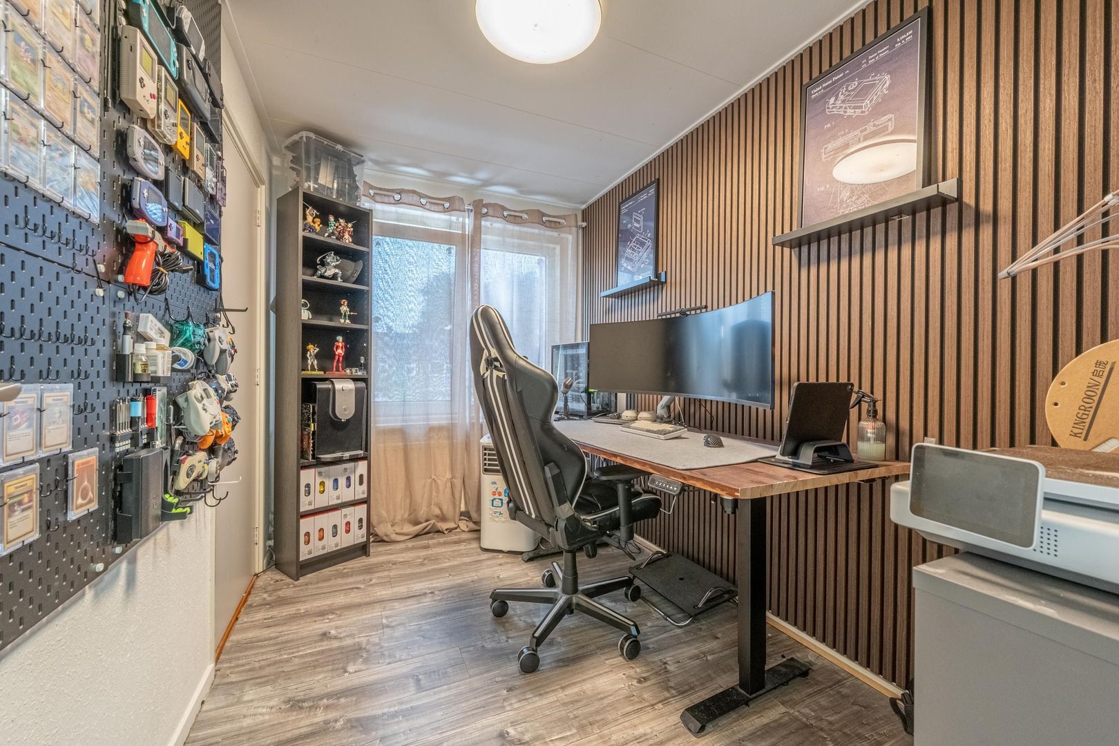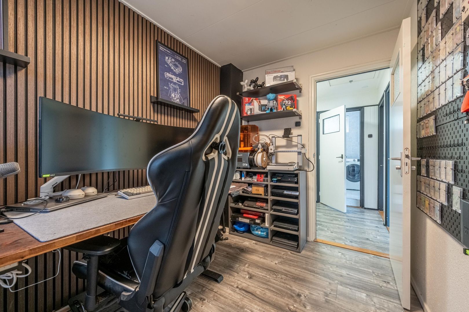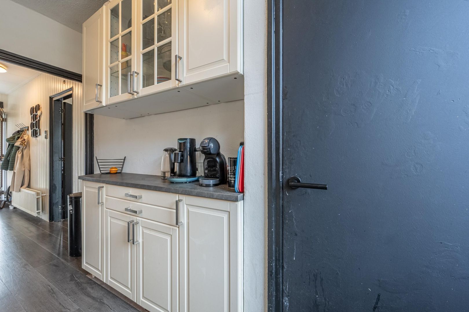De dichte keuken is ingericht met kastjes aan twee zijden, diverse inbouwapparaten en een deur naar de tuin. De Amerikaanse koelkast en de laminaatvloer kun je overnemen.