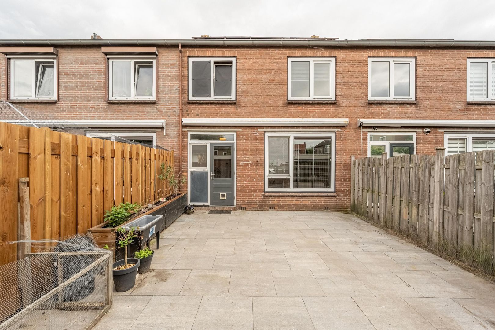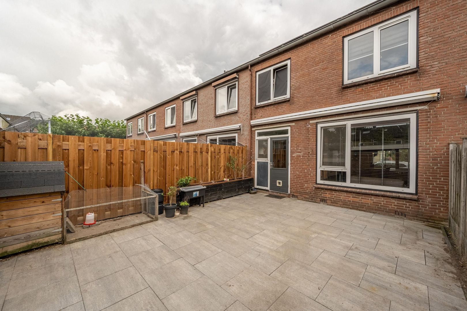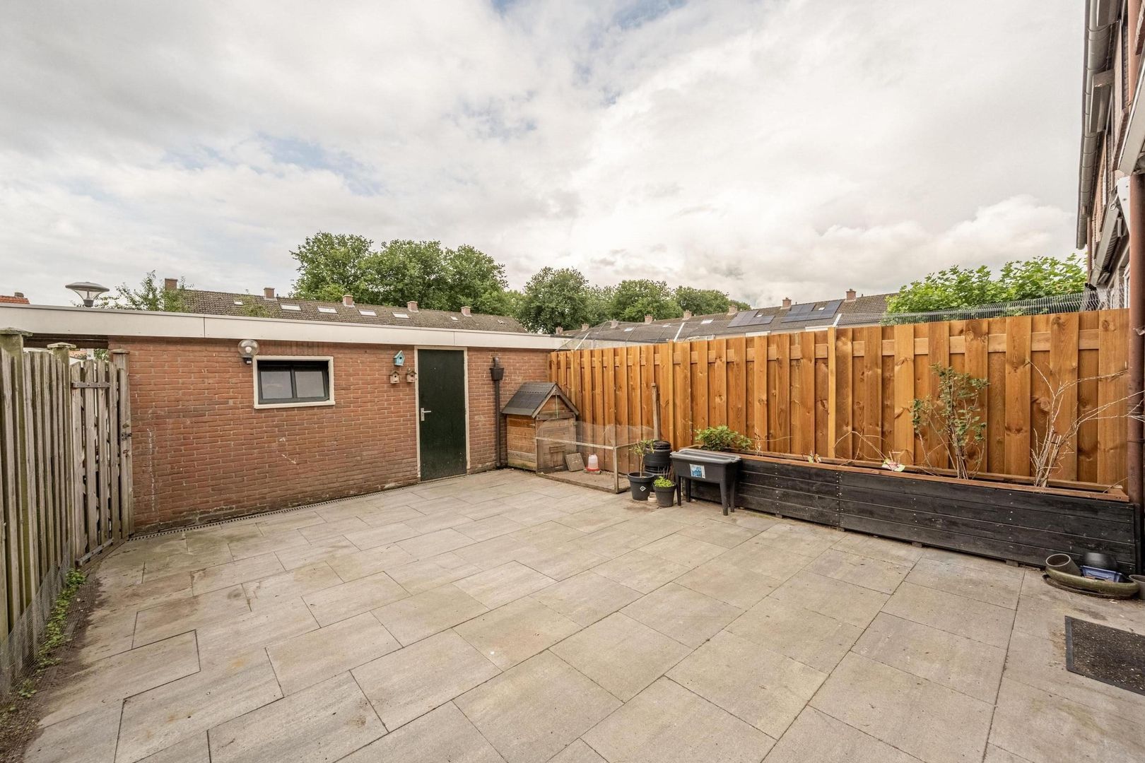 De achtertuin ligt op de zuidkant. Deze is onderhoudsvriendelijk ingericht met grote terrastegels en schuttingen. Achterin staat een flinke stenen berging over de gehele breedte van de tuin.