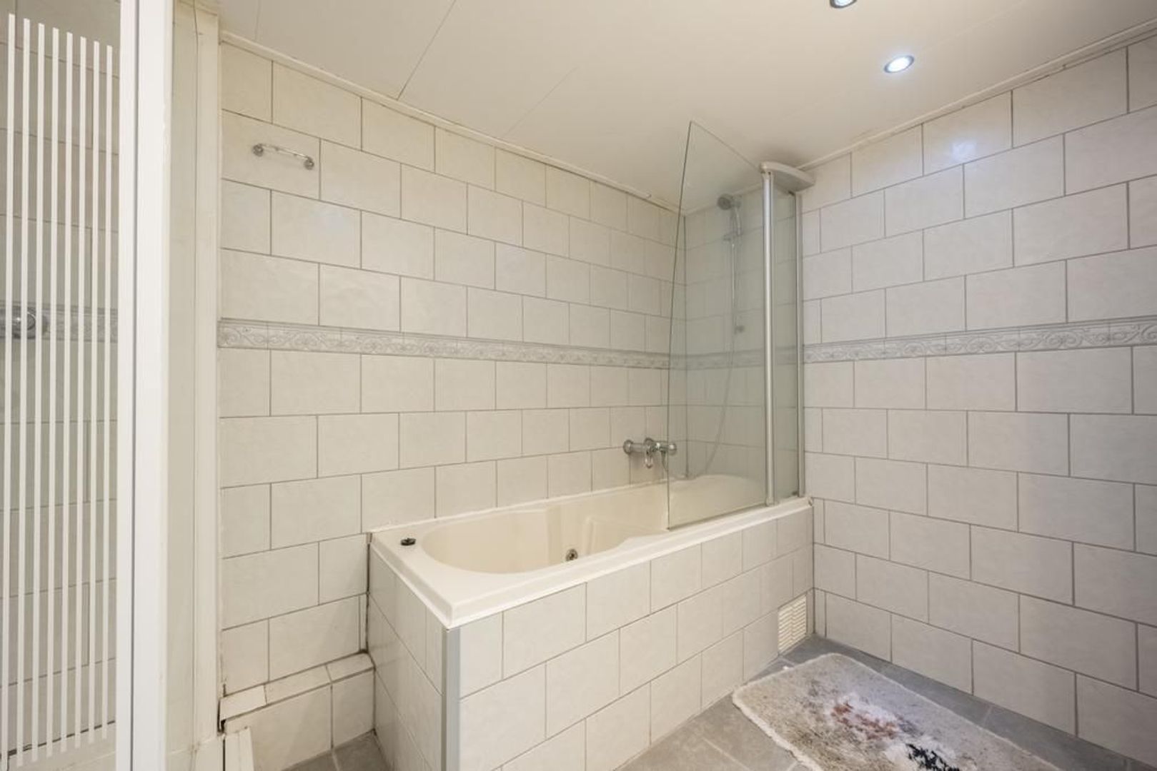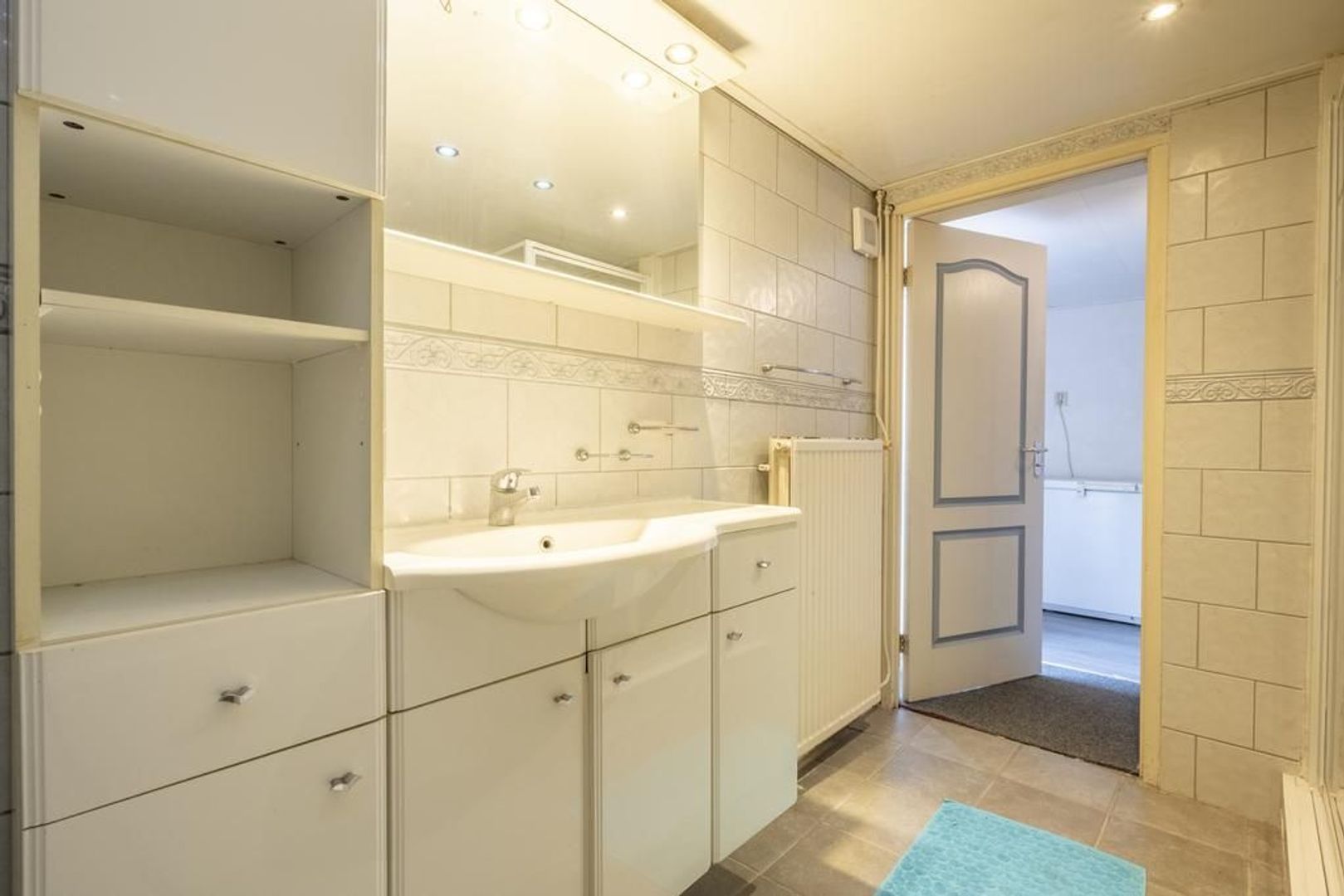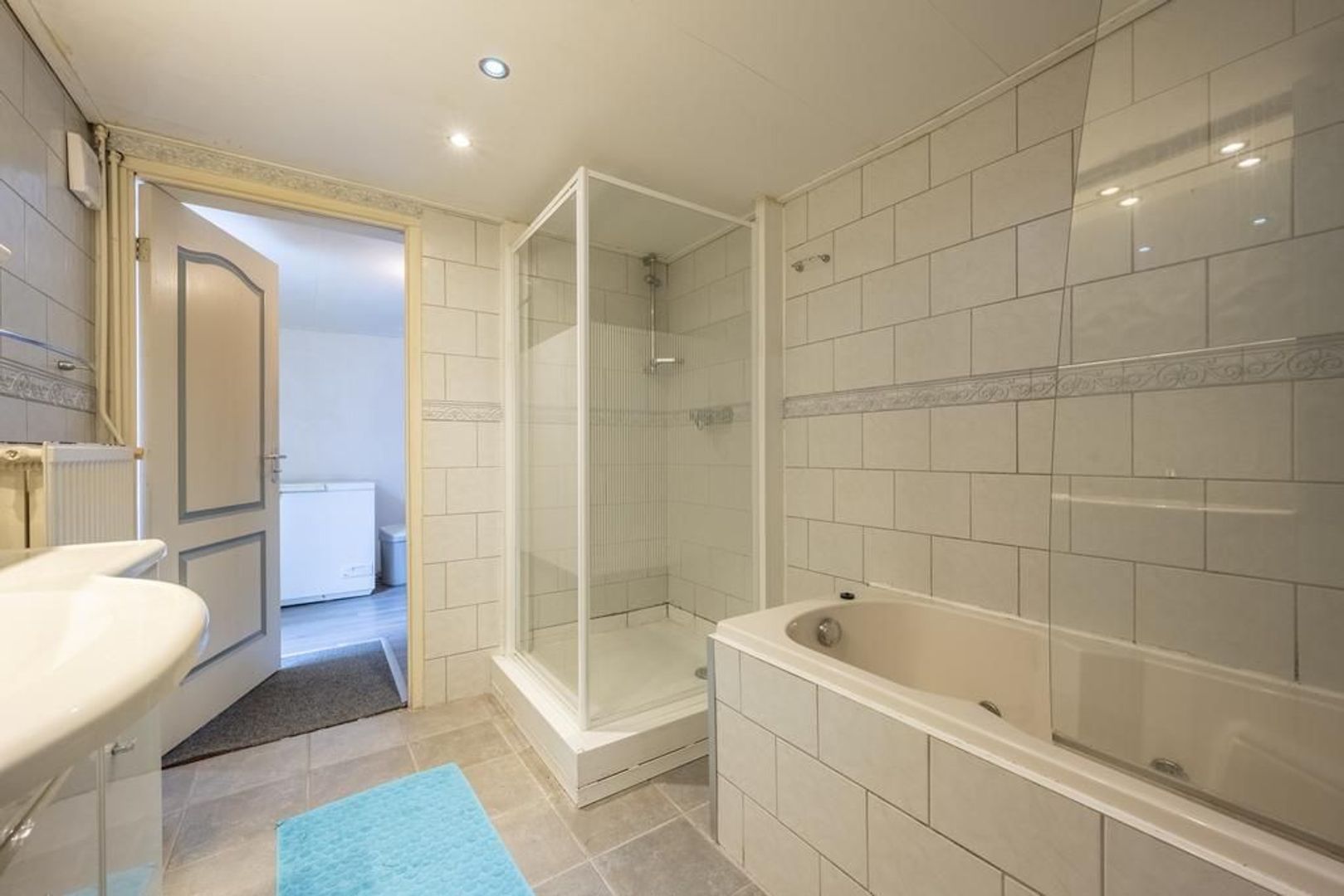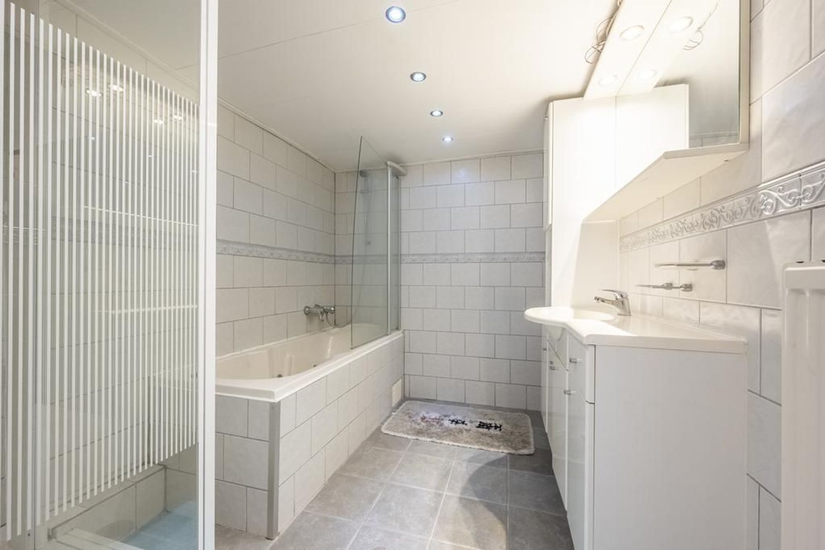 Aan de tuinkant in de aanbouw bevinden zich een ruime achterhal en de badkamer. Deze is ingericht met een douchecabine, wastafelmeubel en een ligbad.