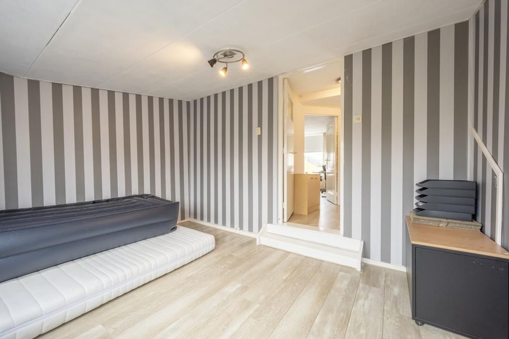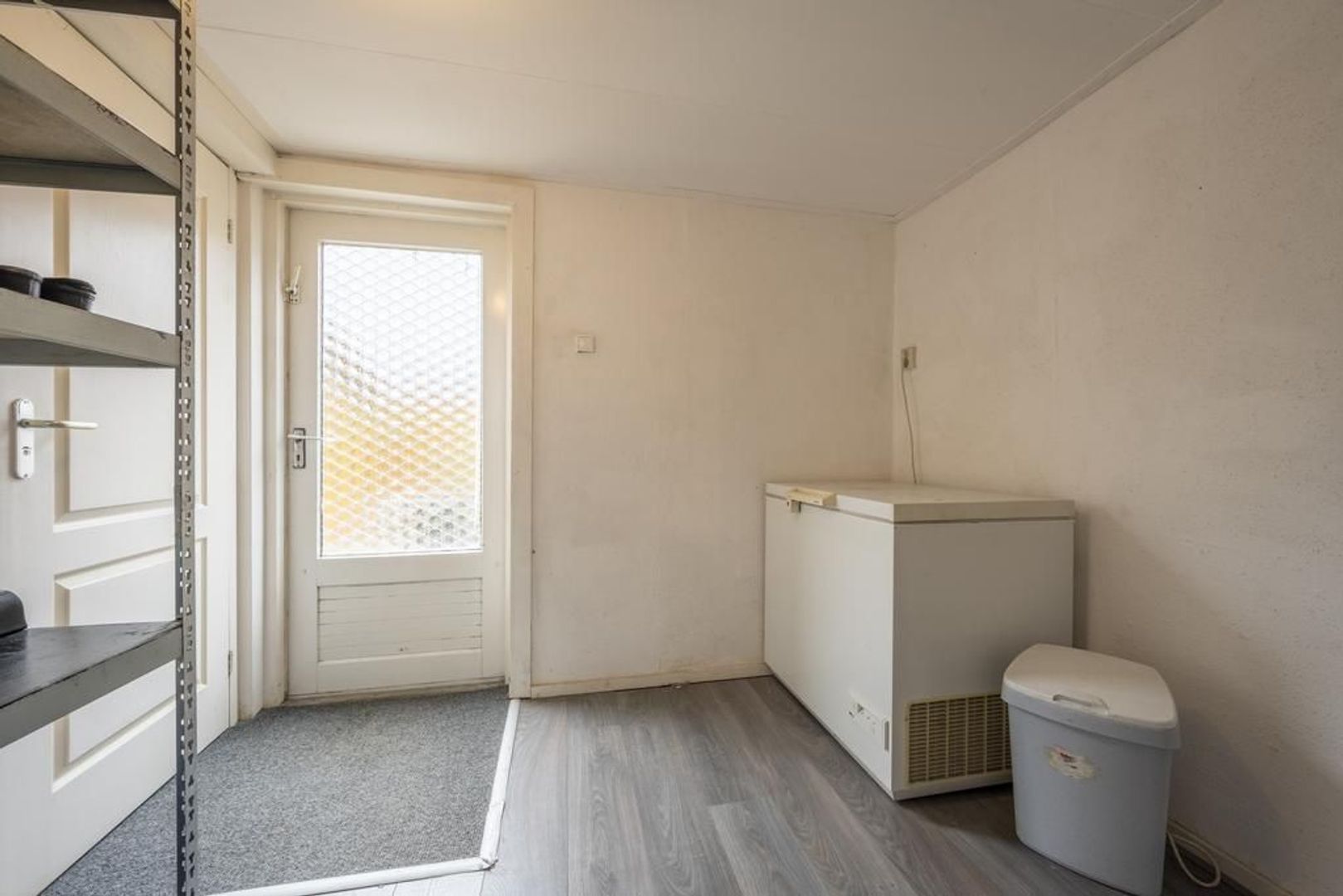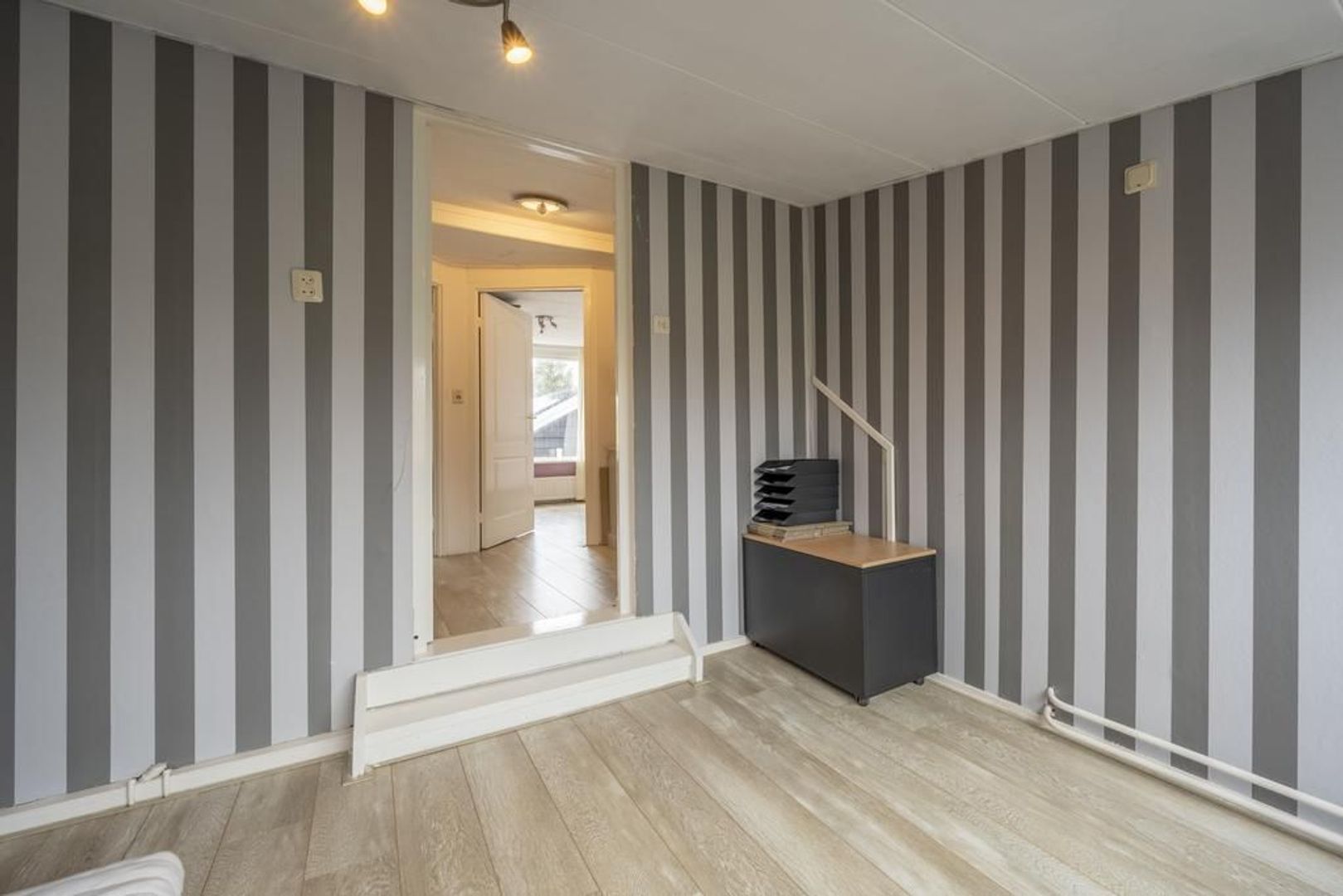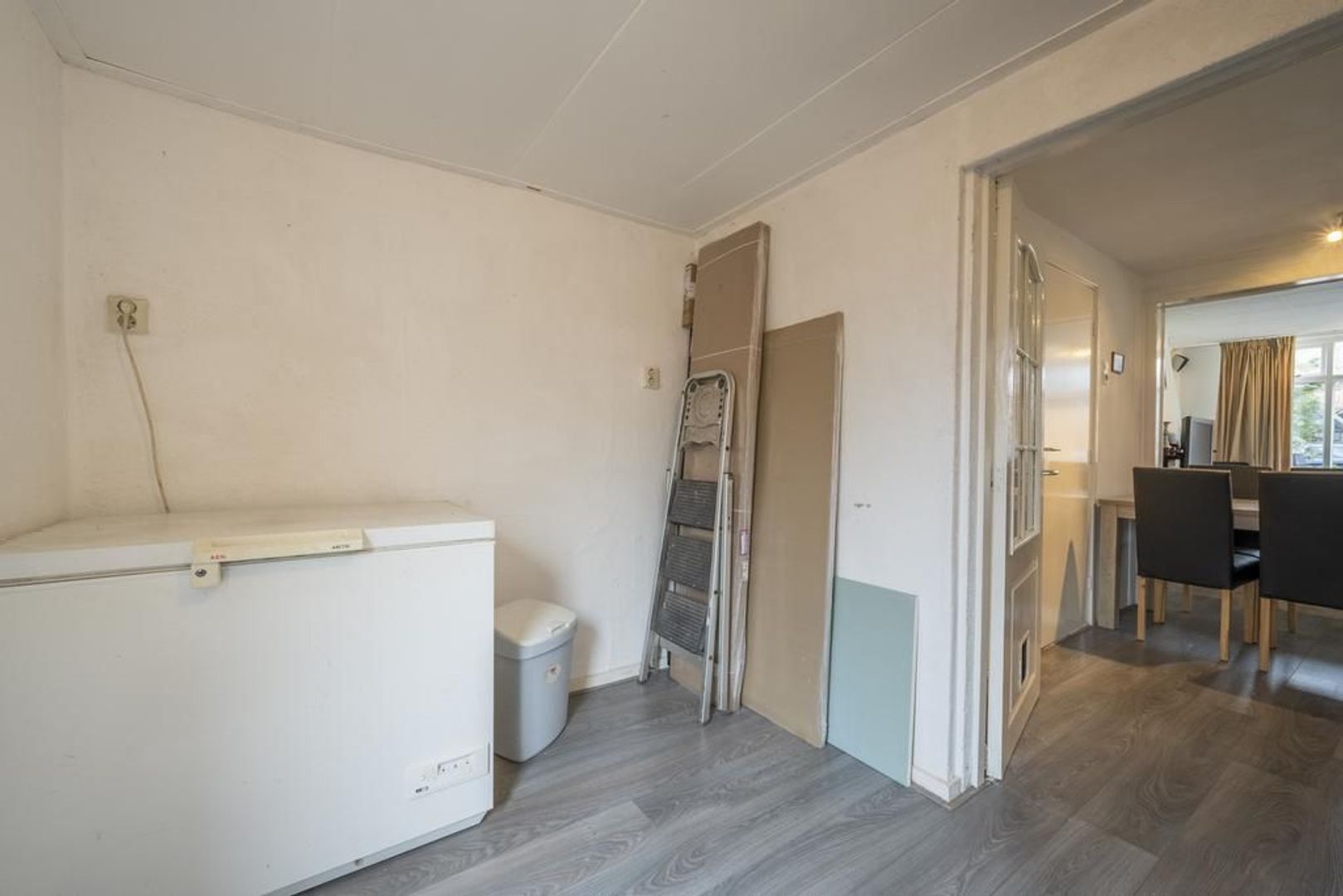 De begane grond is afgewerkt met een laminaatvloer, granol wanden en gedeeltelijk kunststof plafondschroten.