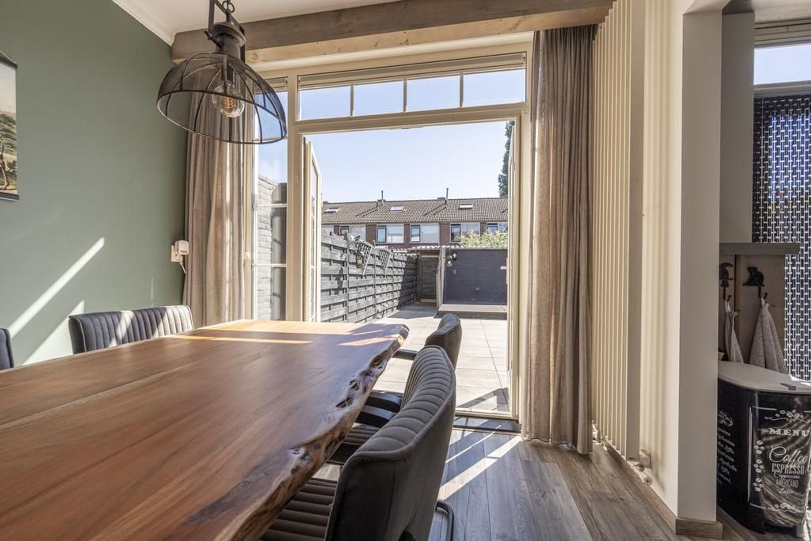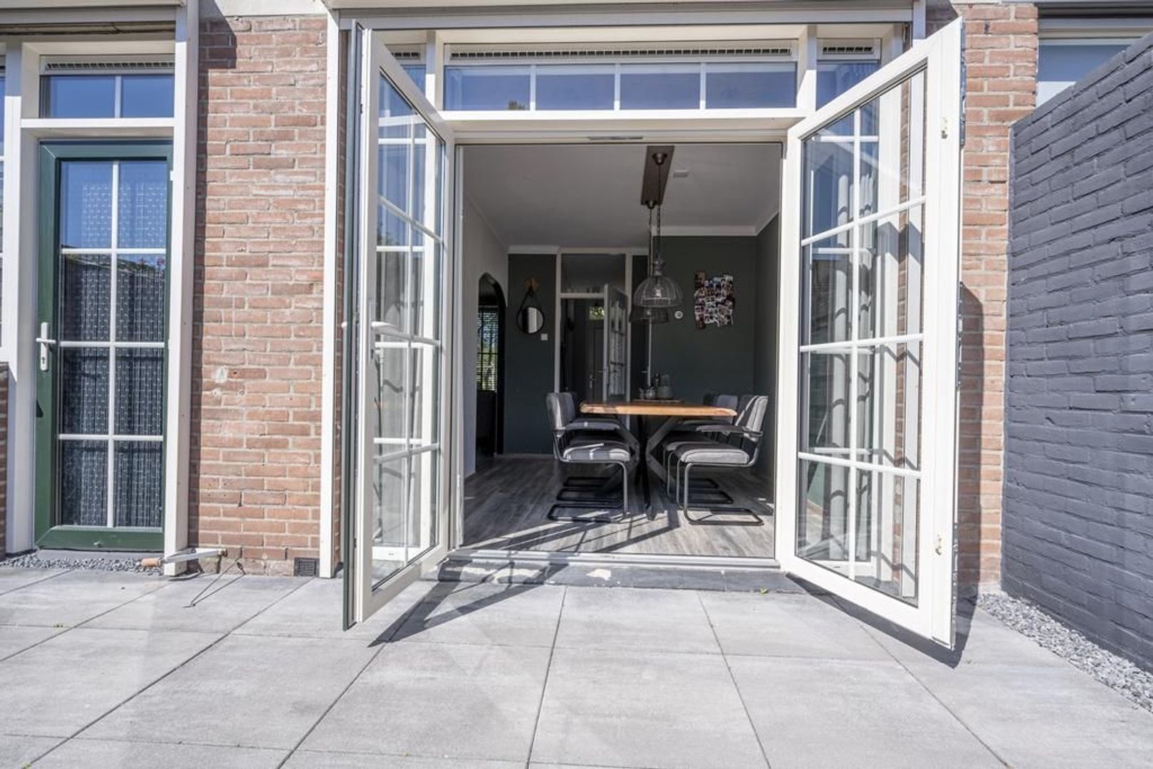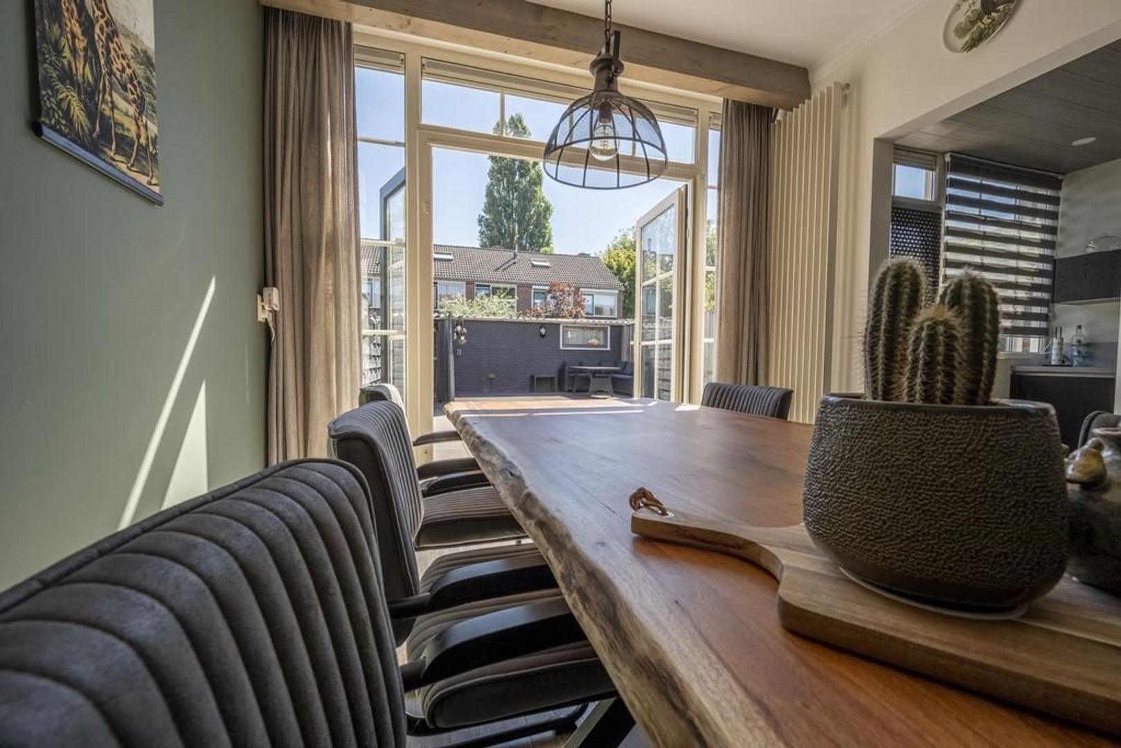 Gezellige Z-vormige woonkamer met openslaande deuren naar de tuin.