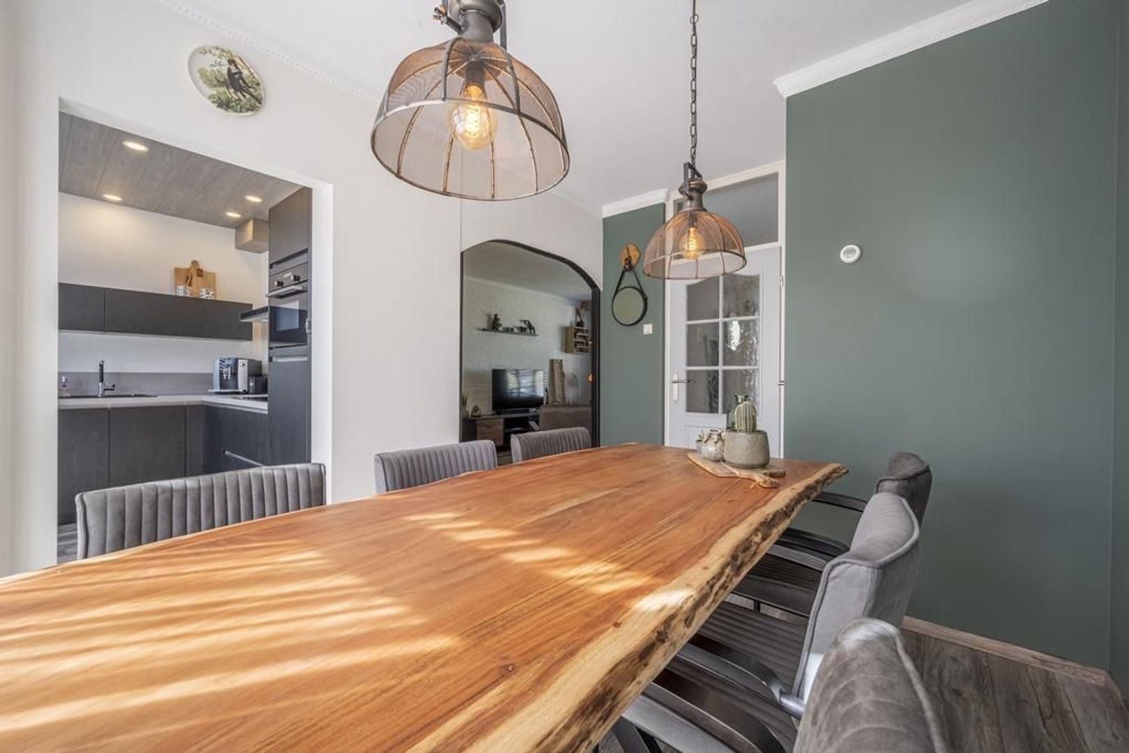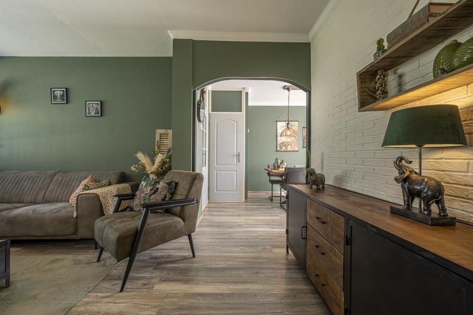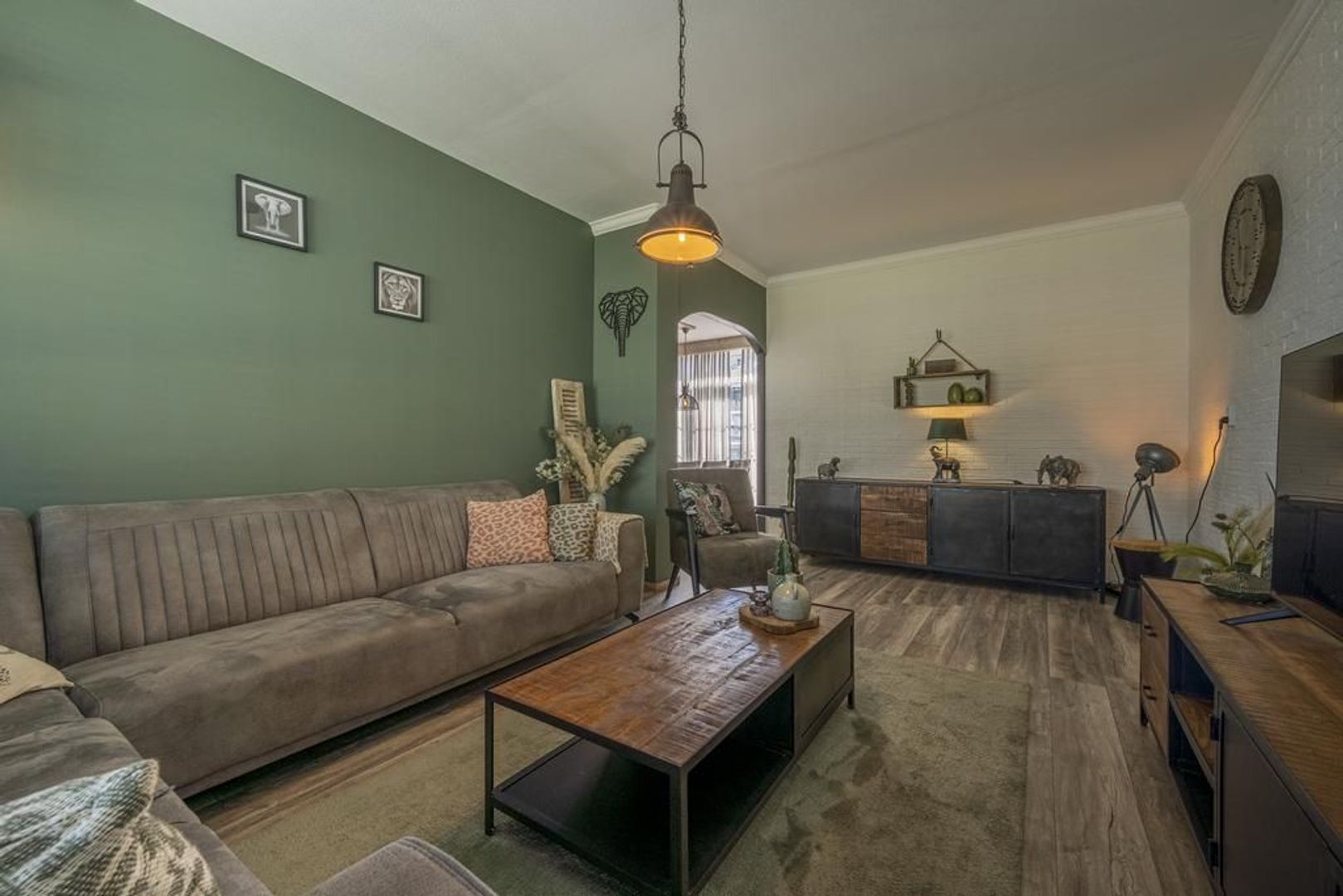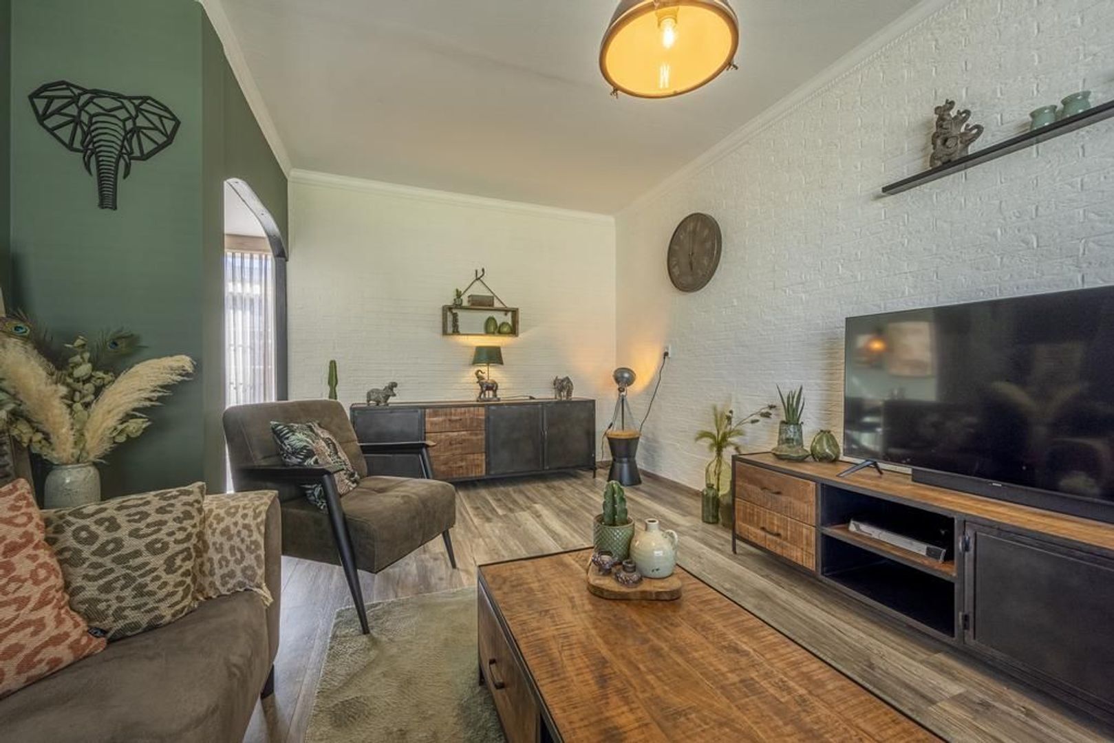 Gezellige Z-vormige woonkamer met openslaande deuren naar de tuin.