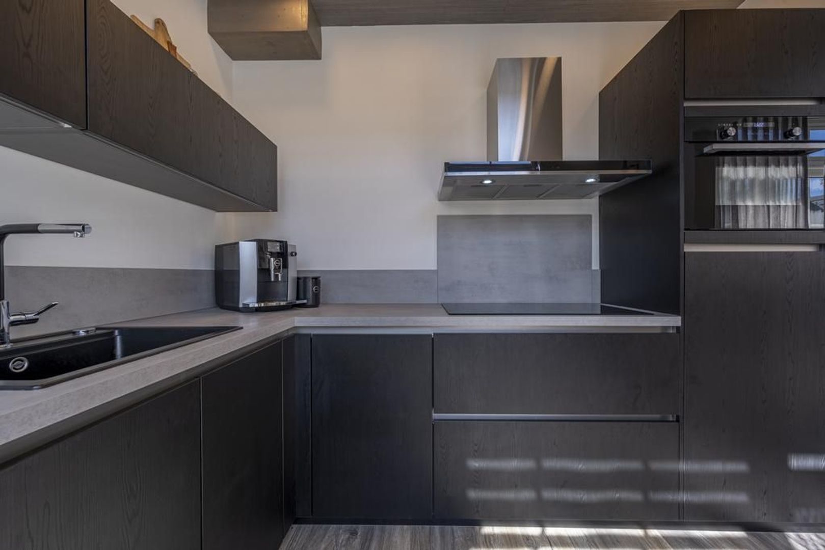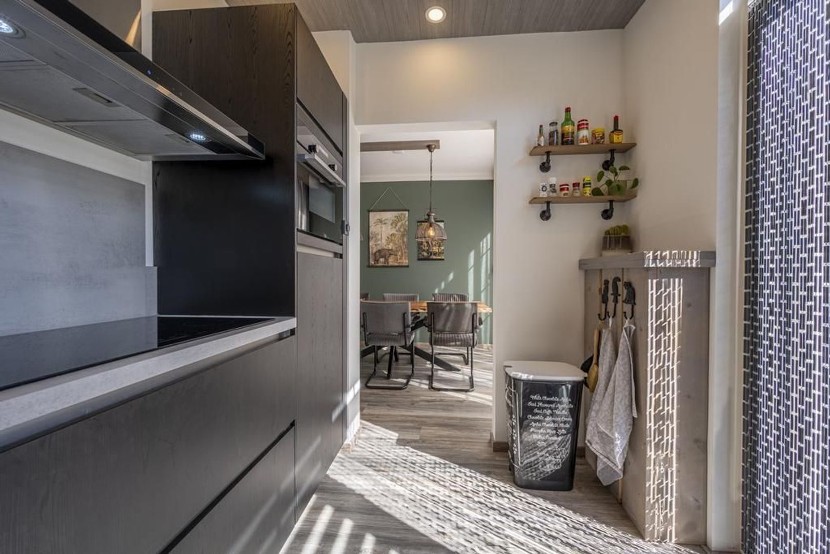 De halfopen keuken is uitgevoerd in zwart met grijs in een L-vormige opstelling. Deze is voorzien van een 5-pits inductiekookplaat, een afzuigkap, koelkast, combi-magnetron en vaatwasser.