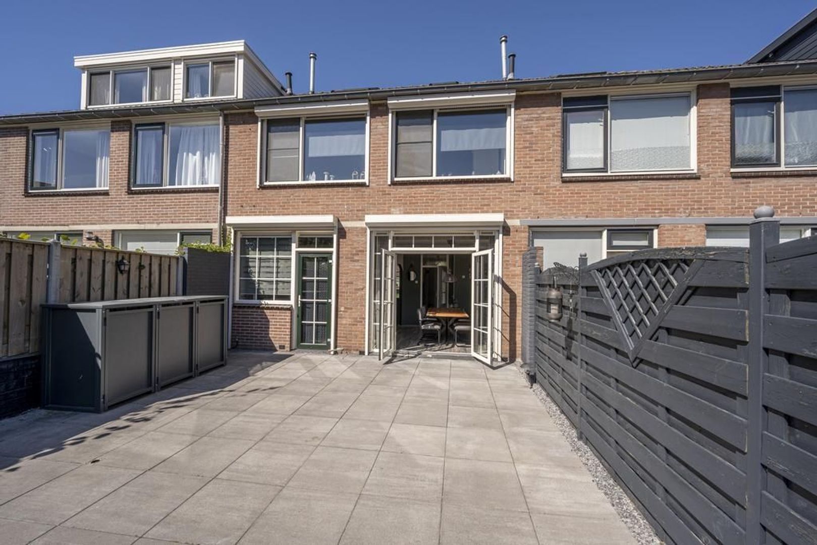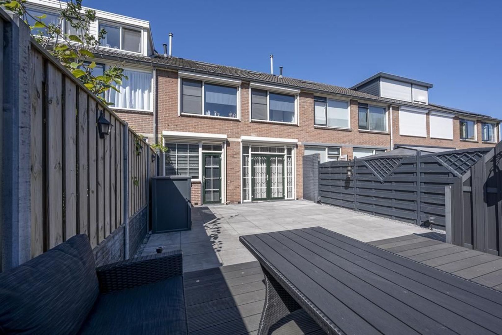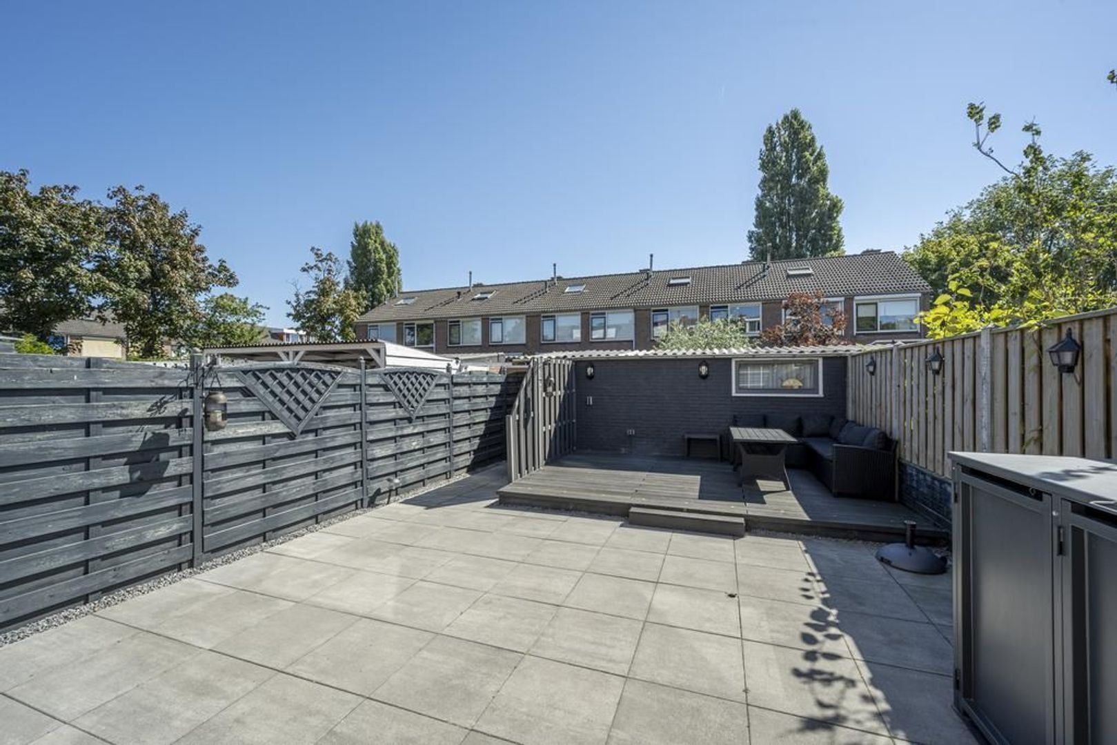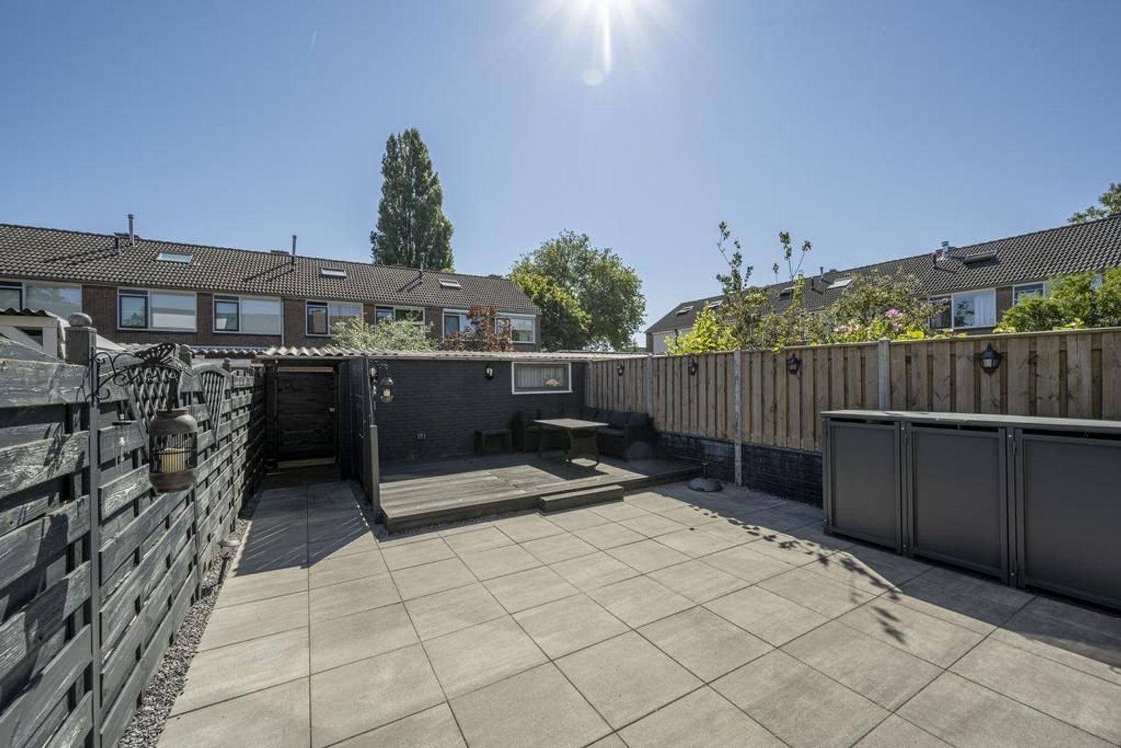 De tuin ligt op het oosten. Deze is onderhoudsvriendelijk ingericht met grote terrastegels. Achterin staat een stenen berging.