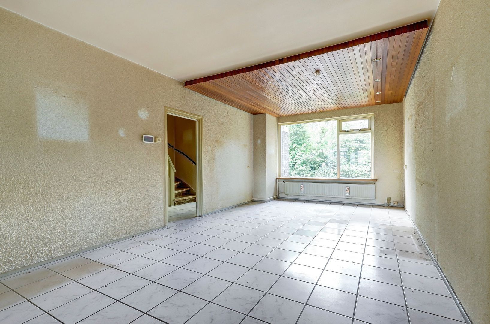 De doorzon woonkamer is licht en afgewerkt met een plavuizen vloer.