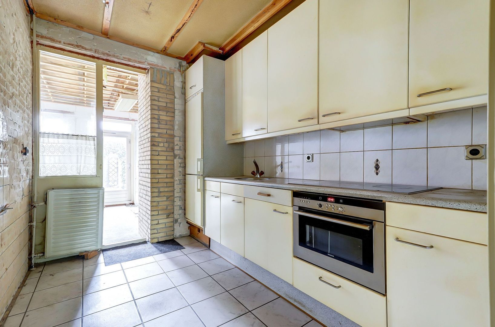 De dichte keuken ligt aan de achterkant van het huis. Deze heeft een (verouderde) inrichting.