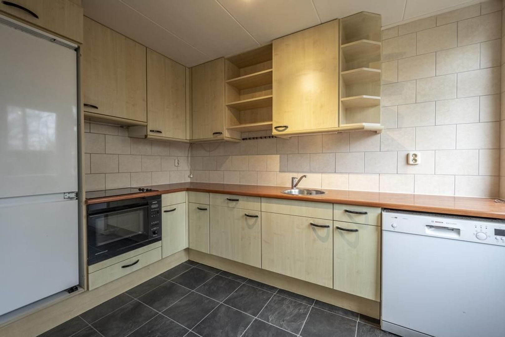 Lichte, doorzon woonkamer met toegang tot de keuken. Deze is halfopen en is uitgevoerd met diverse apparaten.