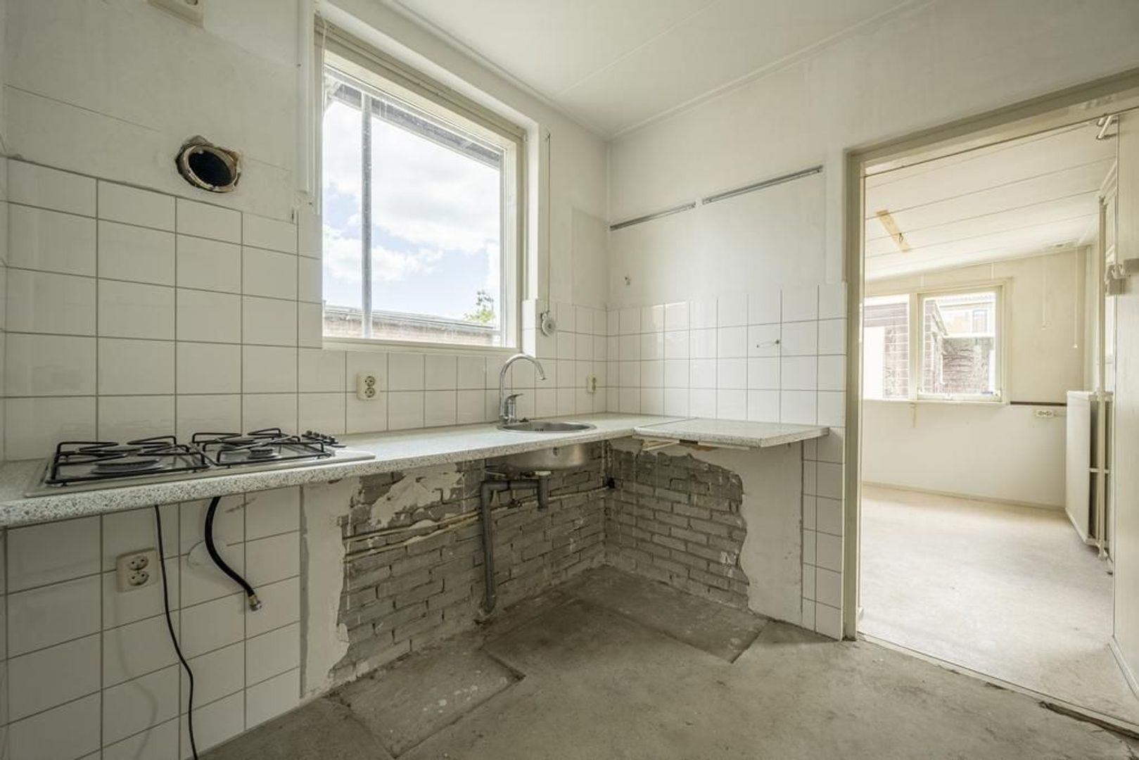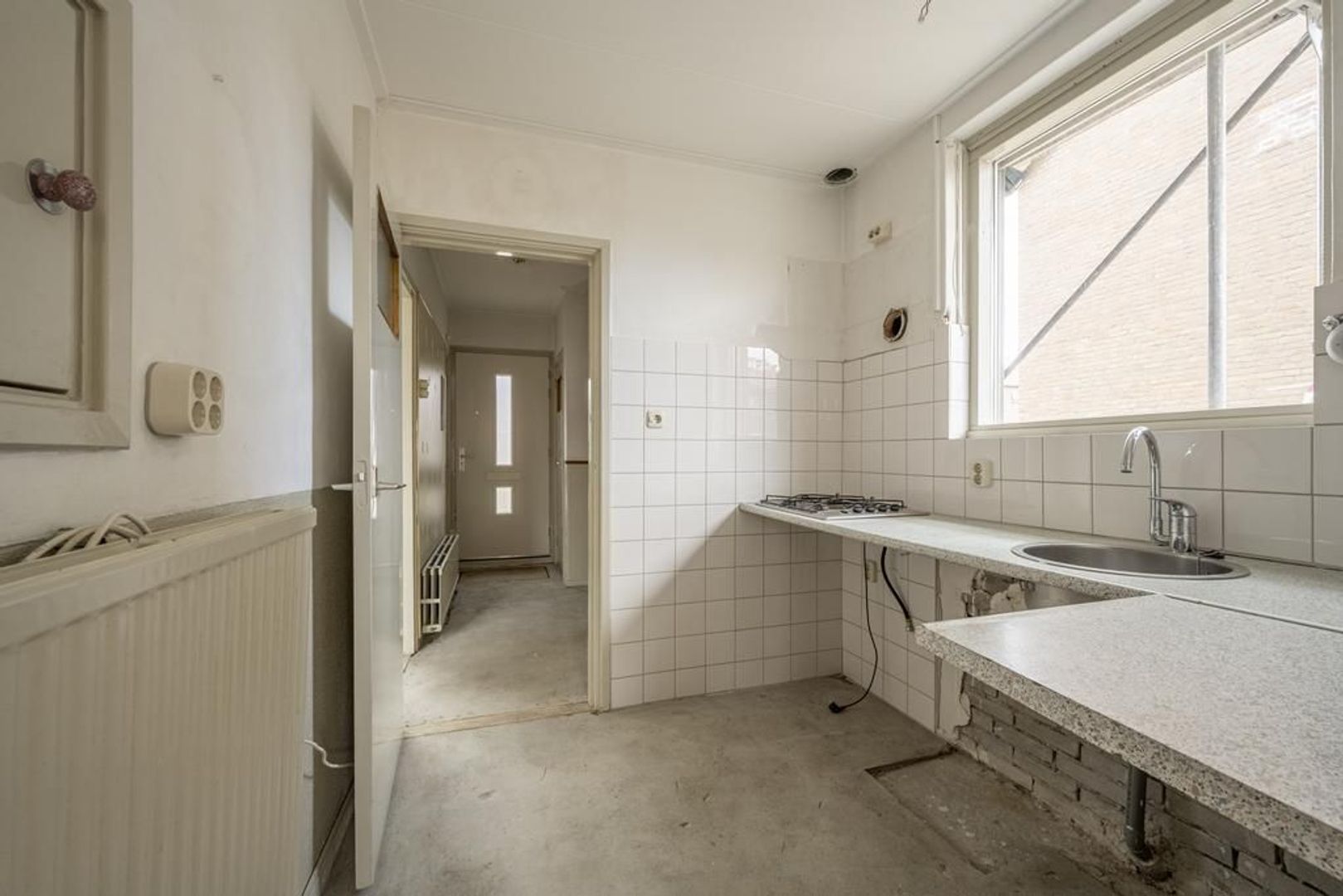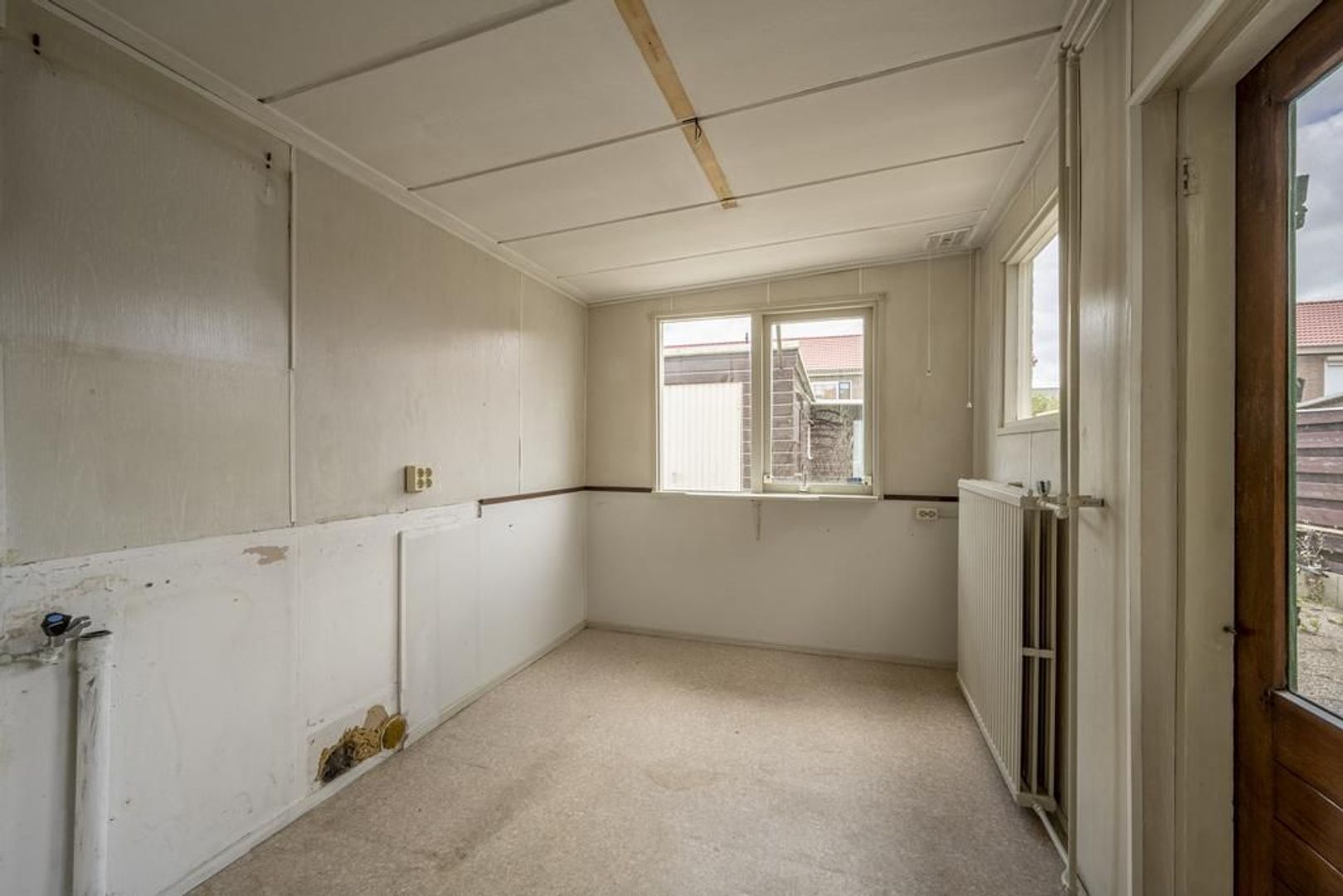 Doorzon woonkamer en de keuken. Door het raam in de zijgevel is dit een fijne, lichte ruimte. Vanuit de keuken is de bijkeuken te bereiken. Hier is de aansluiting voor de wasapparatuur.