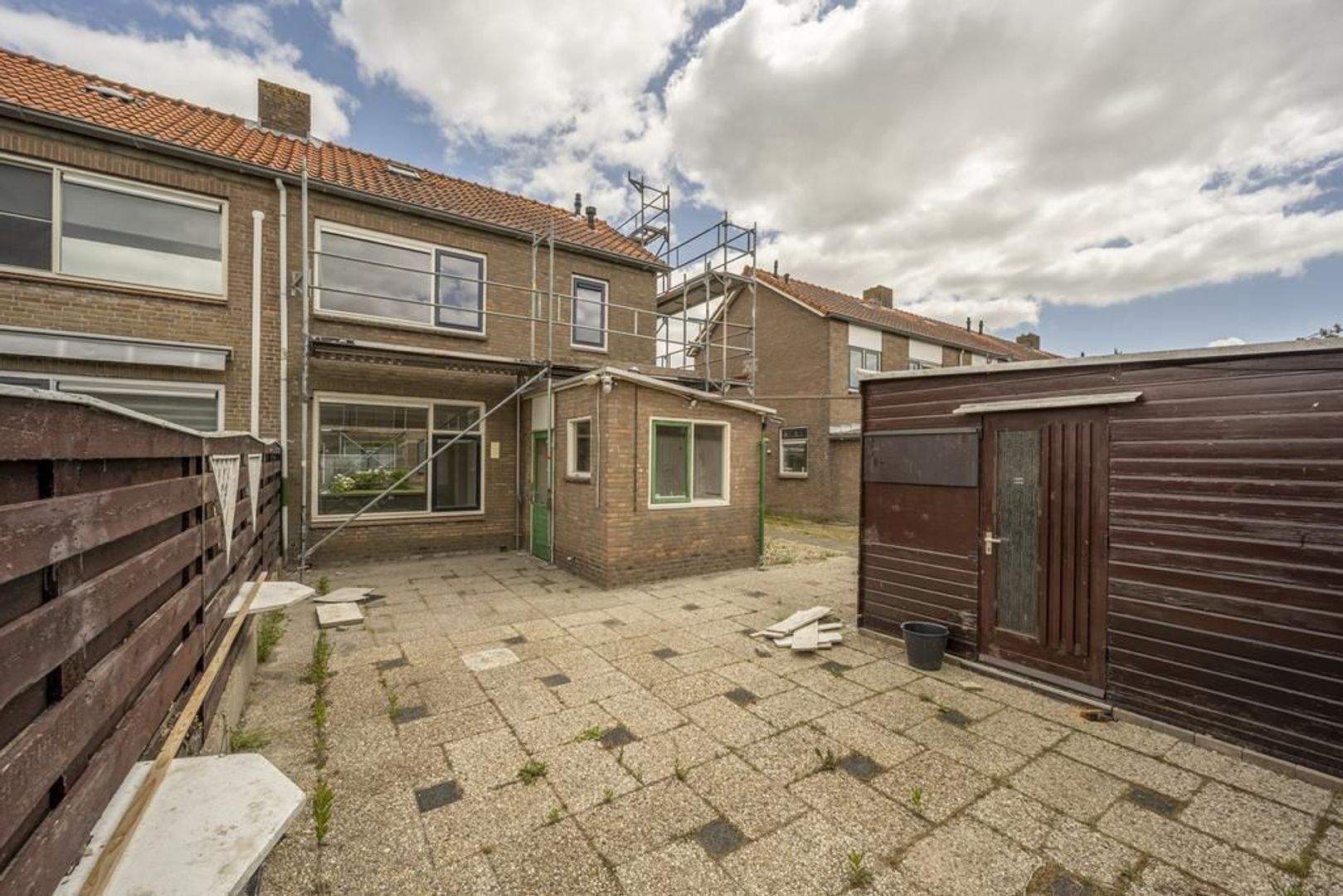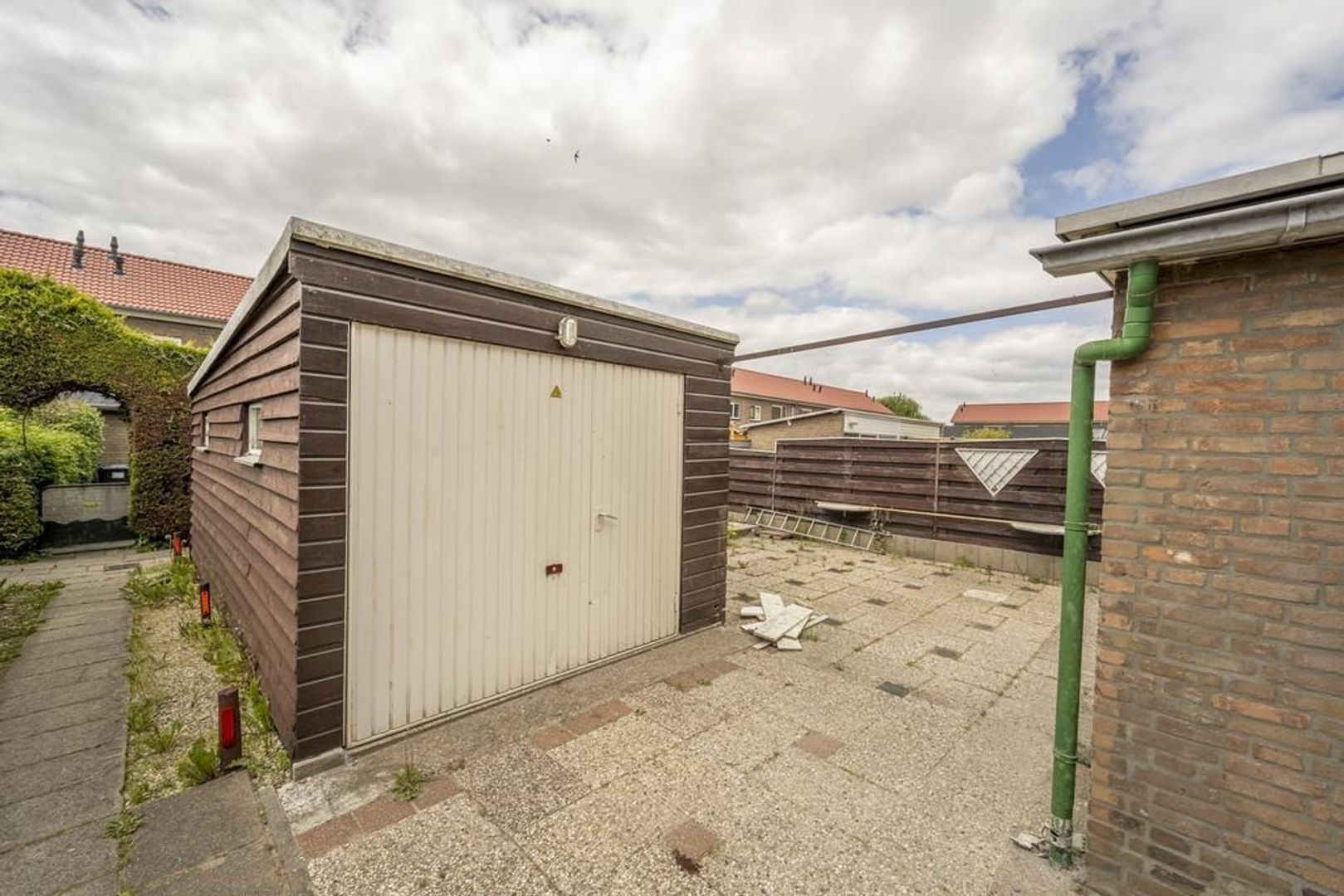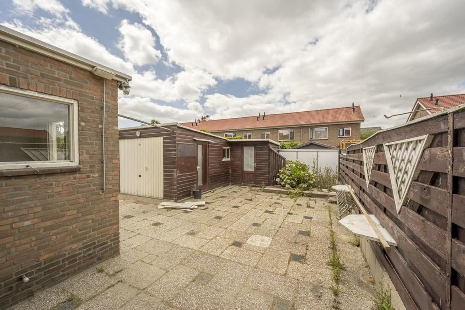 De achtertuin ligt op het westen. Hierin staan een garage met een stalen kanteldeur en een berging.