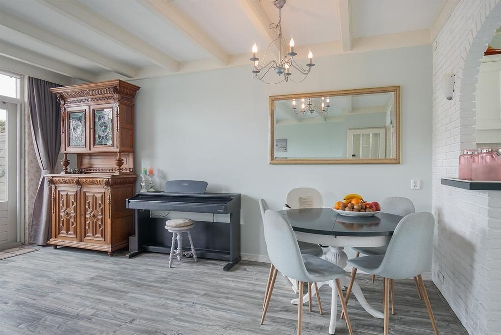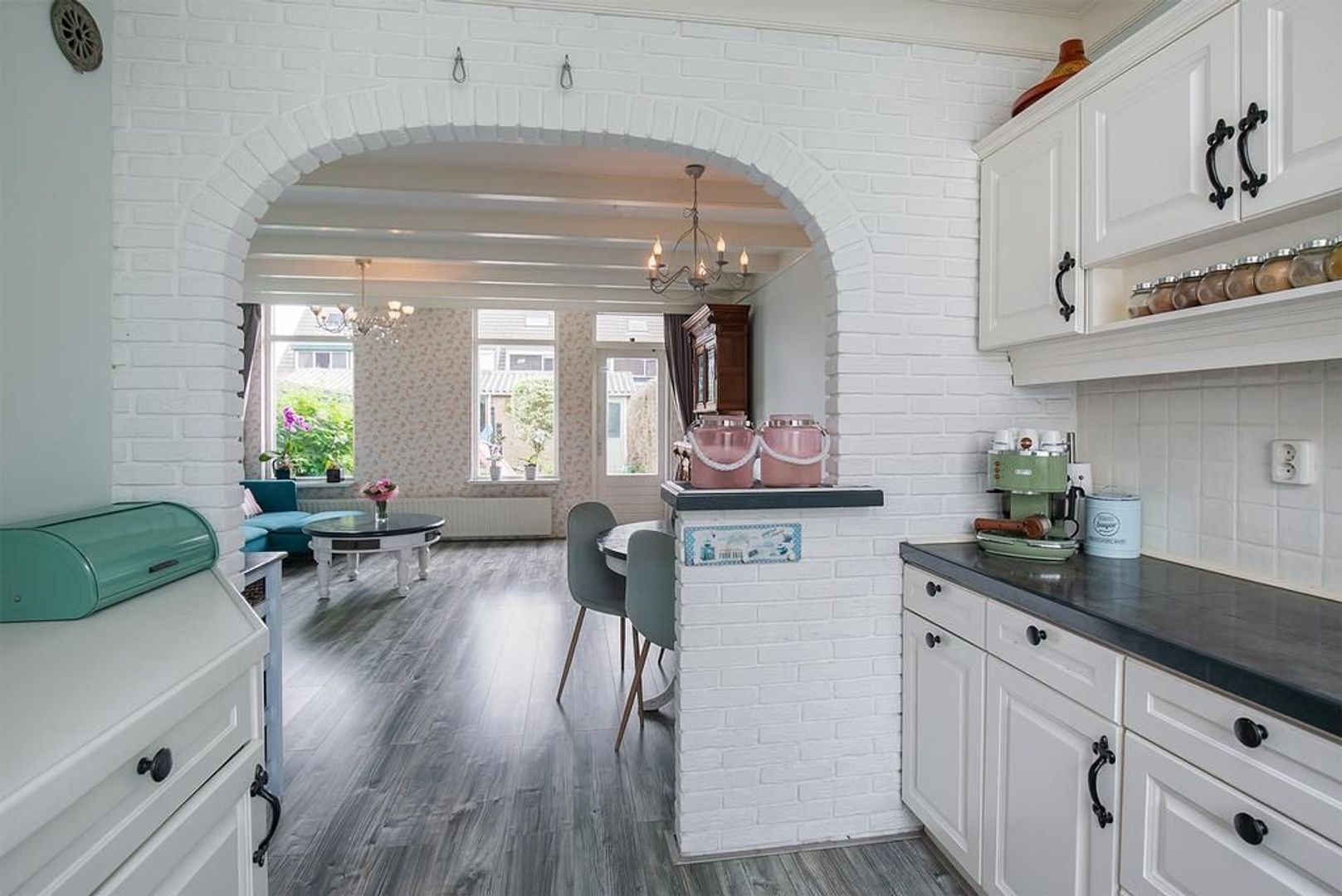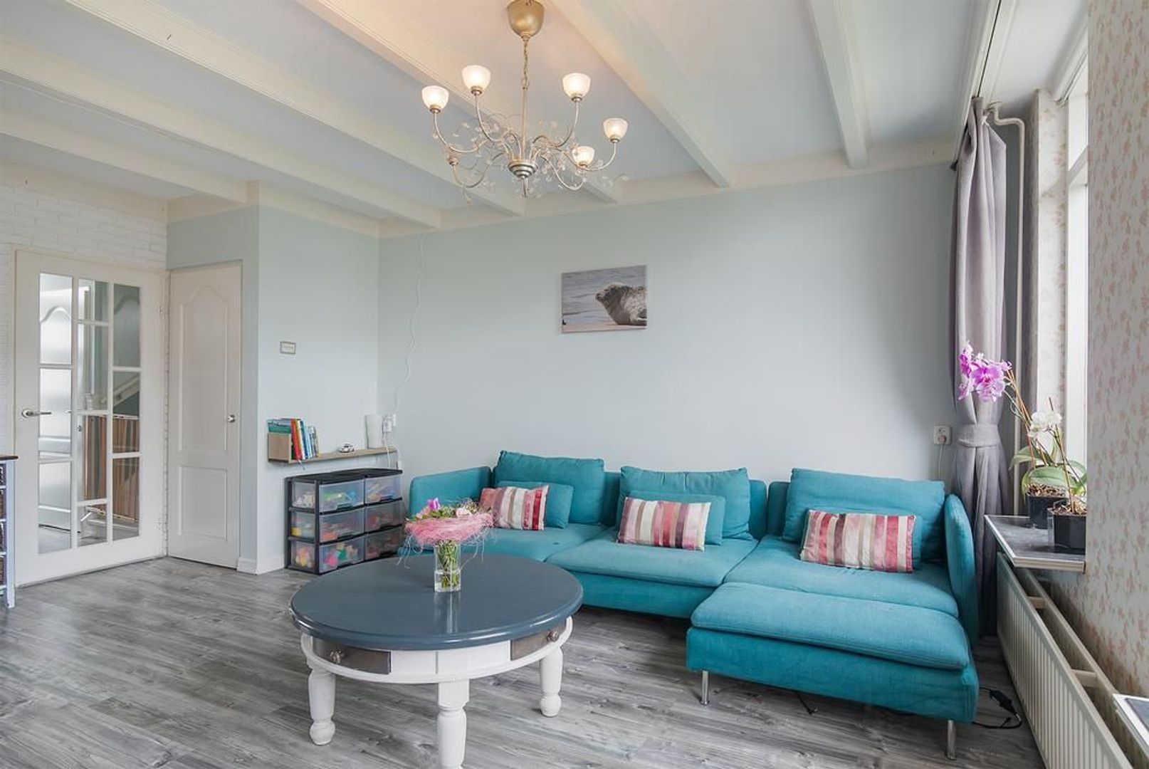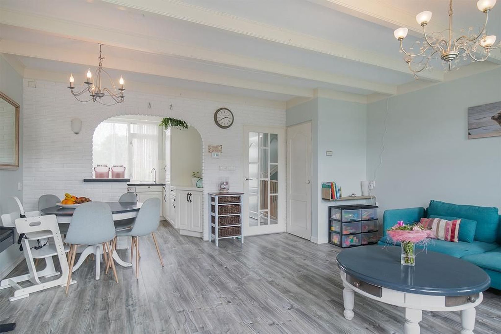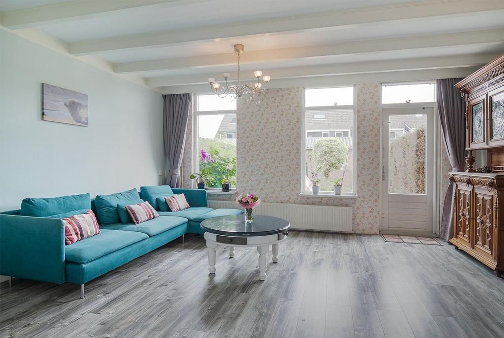 Lichte tuingerichte woonkamer met laminaat (2014) en deur naar de achtertuin.