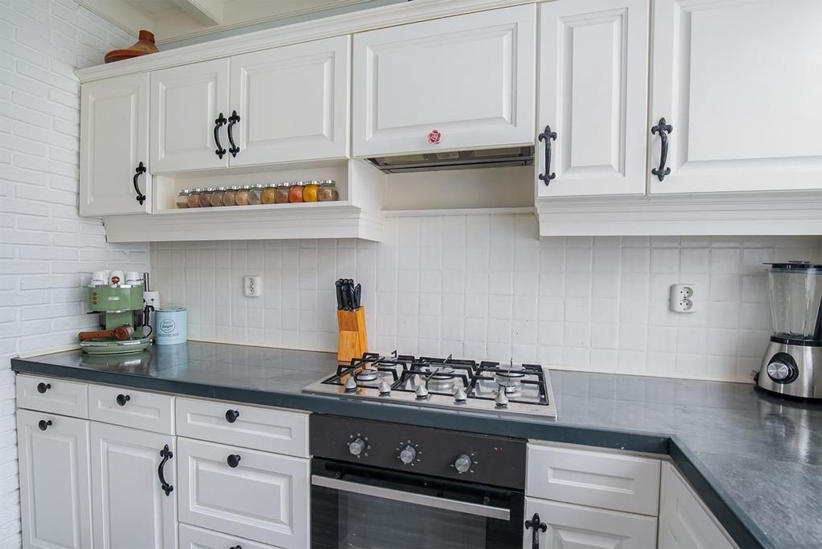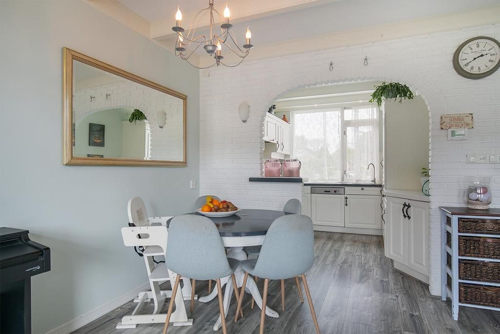Een grote toog verbindt de woonkamer met de open keuken. Deze is gesitueerd aan de voorkant en heeft een oudere U vormige inrichting en is uitgevoerd met een 5-pits gaskookplaat, afzuigkap, koel/vriescombinatie en een vaatwasser.