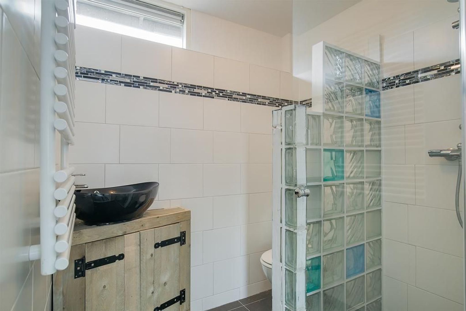De badkamer is dit jaar gemoderniseerd. Er is een douchegelegenheid, een wandcloset, een fraai wastafelmeubel en een designradiator.