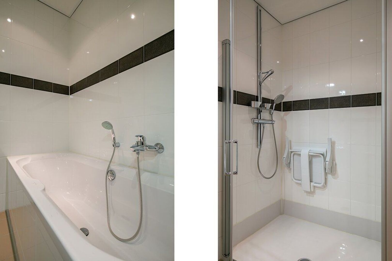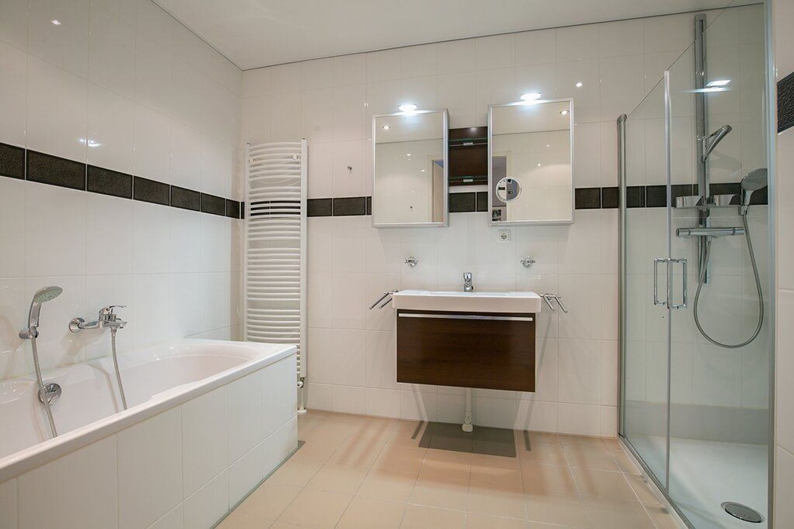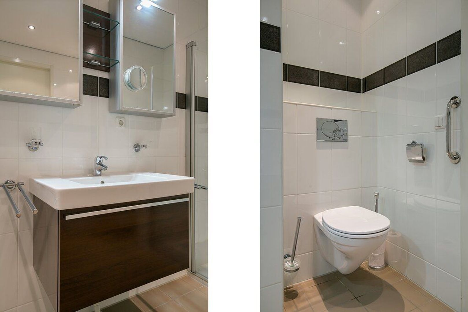 De badkamer en toiletruimte zijn modern. De badkamer is ingericht met een ruime inloopdouche (1.40 x 0.85), duo ligbad, wandcloset en een wastafelmeubel en is volledig betegeld.