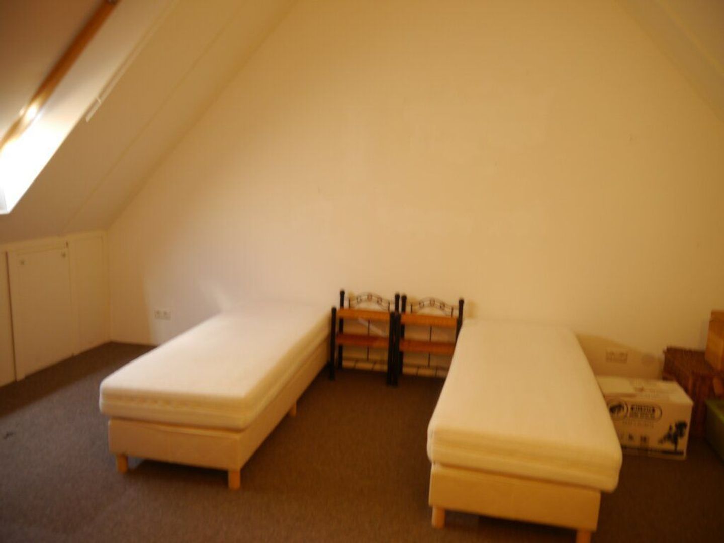 Verdieping: overloop met opstelplaats van de cv-ketel en mechanische ventilatie. Bijzonder ruime slaapkamer met groot dakraam en bergruimte achter de knieschotten.
