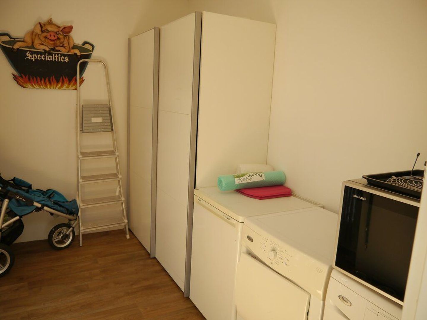 Achter de keuken is een praktische bijkeuken/inpandige berging, met o.a. de aansluitingen voor de wasapparatuur en een deur naar de tuin.