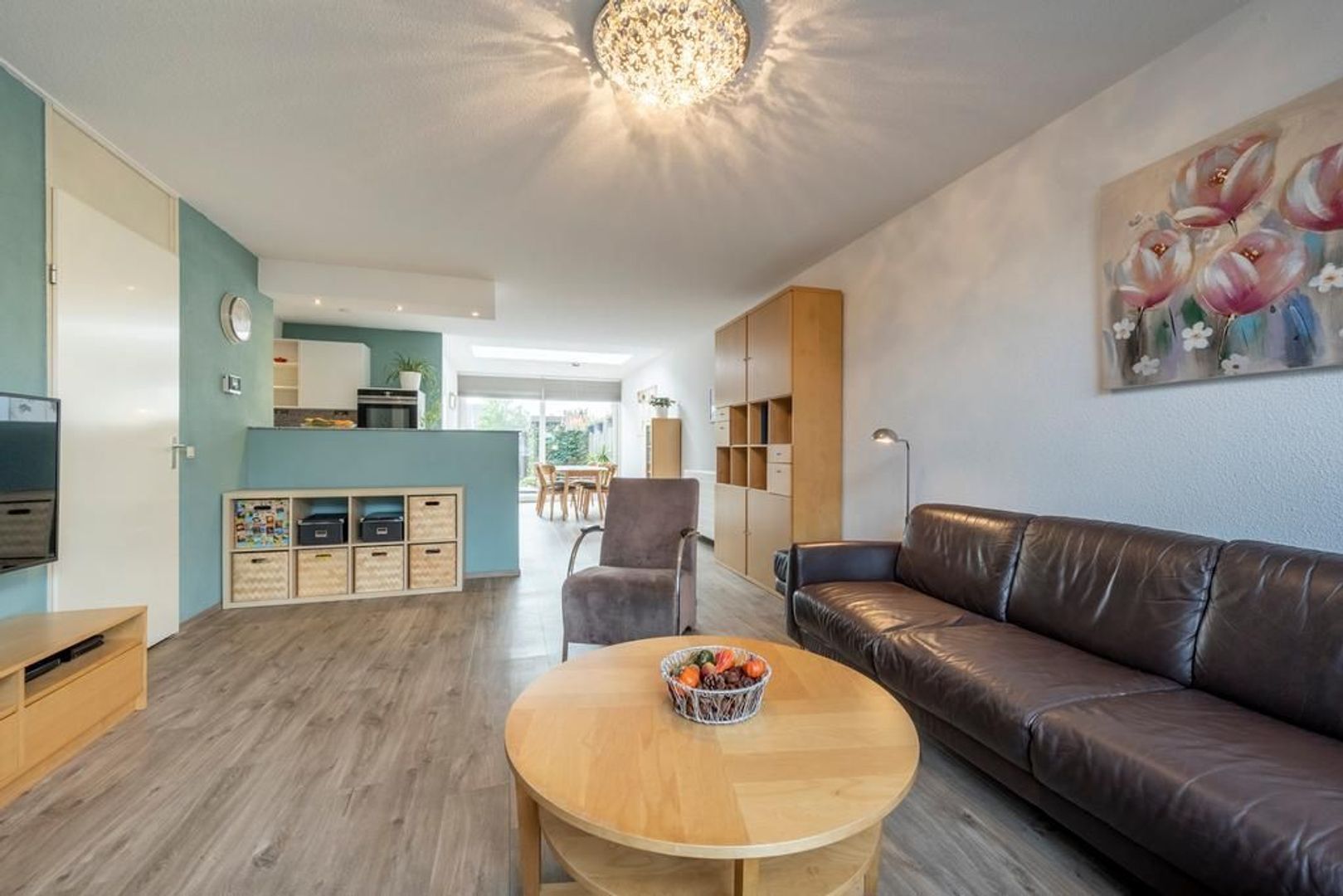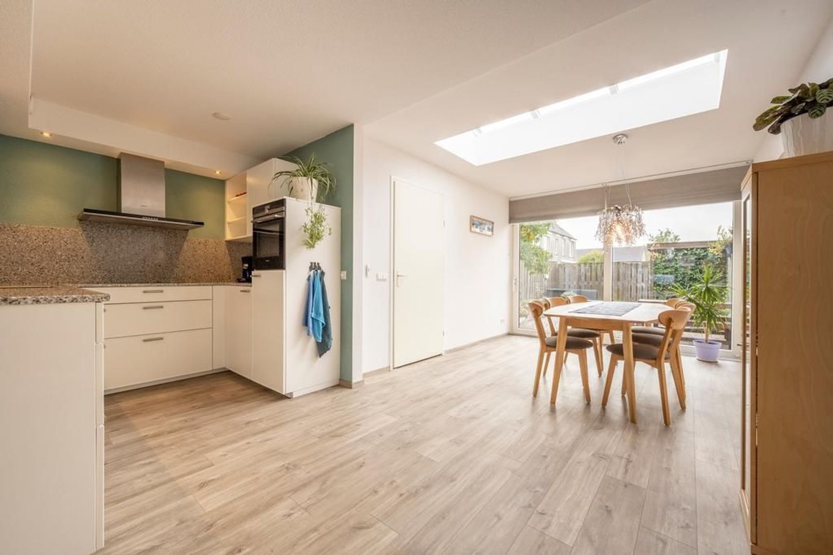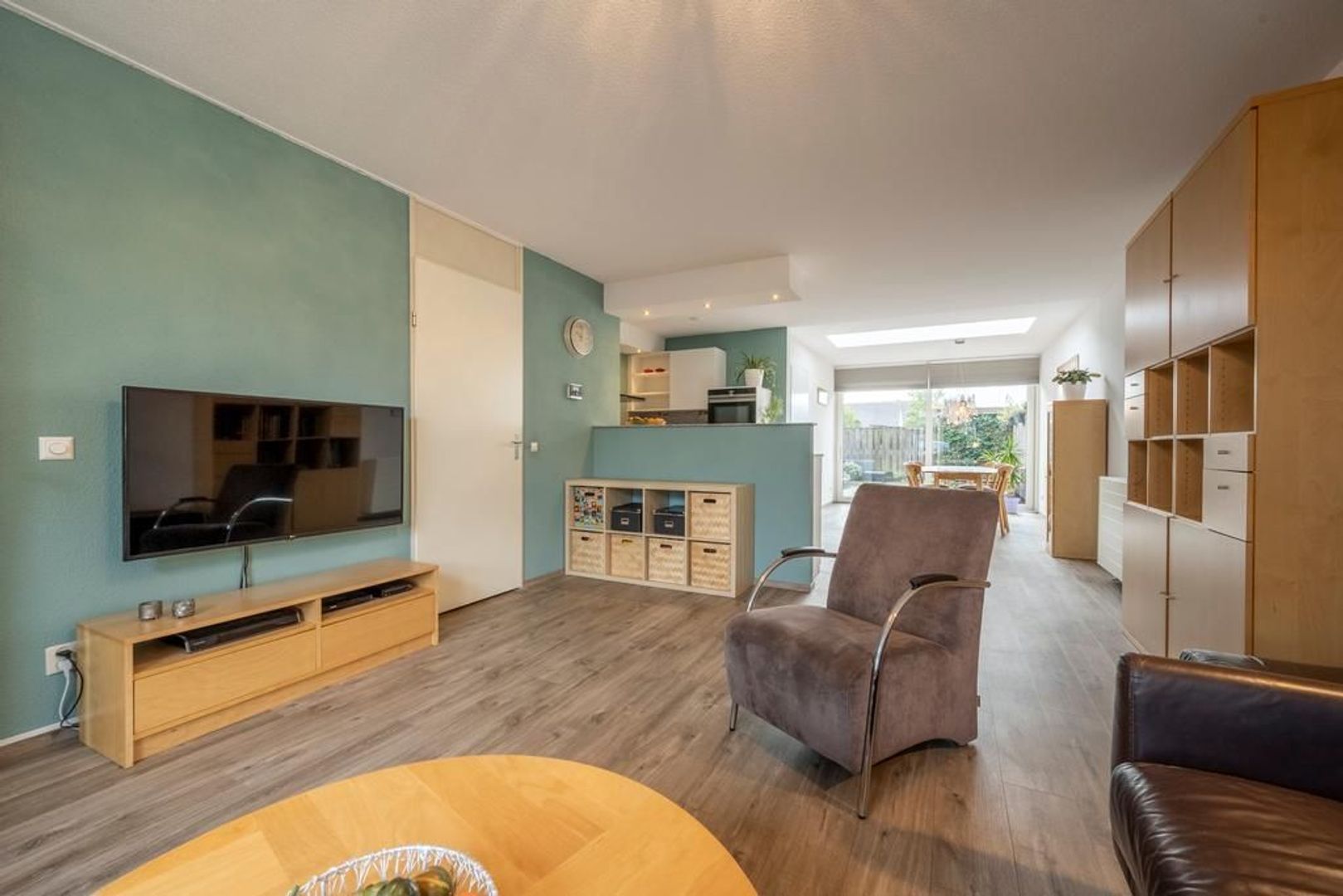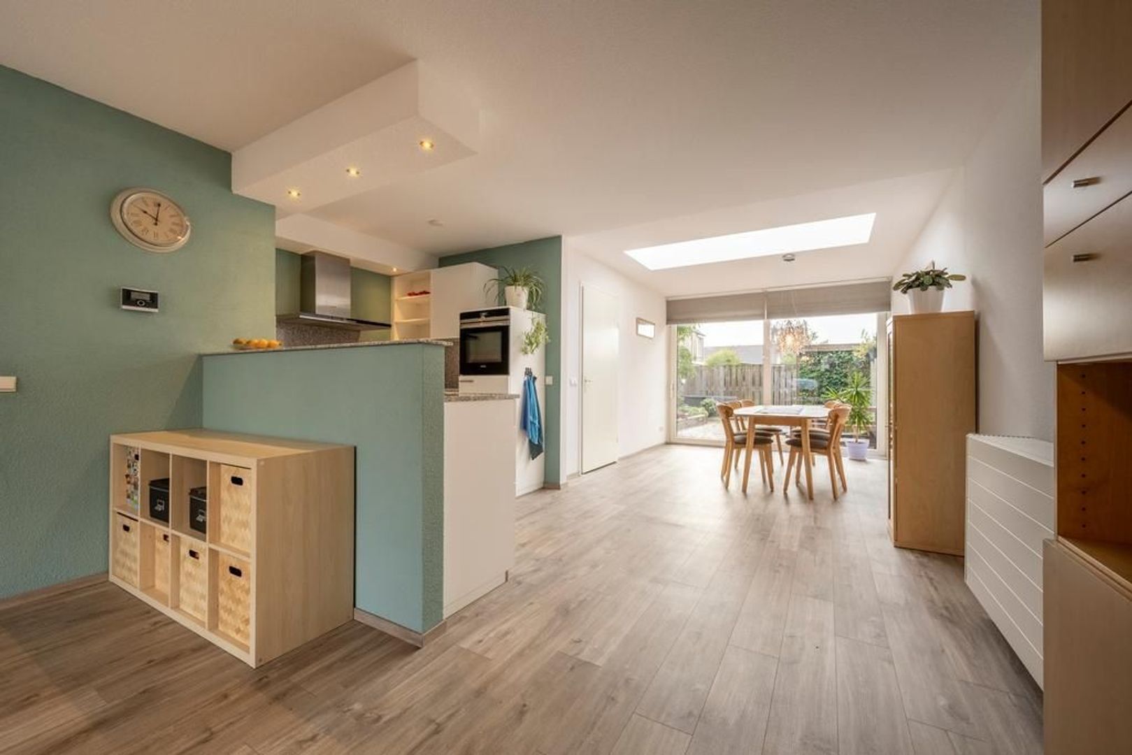 Leefruimte met zitgedeelte aan de straatkant, open keuken in het centrum en eetgedeelte met schuifpui aan de tuinkant. De inpandige berging is bijzonder handig.