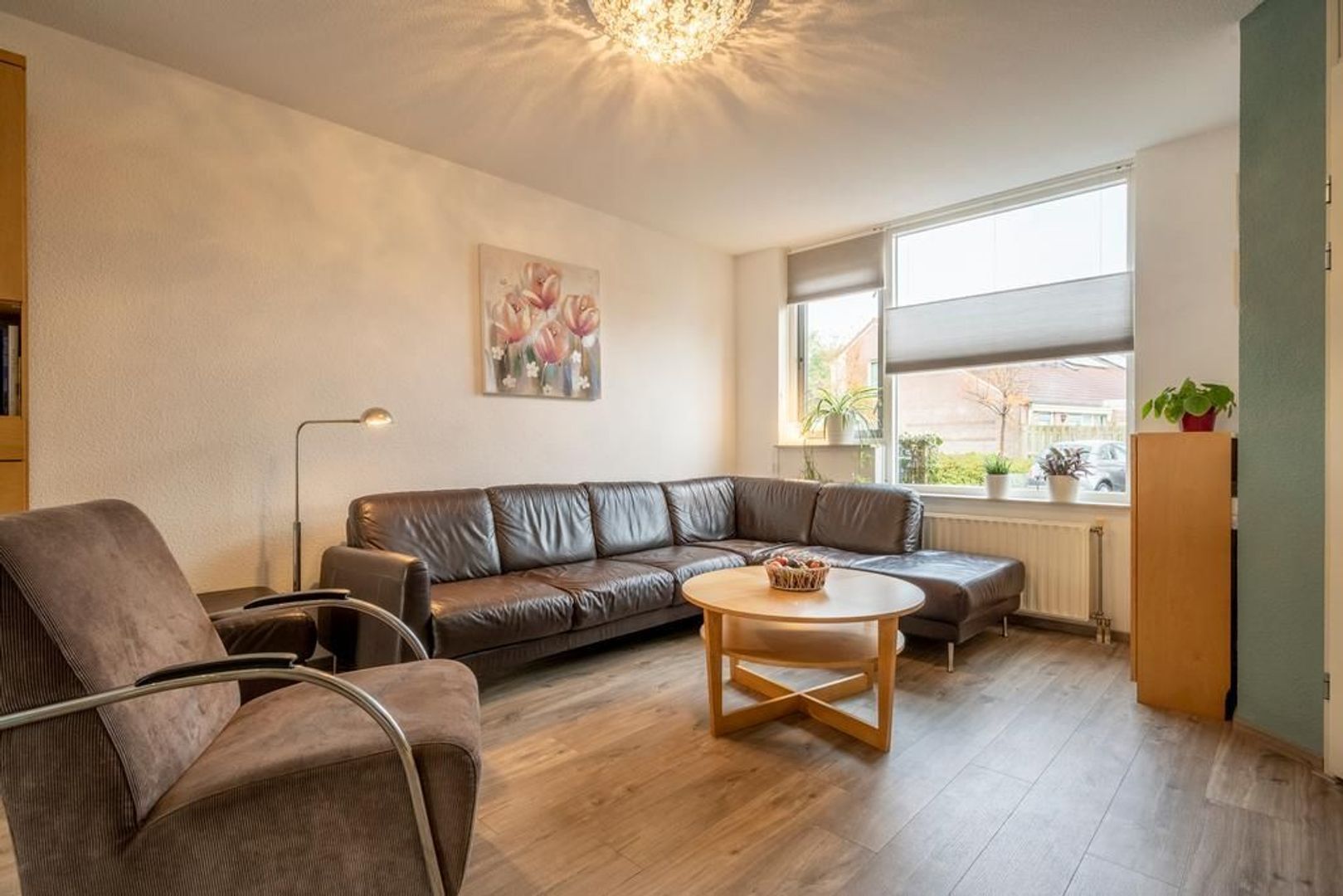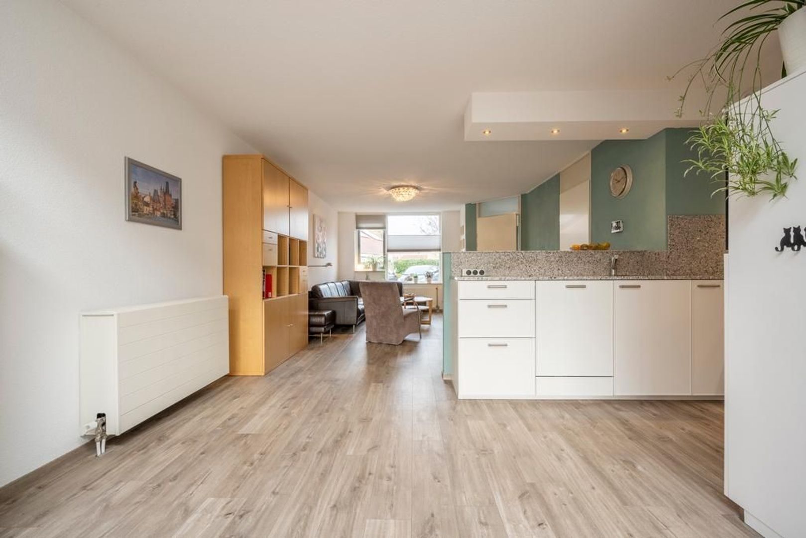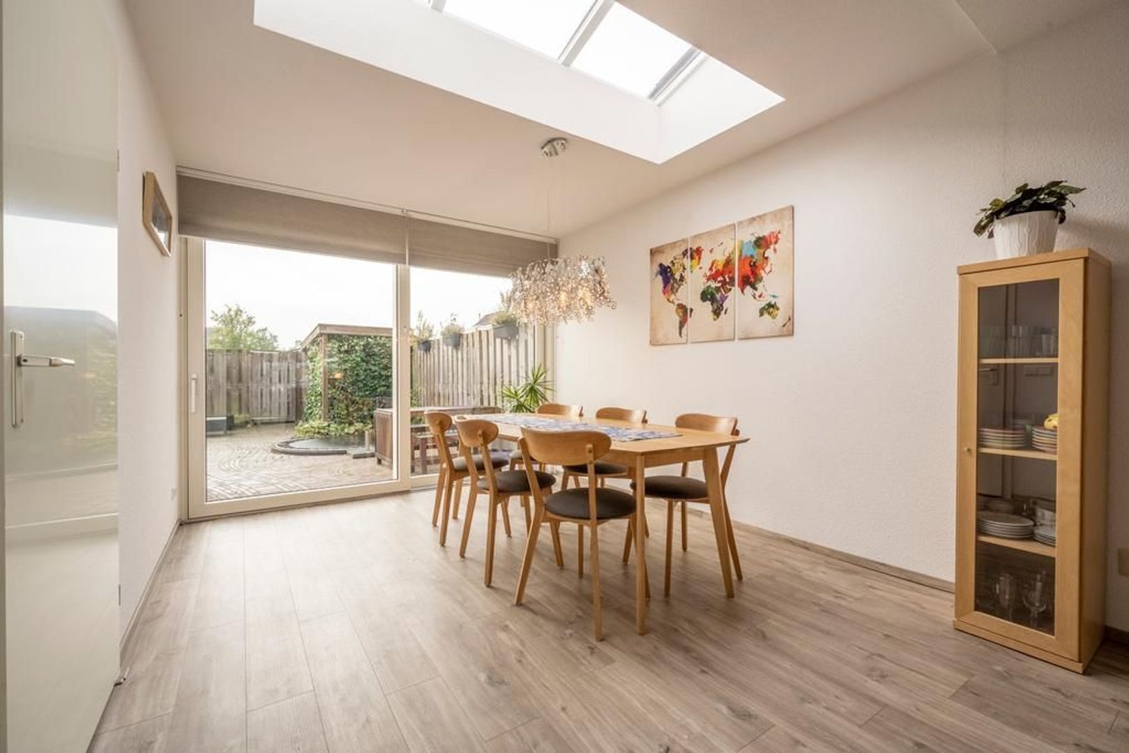 Leefruimte met zitgedeelte aan de straatkant, open keuken in het centrum en eetgedeelte met schuifpui aan de tuinkant. De inpandige berging is bijzonder handig.
