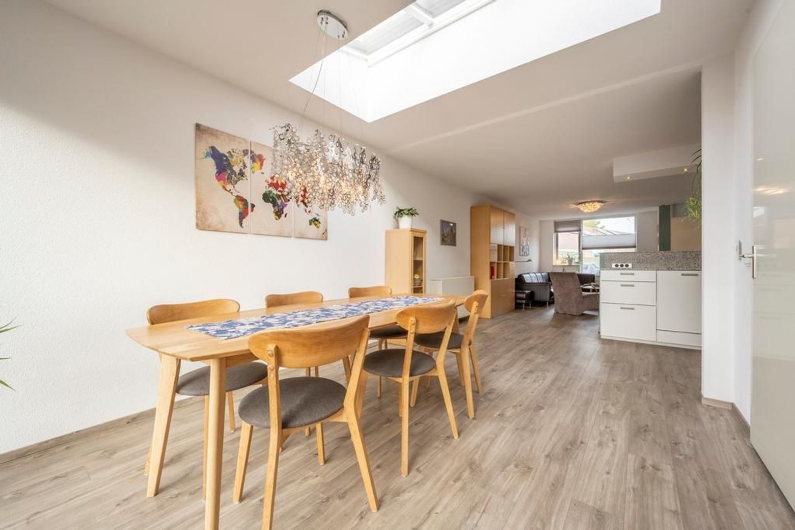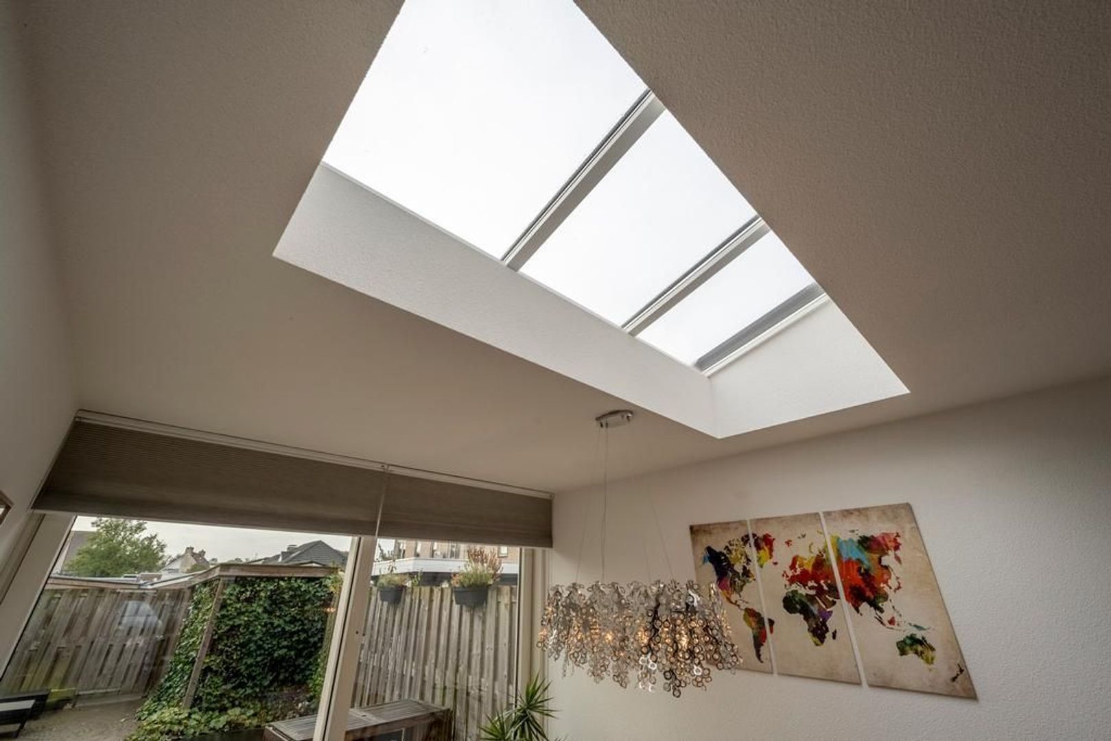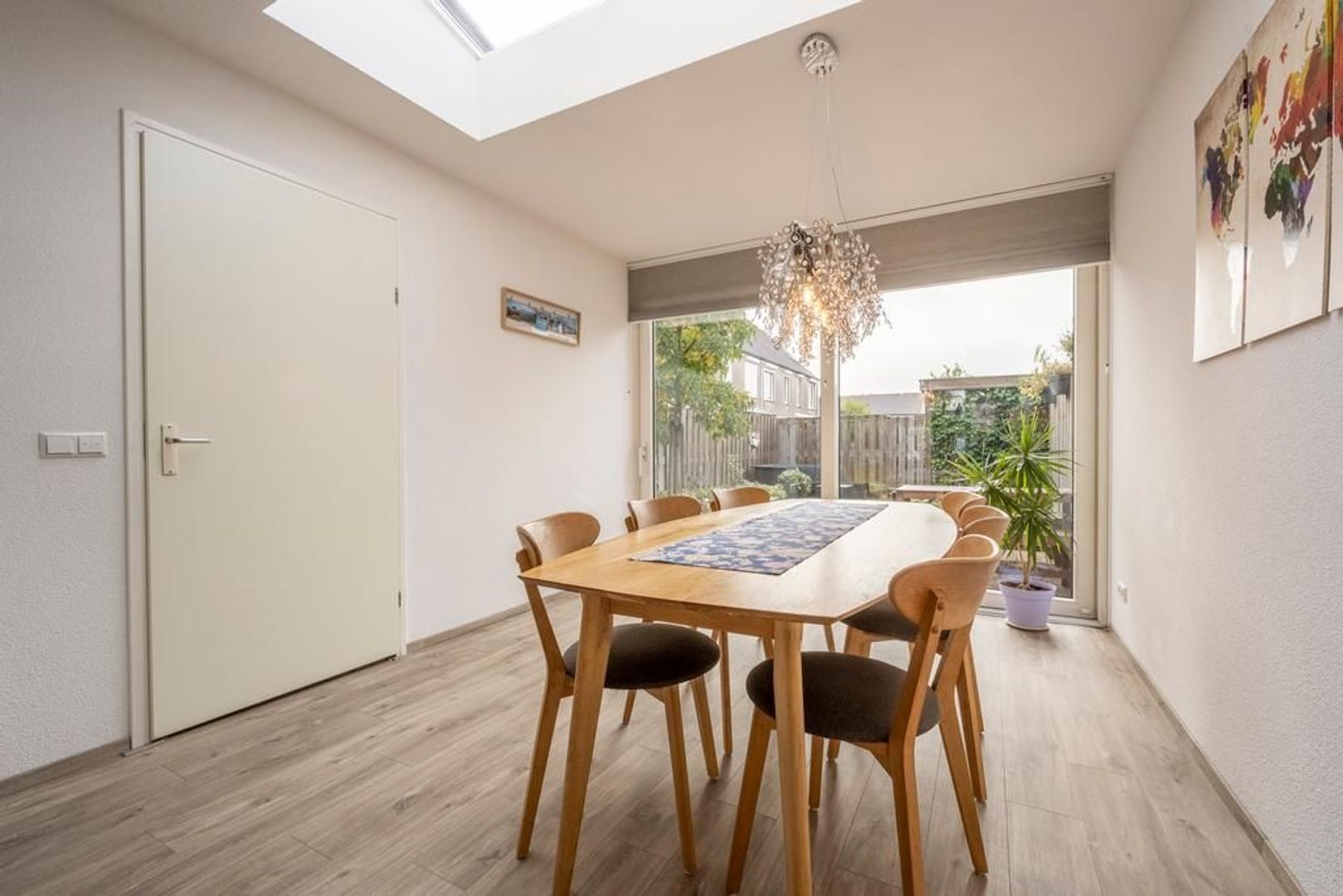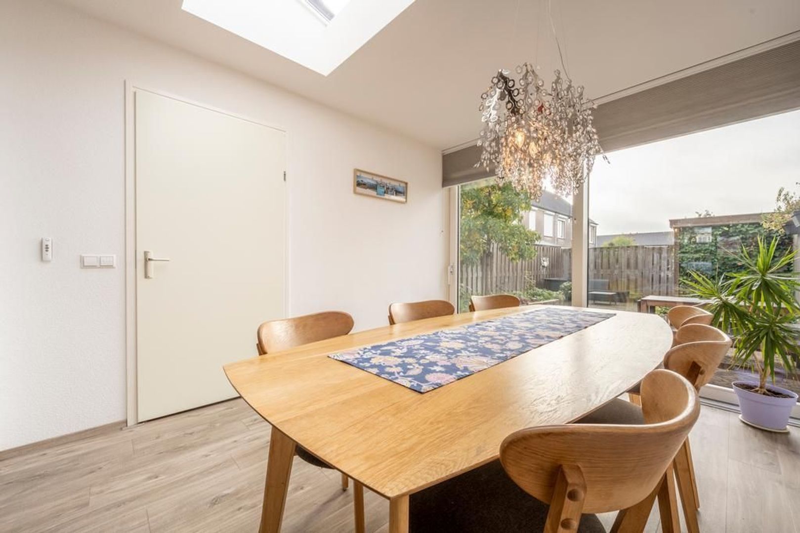 Leefruimte met zitgedeelte aan de straatkant, open keuken in het centrum en eetgedeelte met schuifpui aan de tuinkant. De inpandige berging is bijzonder handig.