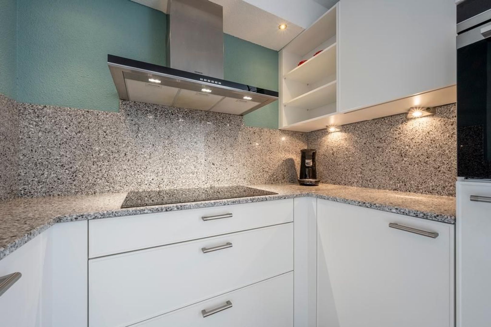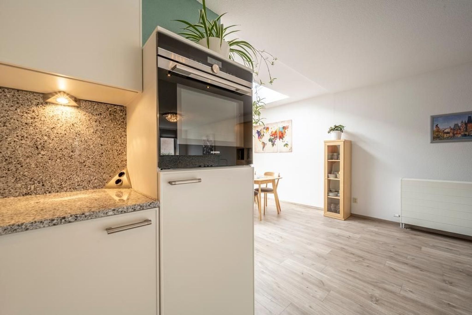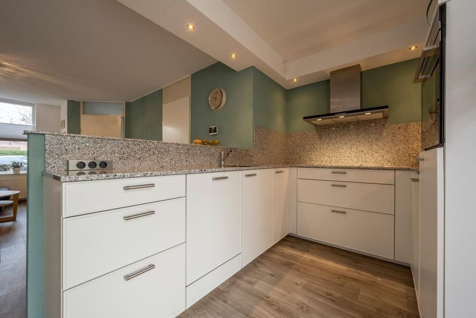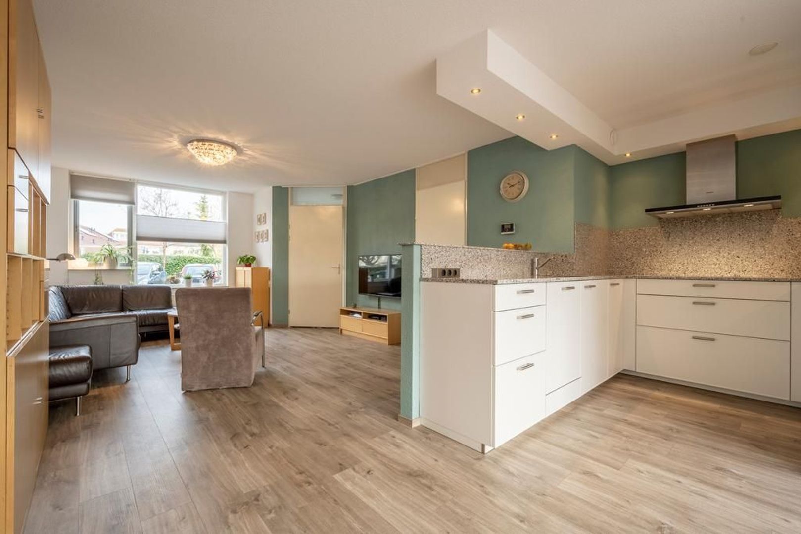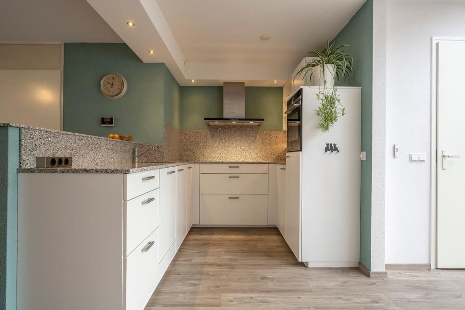 De keuken is in 2016 geplaatst en is opgesteld in een U-vorm en voorzien van een mooi composiet aanrechtblad en de volgende inbouwapparatuur: combi-oven, koelkast, keramische kookplaat, vaatwasser en afzuigkap.