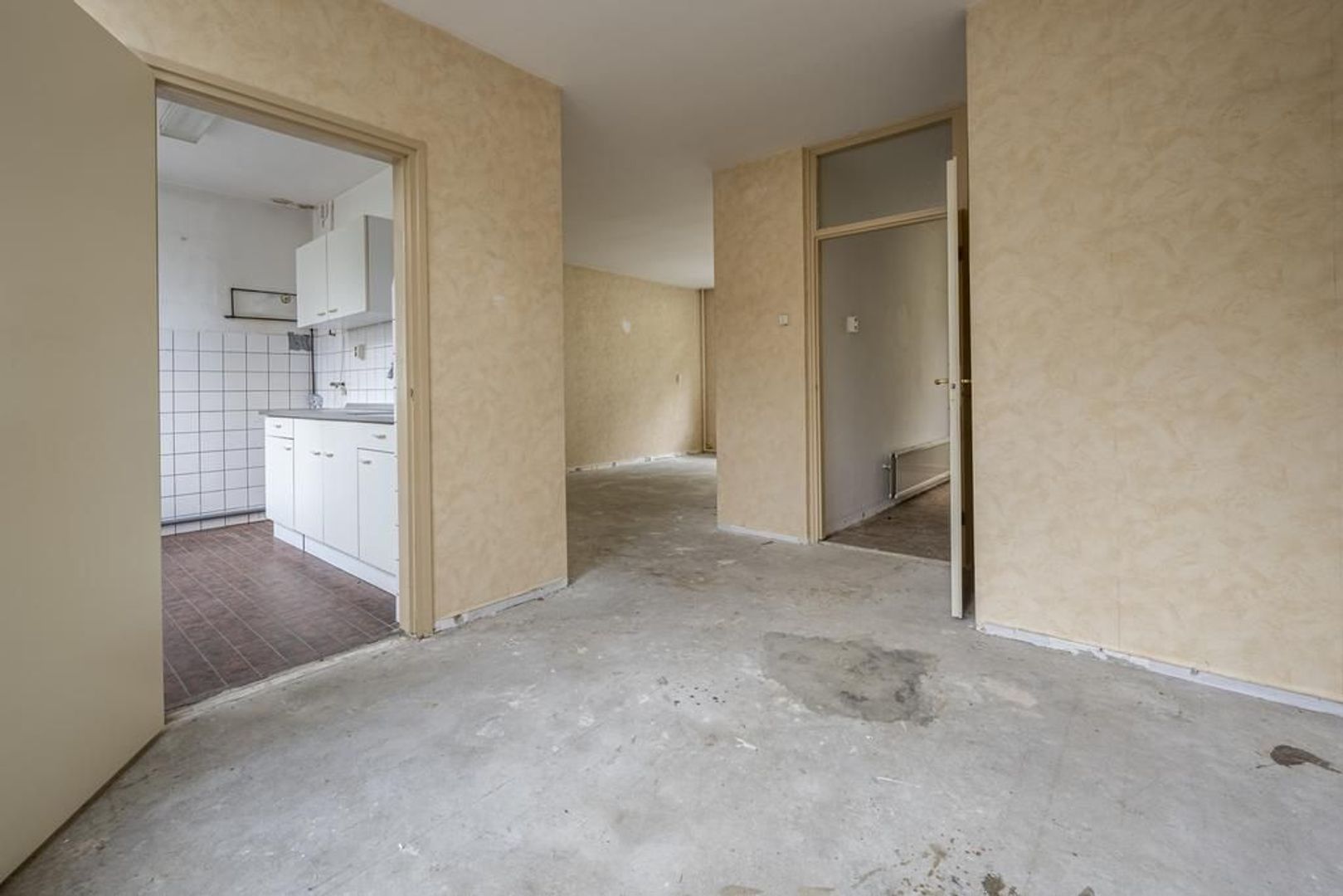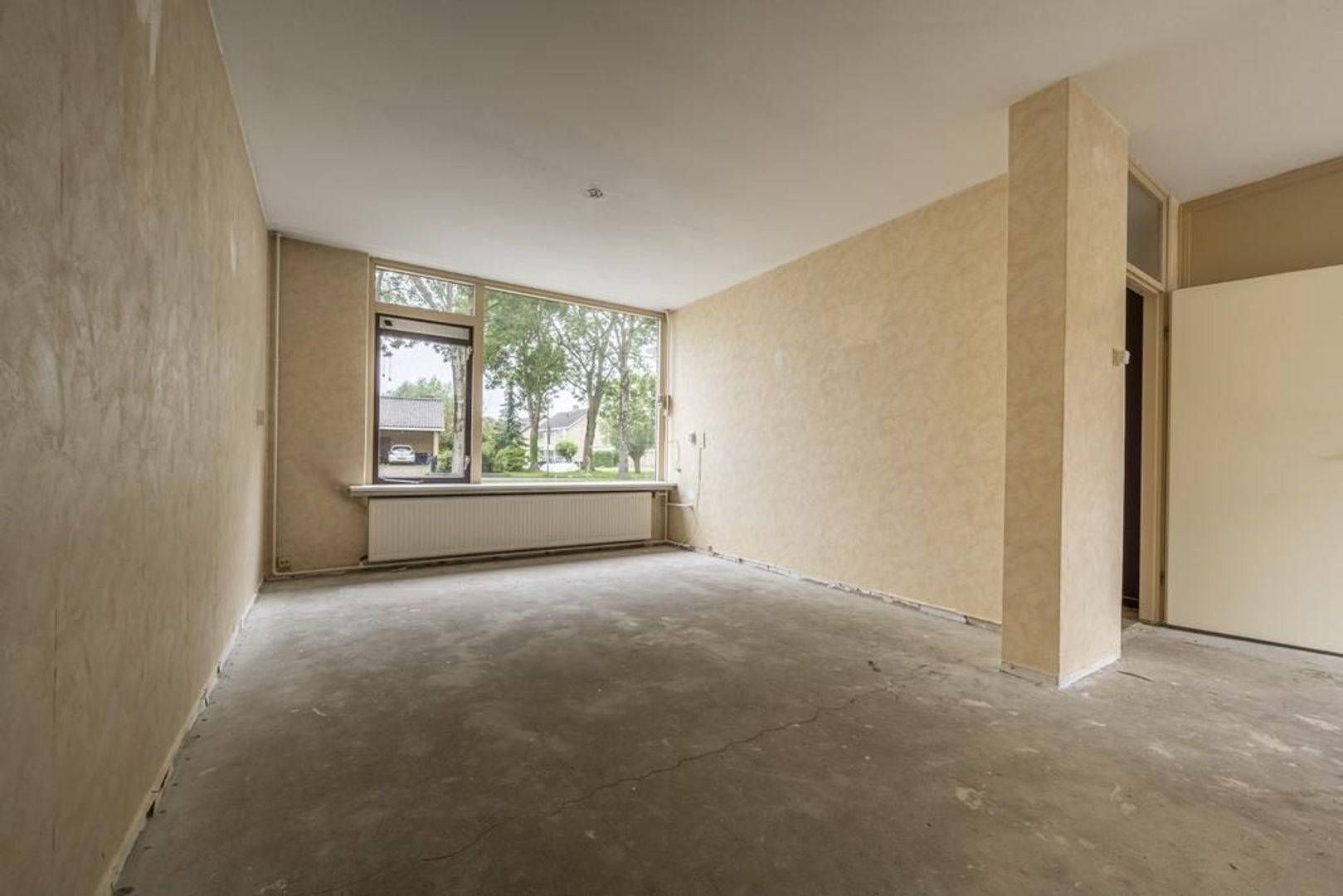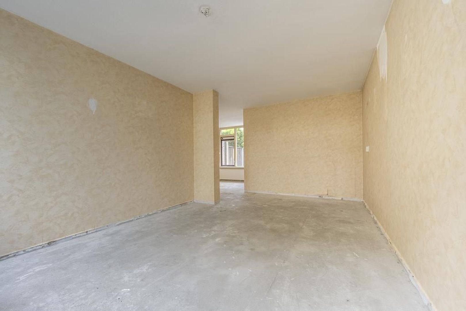 Z-vormige woonkamer met trapkast en toegang tot de keuken aan de tuinkant. Deze is uitgevoerd met een eenvoudige wandopstelling.