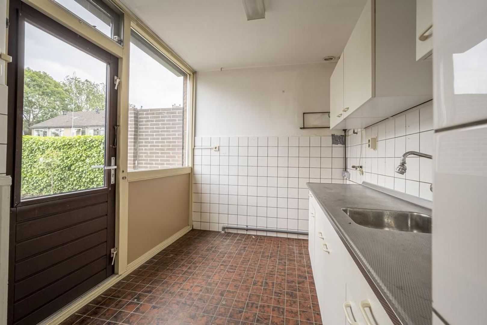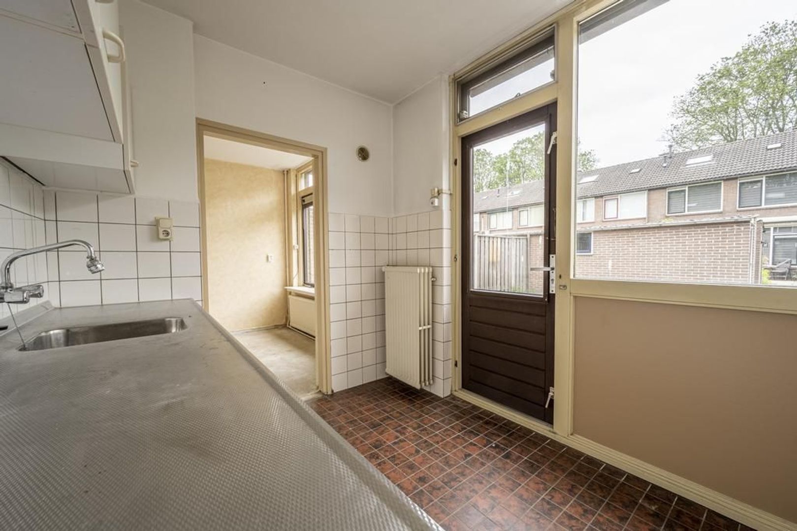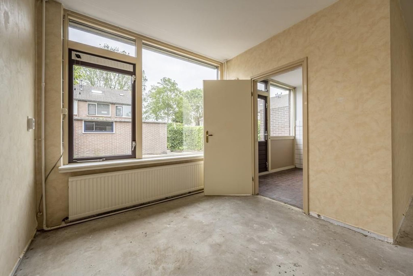 Z-vormige woonkamer met trapkast en toegang tot de keuken aan de tuinkant. Deze is uitgevoerd met een eenvoudige wandopstelling.